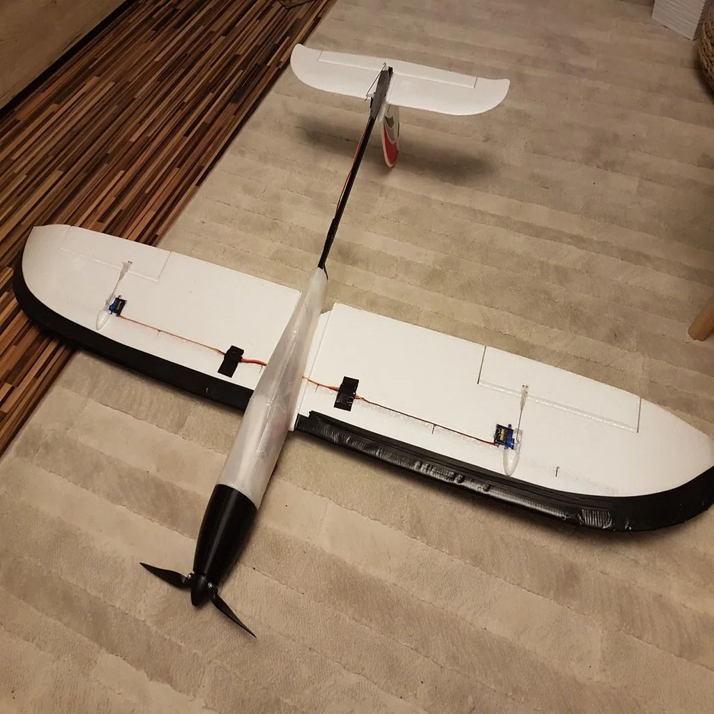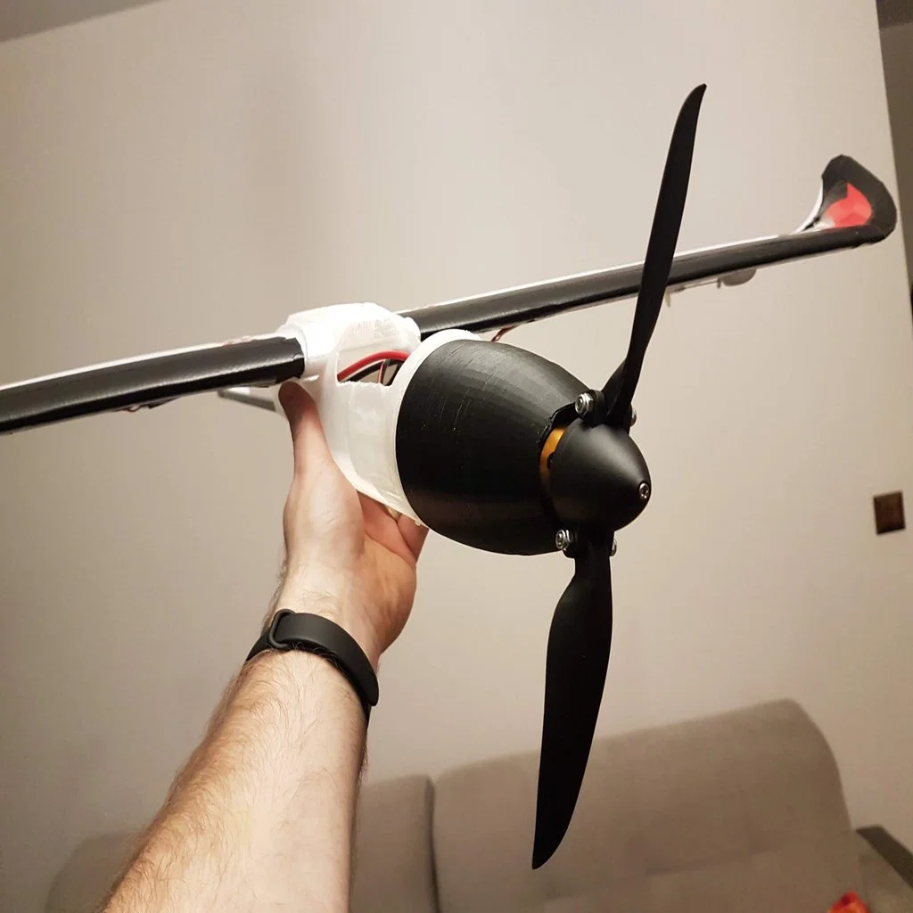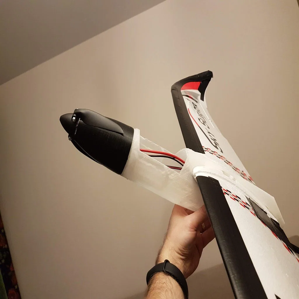 Phần mũi (nose) được in bằng filament TPU để tăng khả năng hấp thụ va đập khi máy bay rớt xuống đất. Tuy vậy hình học vẫn đủ cứng để giữ motor bên trong. Cánh quạt dùng loại folding nên lúc lượn sẽ không tạo lực cản thêm, đồng thời cũng ít bị quẹt xuống đất khi hạ cánh. Thân (fuselage) được in bằng Nylon PA 12 — vật liệu rất tốt cho độ cứng, nhẹ và bám lớp (layer adhesion) cao. Phía sau mình gắn thêm thanh carbon fiber dạng ống rỗng vuông. Máy bay hoàn thiện sẵn sàng bay nặng khoảng 700g.