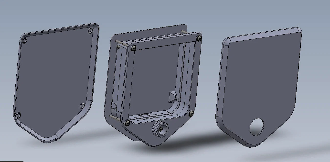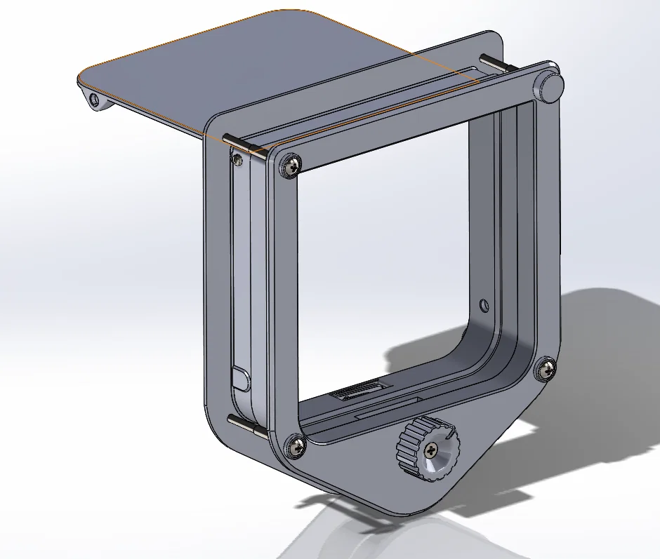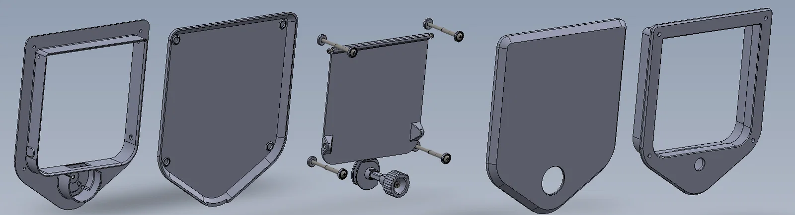 Mẫu cửa cho mèo với bản lề thiết kế cho cửa dày 40–45 mm. Khuyến nghị in PET-G vì PLA có thể bị mềm và biến dạng khi phơi nắng. Danh sách phần cứng gồm bu lông M3/M4, nam châm D6x3 và Connector Insert.