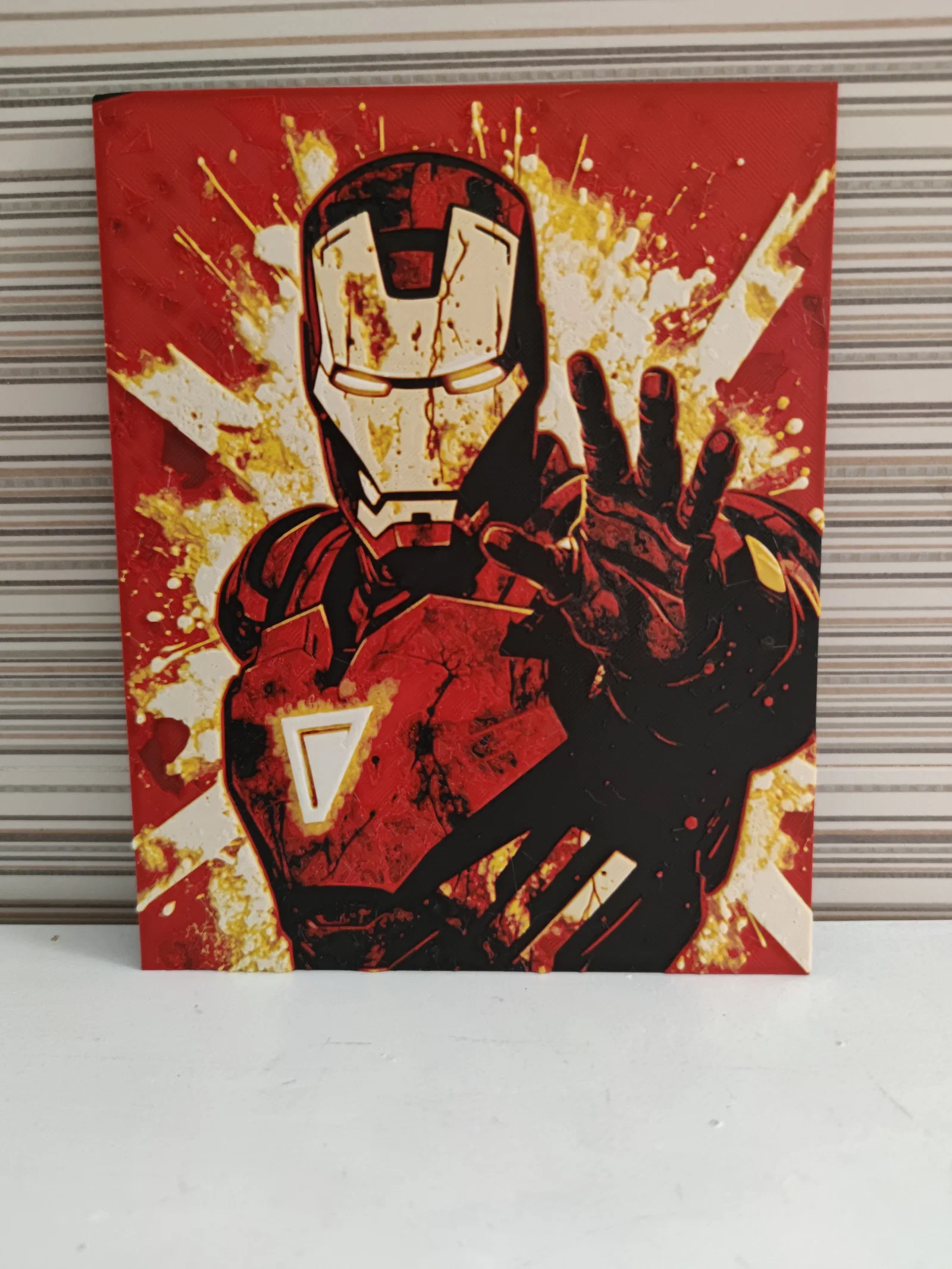 Mẫu Hueforge Iron Man dạng tranh 2D trang trí. In infill 100% với layer height 0.08mm (base 0.16mm) và đổi màu theo mốc layer: Black → rojo → yellow → White để ra hiệu ứng Hueforge đúng chuẩn.