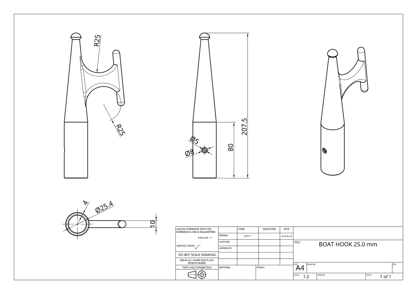 Móc kéo thuyền (Boat Hook) có sẵn các phiên bản 20mm, 25mm và 1". Model chừa dung sai 0.4mm để lồng vừa lên cây sào, nên sào 20mm sẽ có lỗ 20.4mm để gắn vào.