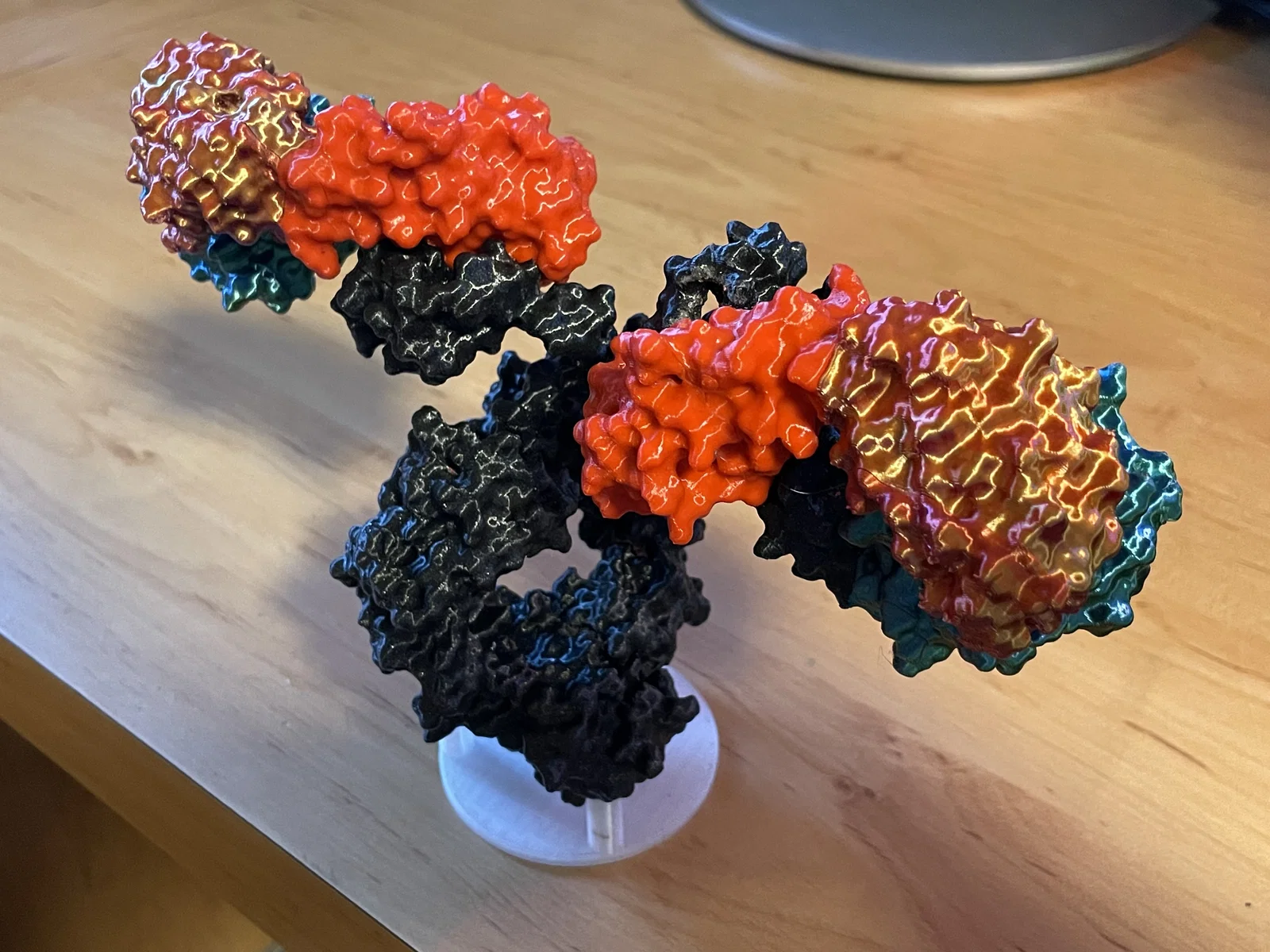 Mẫu 3D kháng thể đơn dòng murine IgG2a. Có 3 biến thể: một màu, hai màu tách heavy/light chain, và nhiều màu tách vùng variable. Khuyến nghị in kèm organic supports; có file 3mf kèm setting/supports.