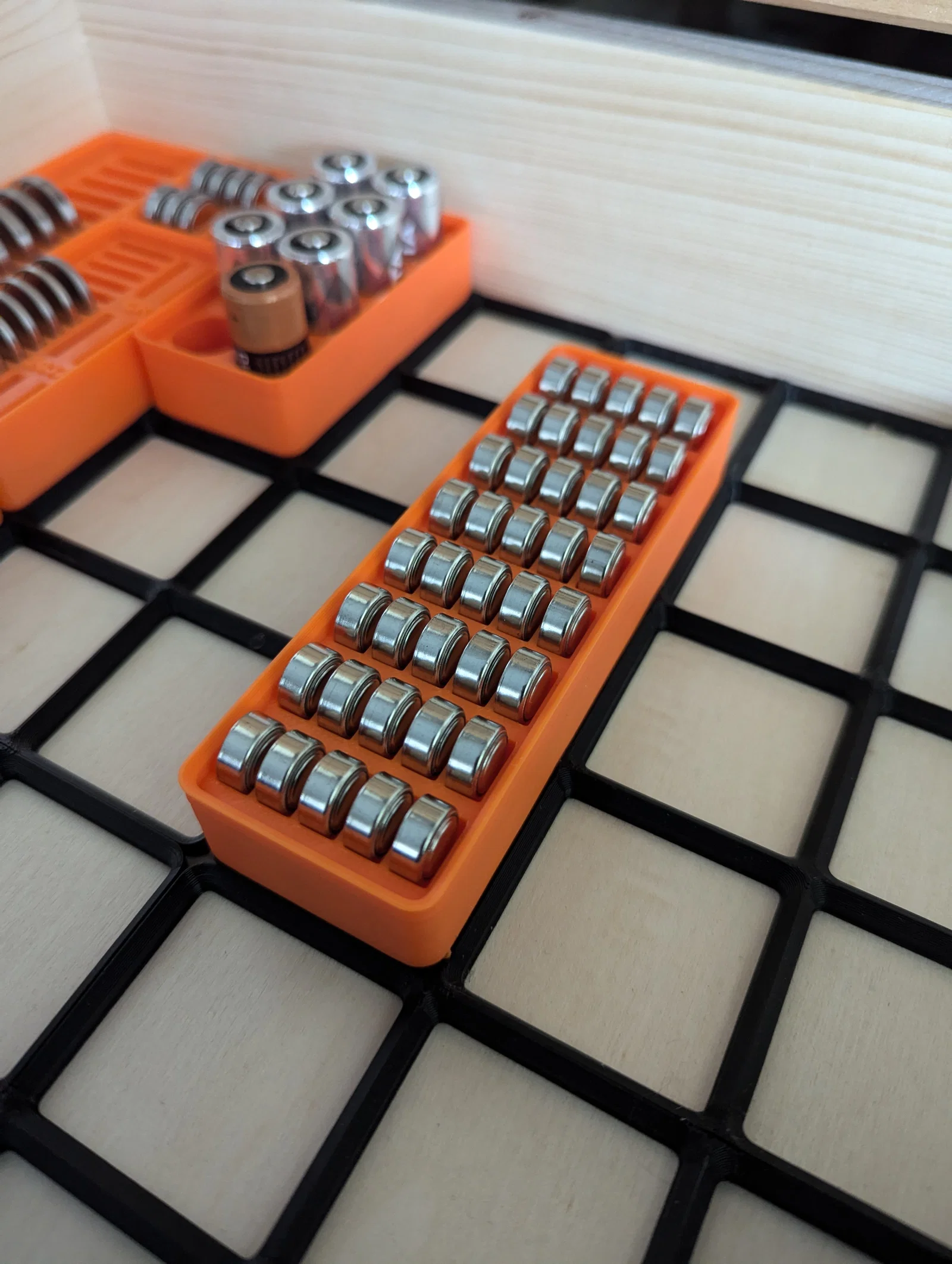 Dựa trên mẫu block, mình thiết kế thêm vài khay giữ pin Gridfinity mà mình tìm hoài không thấy trên mạng (ít nhất là kiểu sắp xếp dày/khít như vầy).