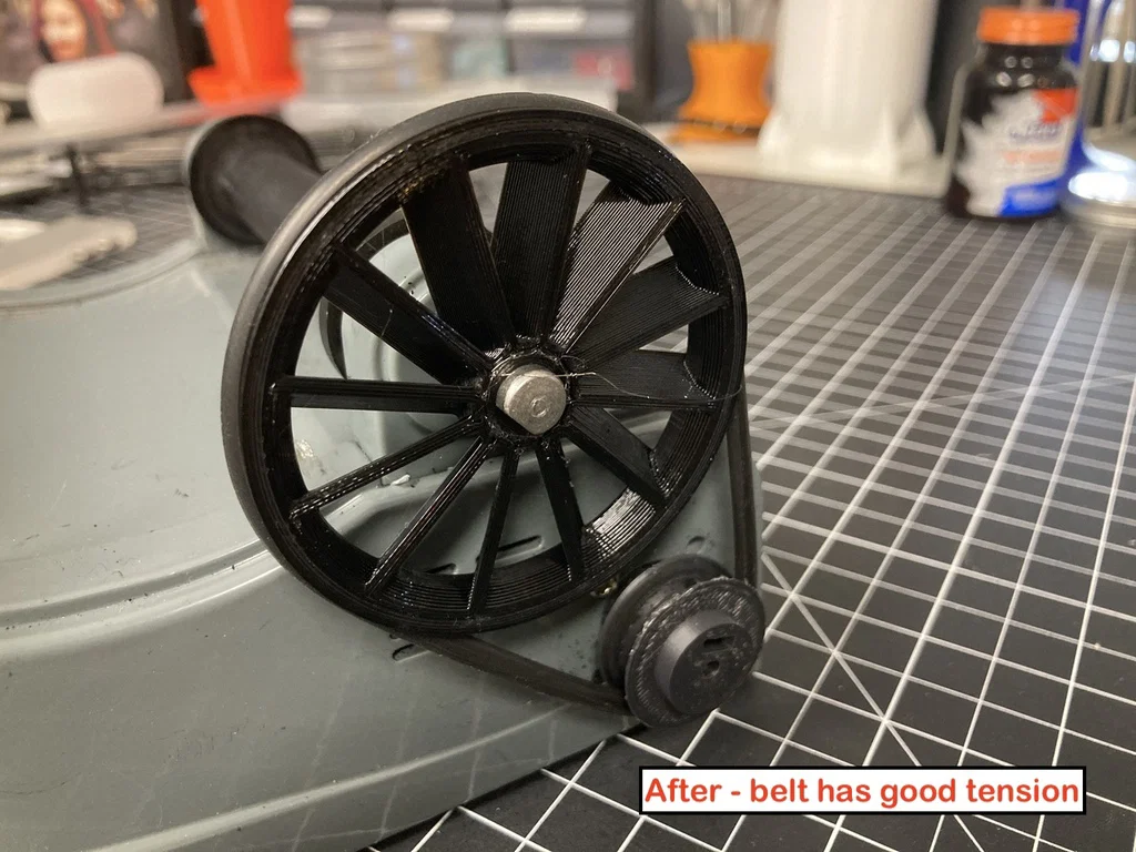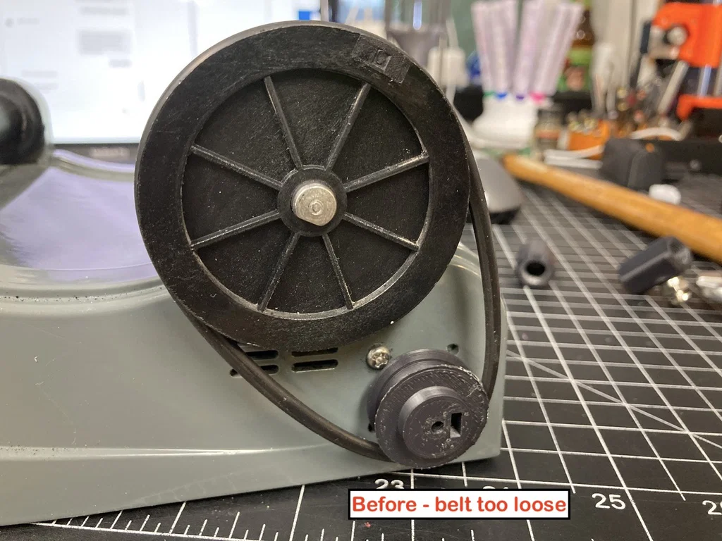 Độ căng dây belt zin bị quá thấp nên hay bị trượt, làm máy mài đá mài nát luôn bánh puly nhỏ zin. Thay bánh puly nhỏ bằng bản của buffcleb thì đúng là đỡ hơn, nhưng vẫn còn lỏng. Mình dựng lại theo puly lớn nguyên bản nhưng tăng nhẹ đường kính (63mm thay vì 60mm) để ăn bớt độ rơ mà không siết quá căng, và giờ hoạt động ổn hơn nhiều. Lợi thêm là nhiều review nói máy NatGeo quay quá nhanh; puly này sẽ làm trống chậm lại khoảng 5%.