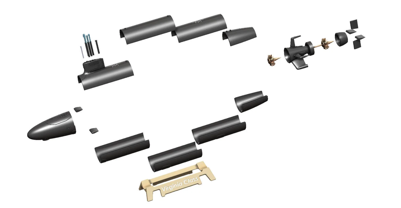 File mô hình tàu ngầm lớp Virginia nhập từ Thingiverse (thing:6315975, by hobbyman). Mẫu dài 1m, hỗ trợ RC. Có bản high-poly tải miễn phí và gói 27 file STL chi tiết để in, lắp điều khiển với cánh lặn, bánh lái, chân vịt quay.