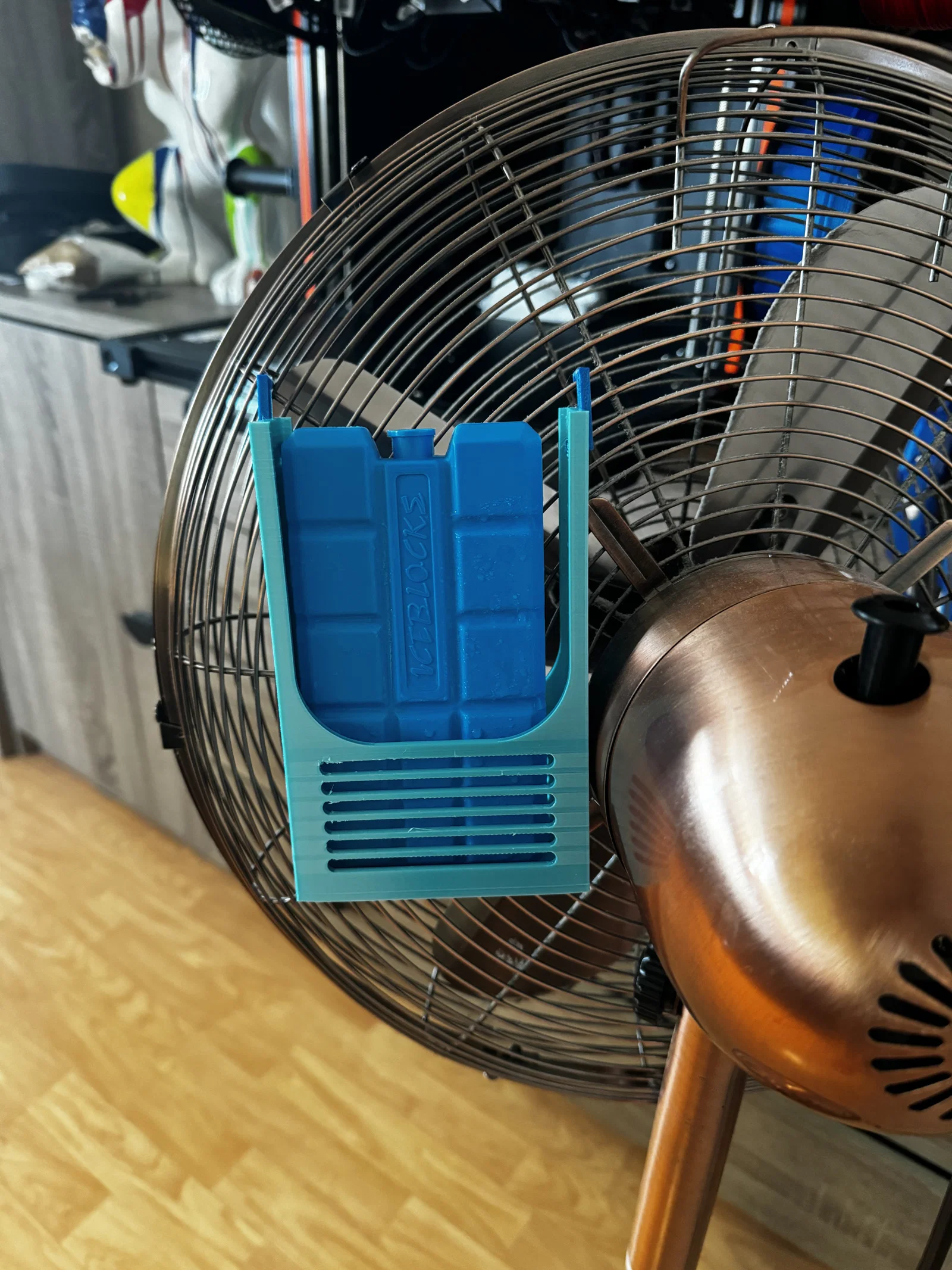 Giá đỡ pain de glace (đá gel) gắn lên quạt để làm mát tạm thời trong mùa nóng. Tương thích pain de glace chuẩn H152 x L82 x l22. Nếu ngàm không vừa quạt, có thể buộc dây. In bằng Prusa XL, có supports.