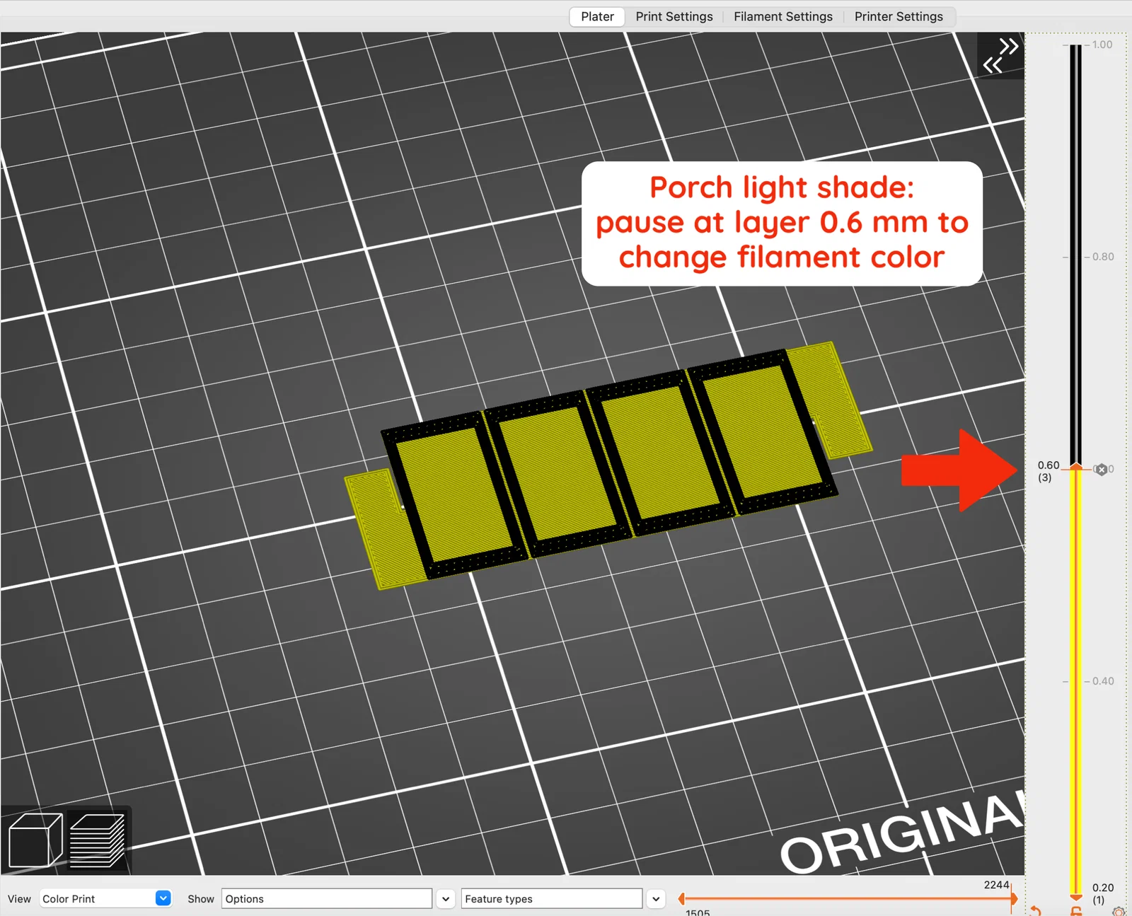 Với chụp đèn (light shade), bắt đầu in bằng màu vàng (hoặc màu bạn chọn). Thêm một lần pause để đổi màu filament tại 0.6mm. Sau khi đổi filament xong, tiếp tục in. Khi in chụp đèn xong, gấp theo các đường seam và luồn các tai (flaps) vào nhau để chúng khóa lại ở mặt trong của chụp. Trượt chụp vào đế, gắn đèn vào là xong:)