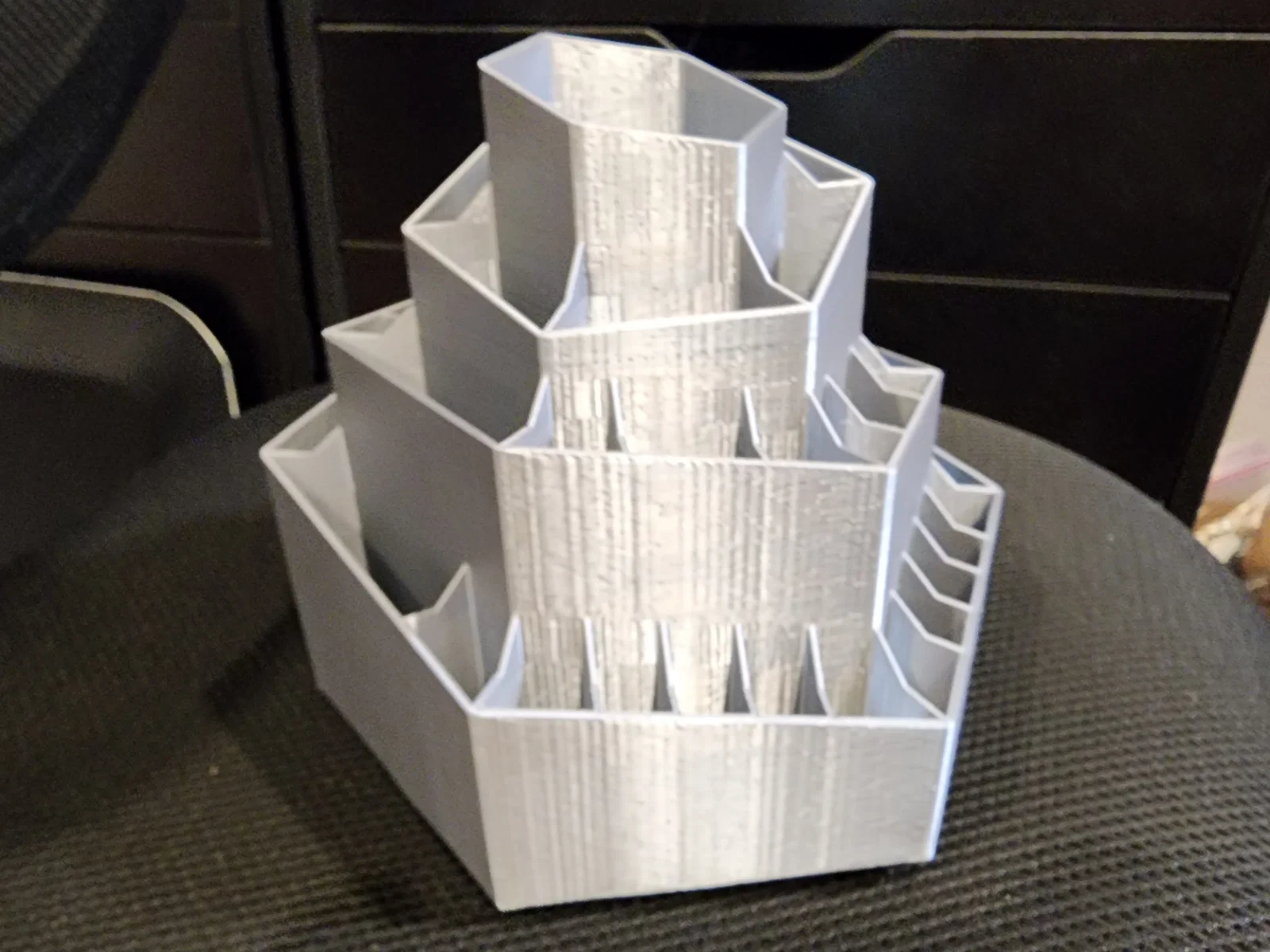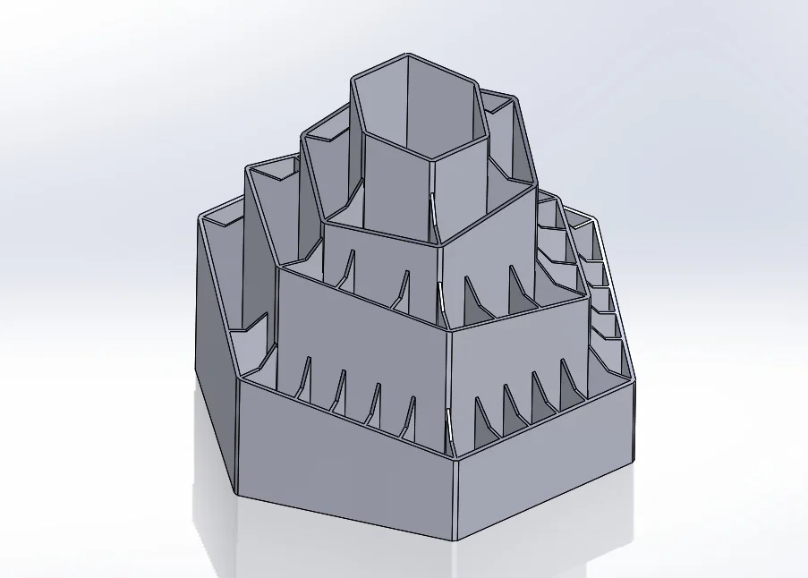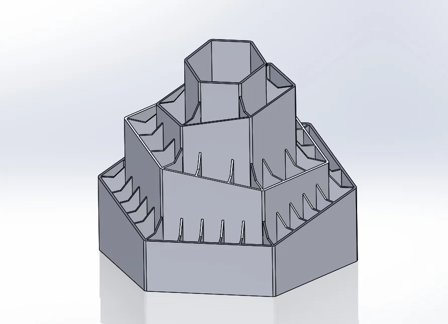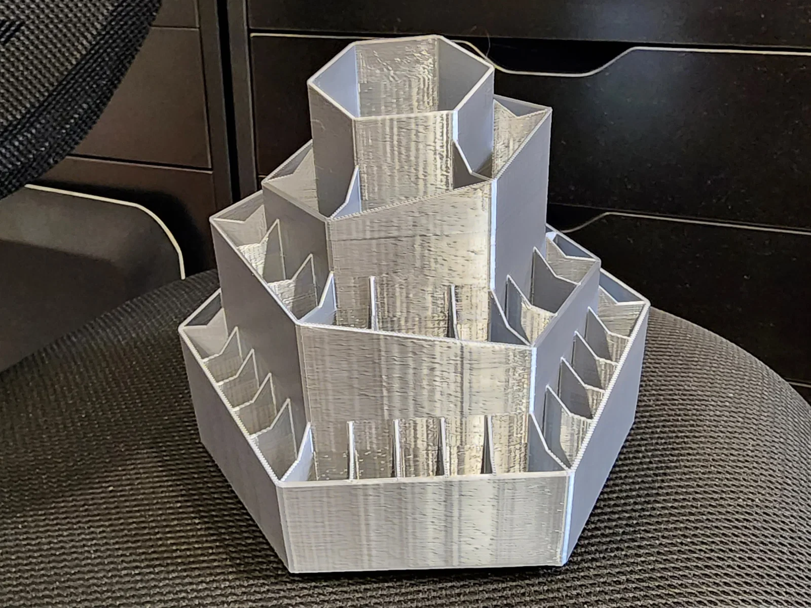 Tool caddy xoay dạng lục giác (hexagon) nhìn gọn đẹp, dùng turntable để lấy đồ tiện. Bản này to và cao hơn bản trước, có nhiều ngăn cho dụng cụ ngắn–dài, mỏng–dày; cũng hợp để đựng bút, marker, cọ vẽ.