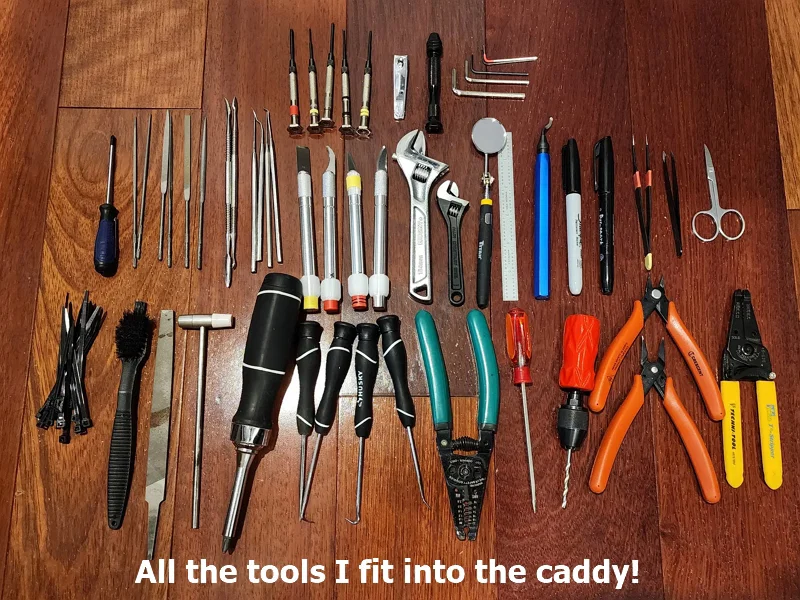 Caddy chứa được khá nhiều dụng cụ với đủ loại chiều dài, sắp xếp từ ngắn tới dài, mỏng tới dày — gần như kiểu gì cũng có một “pocket” phù hợp.