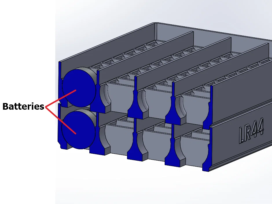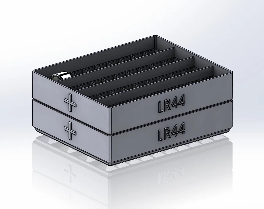 Khay pin LR44 dạng Click-n-Lock giúp lấy pin ra khỏi bao bì cồng kềnh để cất gọn gàng. Mỗi viên có ô riêng, có dấu +/-, chứa tới 40 viên, hạn chế chạm gây đoản mạch và có thể xếp chồng tiện lợi.