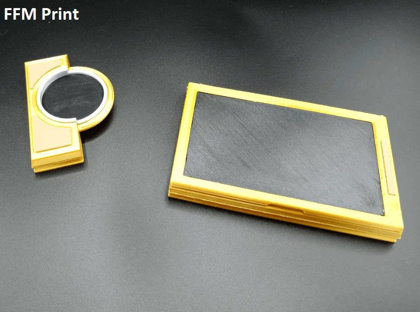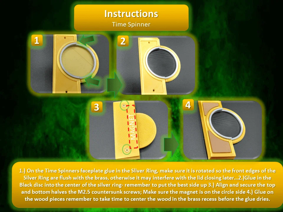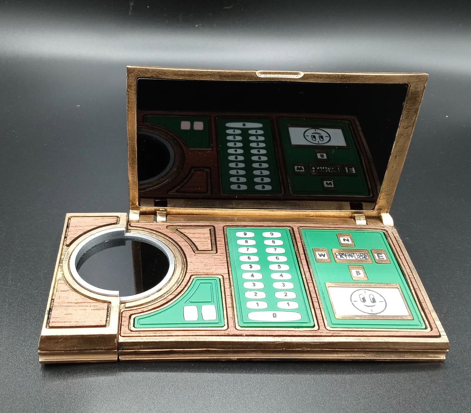 Lý thuyết và suy nghĩ về cấu tạo/vật liệu của prop: Chắc chắn do một người rất giỏi làm ra vì thiết kế quá thông minh. Hero props trông như được CNC từ brass (có thể là 360 brass). Có thể nhận ra nhờ nhiều góc bo tròn ở phía trong và góc ngoài sắc hơn—đây là “dấu vết” thường thấy vì khi gia công thì rất khó tạo góc trong thật sắc. Các tấm gỗ nhìn như gỗ thật chứ không phải decal/vinyl, vì ở một vài góc có thể thấy chúng có độ dày đáng kể (ước chừng khoảng 1mm). Mình không rành về gỗ nên việc định danh (ID) không phải thế mạnh… nhưng sau khi đặt 40 mẫu veneer gỗ về so sánh, mình đoán cao là mahogany, có phủ stain hoặc sealant để làm tối màu và bảo vệ. Mình đoán vậy vì vân gỗ thẳng và dày, mahogany cũng khá phổ biến; cherry và các loại veneer “phổ thông” khác có thể gần màu hơn ở trạng thái tự nhiên nhưng vân gỗ nhìn không đúng.