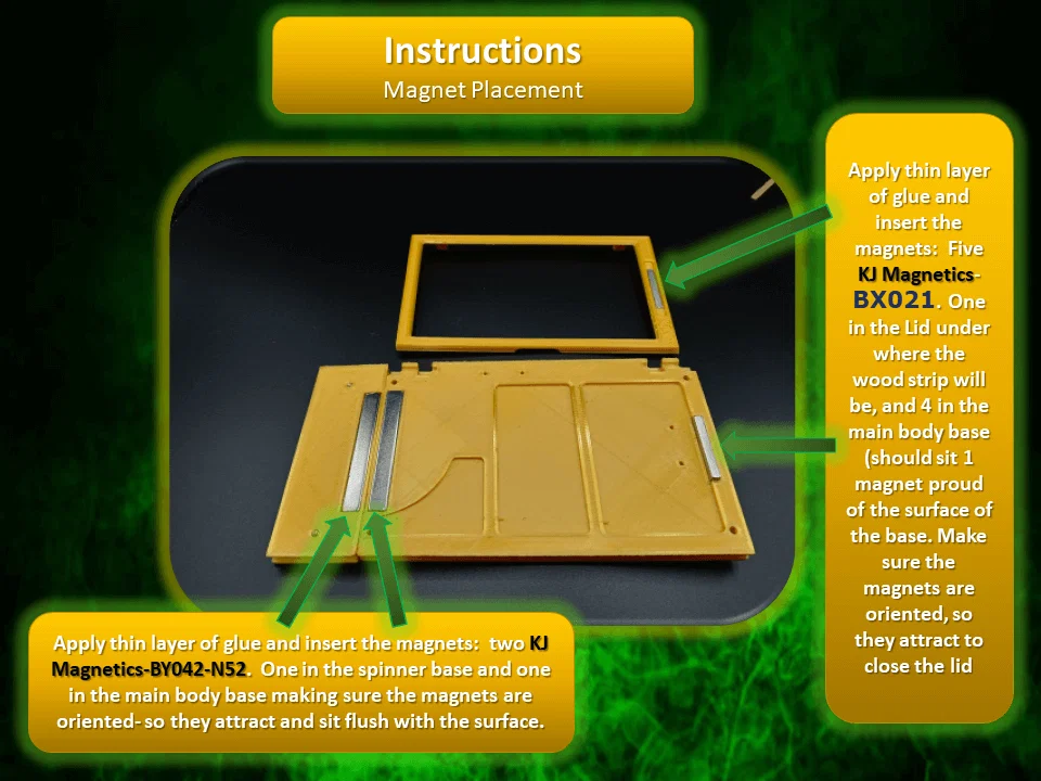 Supports??- Mình đã dành thời gian tối ưu file cho in 3D, nghĩa là đa số sẽ không cần support, chỉ có vài ngoại lệ: phần brass top của base có một cái gờ nhỏ bên phải sẽ cần support, và phần Lid sẽ cần support quanh hốc nam châm (có thể), và chắc chắn là khu vực hinges.