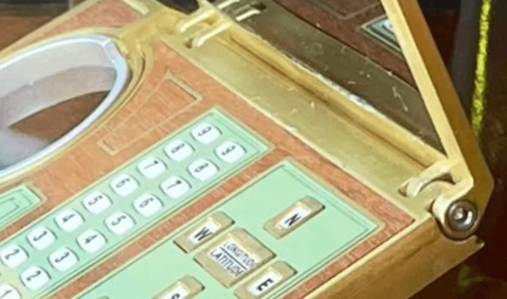 Mình nghĩ phần gỗ còn là “mẹo” khéo để che điểm gá (fixturing points), lỗ xuyên ren và nam châm vì chúng canh rất khớp với các chi tiết ở mặt đối diện. Phần nhựa xanh cũng được gia công (sau đó có thể lấy khuôn từ master đã gia công để đúc lại bằng resin). Các nút có số trông như đồ “found item” (mua/nhặt từ nguồn sẵn có) mà mình chưa tìm ra xuất xứ; cũng có thể được chế tác hoàn toàn, nhưng hình dáng rất đặc trưng khiến mình nghĩ là đồ có sẵn. Thân brass chính có vẻ gồm 2 mảnh trên/dưới, đường ráp được giấu bằng một chamfer ở phần trên. Trong ảnh có thể thấy chỗ giống như khe đường seam ở một cạnh. Làm hai nửa cũng hợp lý vì mặt sau có bu-lông để siết giữ hai phần lại.