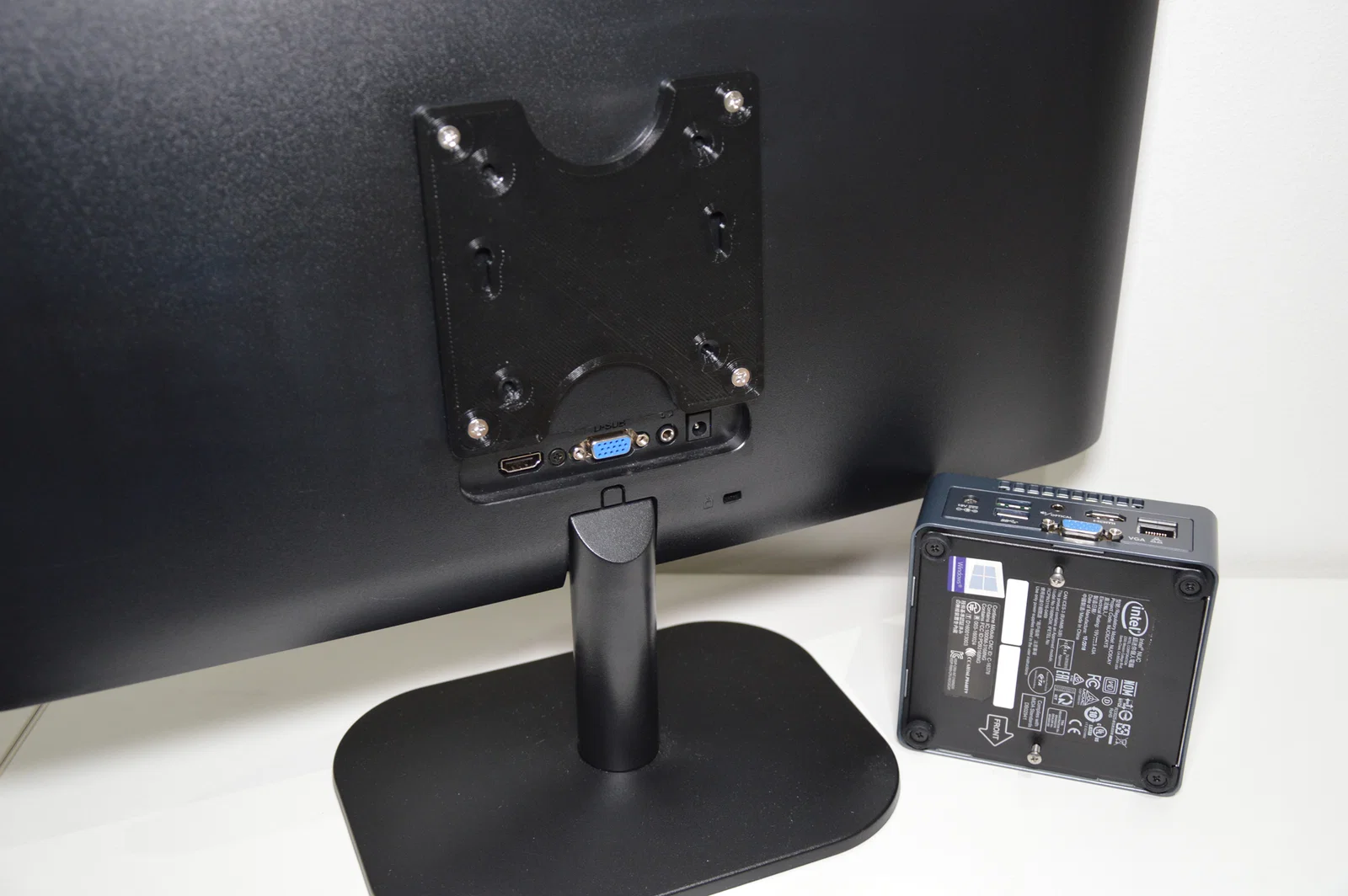 Bị thất lạc cái VESA mount zin của NUC mini PC nên mình không muốn ngồi chờ ship cái mới về. Thêm nữa là màn hình của mình (AOC 22B2H) có mặt lưng cong, nên không thể dùng bộ ốc Intel đi kèm; nếu mua ốc M4 dài hơn thì sẽ phải kê spacer. Bản mount in 3D này sẽ ôm theo độ cong mặt sau màn hình nếu in bằng PETG.