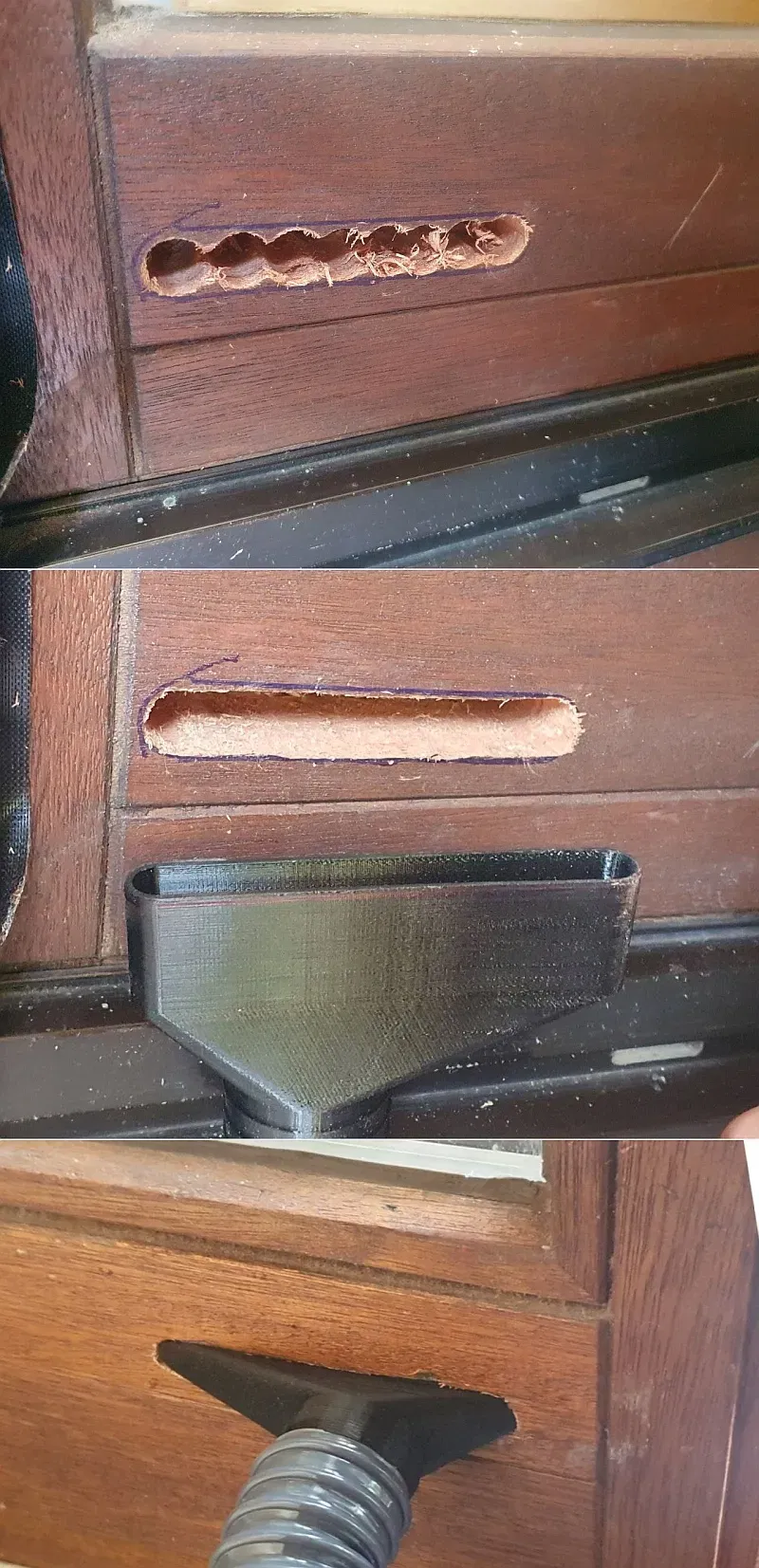Tôi đã sử dụng cái phễu này để làm khô một phòng với một máy bơm chân không kênh bên (Seitenkanalverdichter), kết nối với một ống chân không 38mm đến một khe 15mm trong khung cửa sổ.