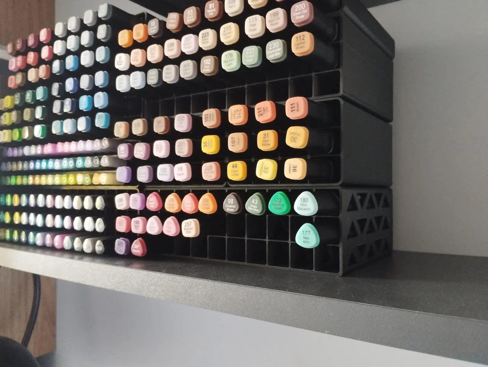 Mình thiết kế cái khay/hộp này cho bạn gái, vì cô ấy có rất nhiều twinmarkers, nhưng hay than phiền về cái decotray zin do lỗ rộng hơn cây bút nên bị phí diện tích. Thiết kế này giữ nguyên kích thước bên ngoài, cùng vị trí các chốt định vị (pins) và lỗ của khay gốc loại gấp đôi, nhưng mỗi hàng chứa được 10 markers thay vì 8. Mình có thử nhét 11 cây nhưng chật quá. Các chốt được vát mép (chamfered) để in dễ hơn nhưng vẫn khít chuẩn. Toàn bộ khay dạng thoáng (openwork) nên tốn ít filament hơn.