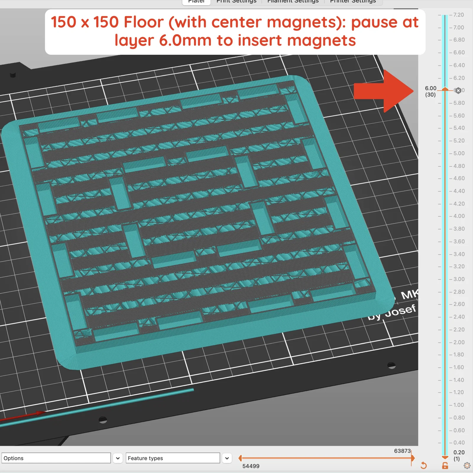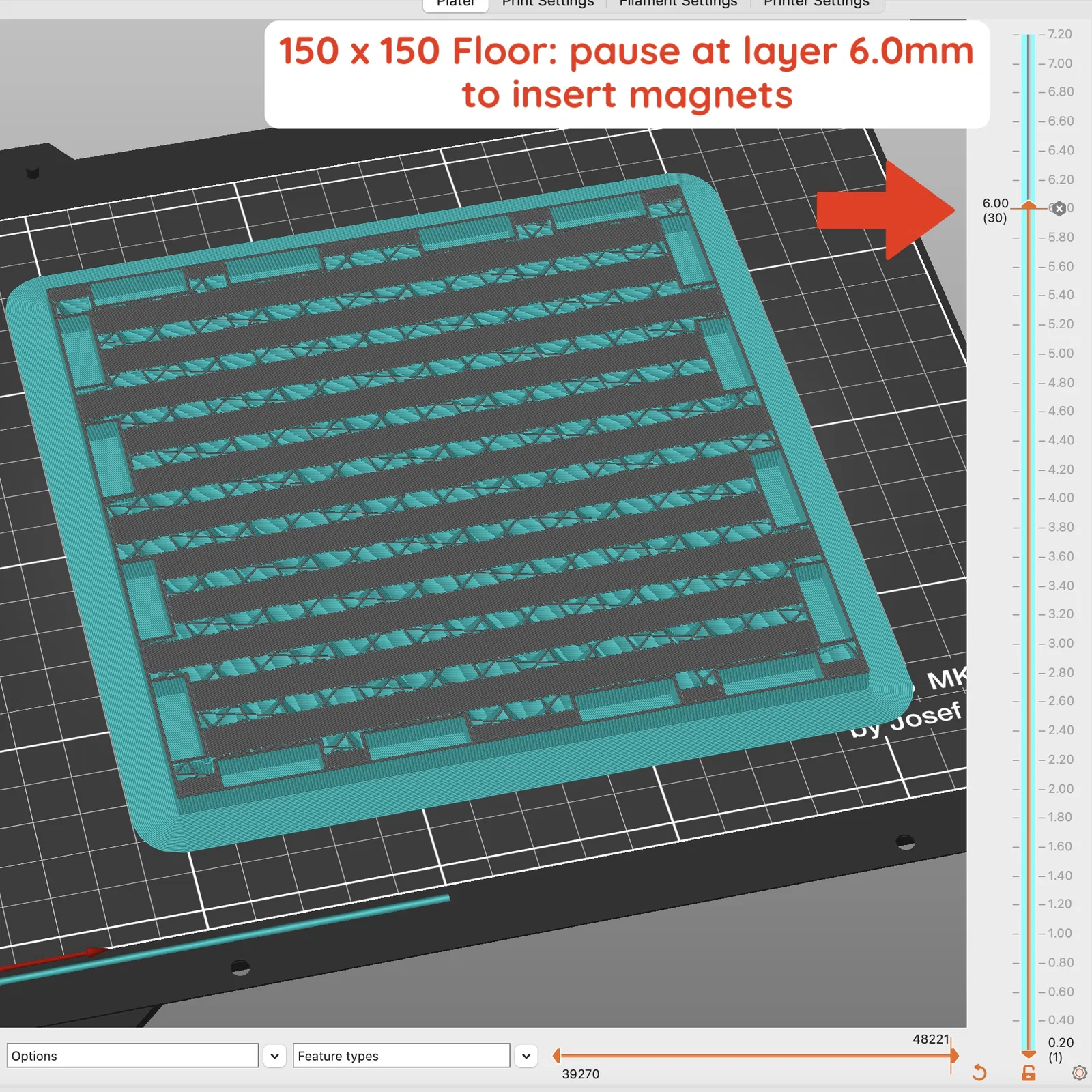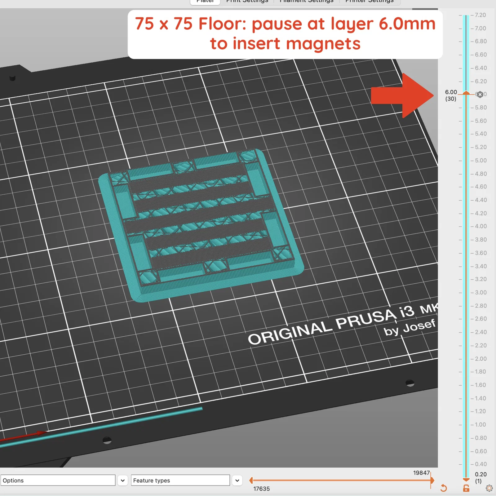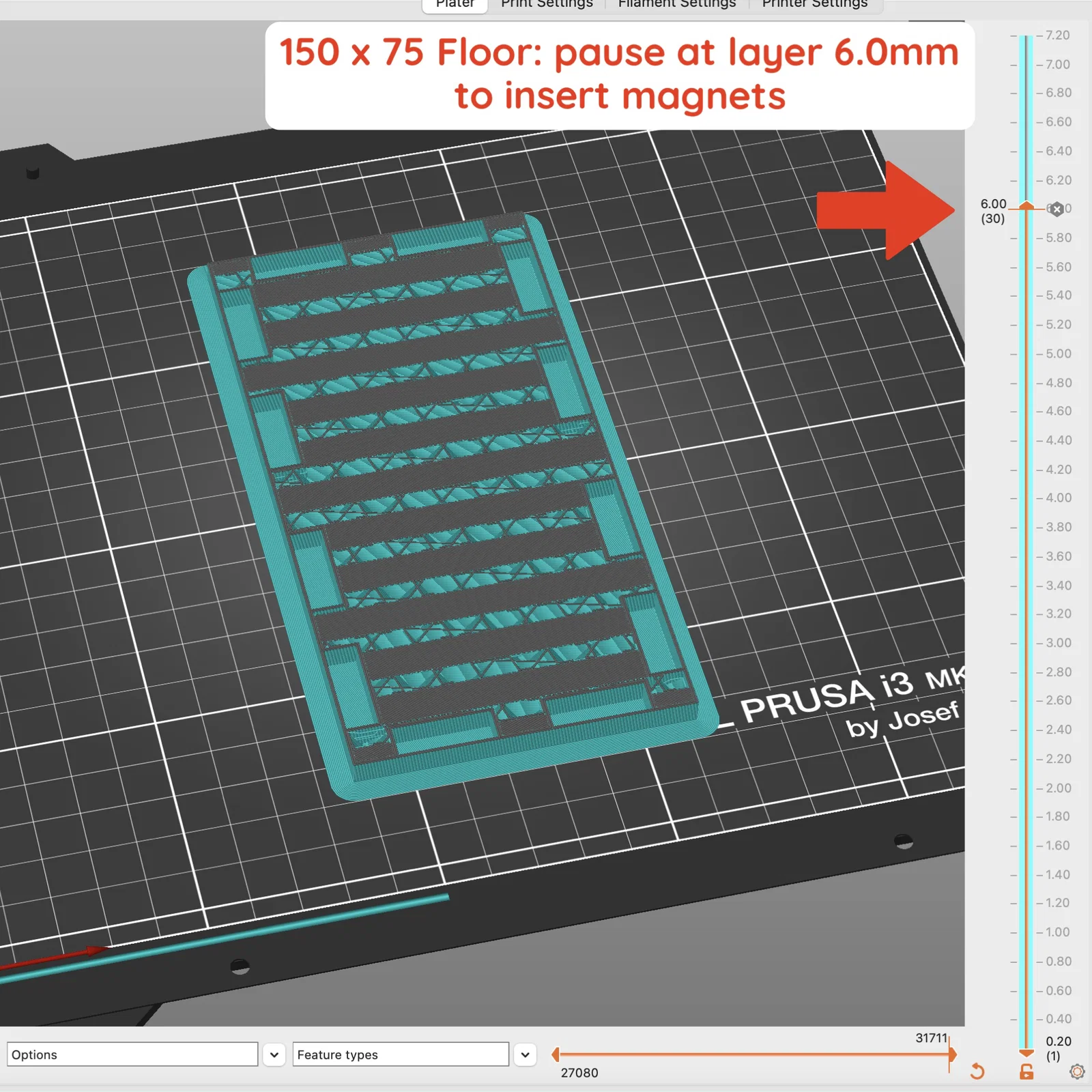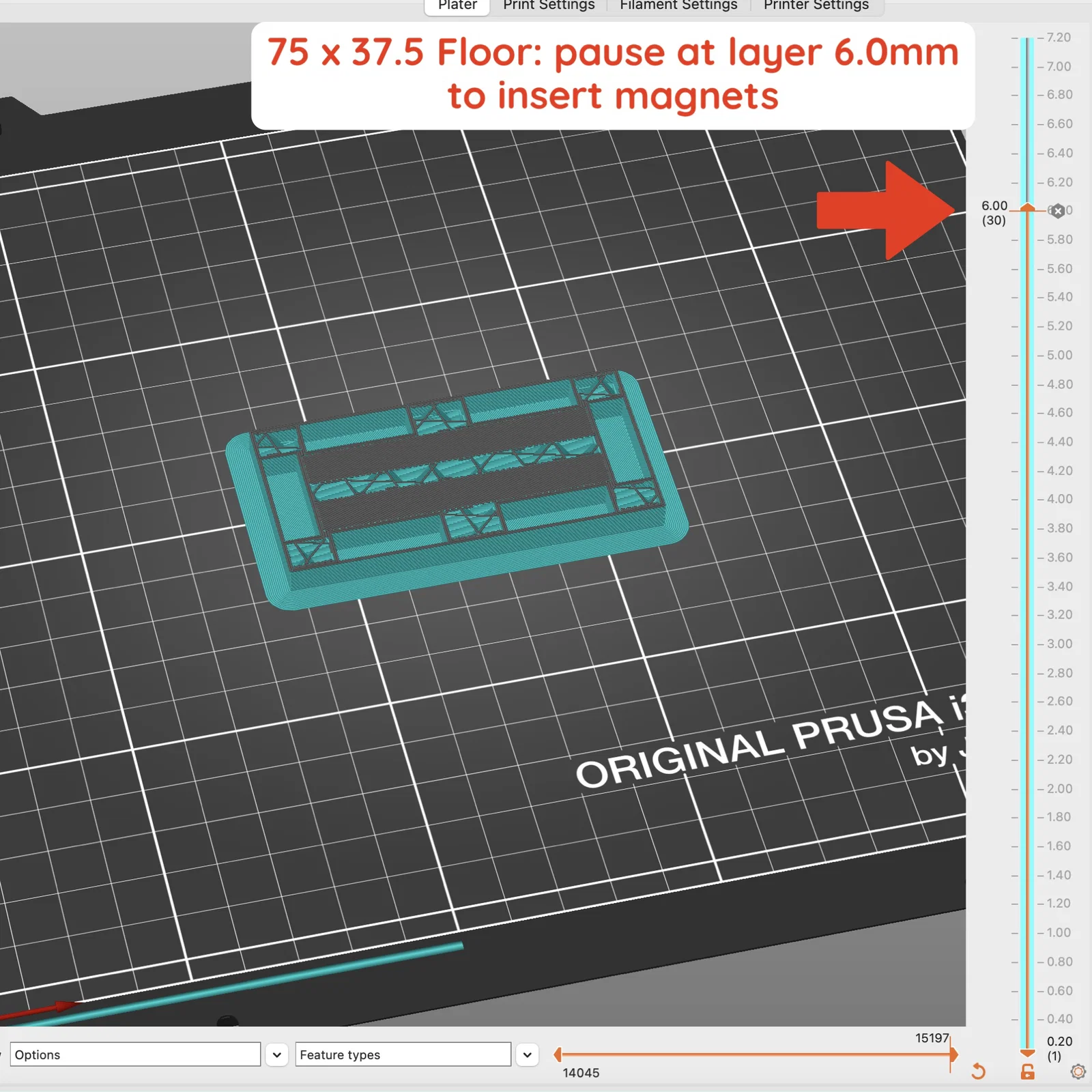 Với tất cả các miếng này, hãy thêm lệnh pause print ở layer height 6.0mm để gắn nam châm. Khi máy tạm dừng, đặt nam châm vào. Mình thích xen kẽ hai size nam châm giữa các lỗ (20x5x2, 10x5x2, 20x5x2, 10x5x2, v.v.). Mình thấy nếu dùng toàn 20x5x2 thì lực hút mạnh quá, còn dùng toàn 10x5x2 thì cảm giác hơi yếu.
