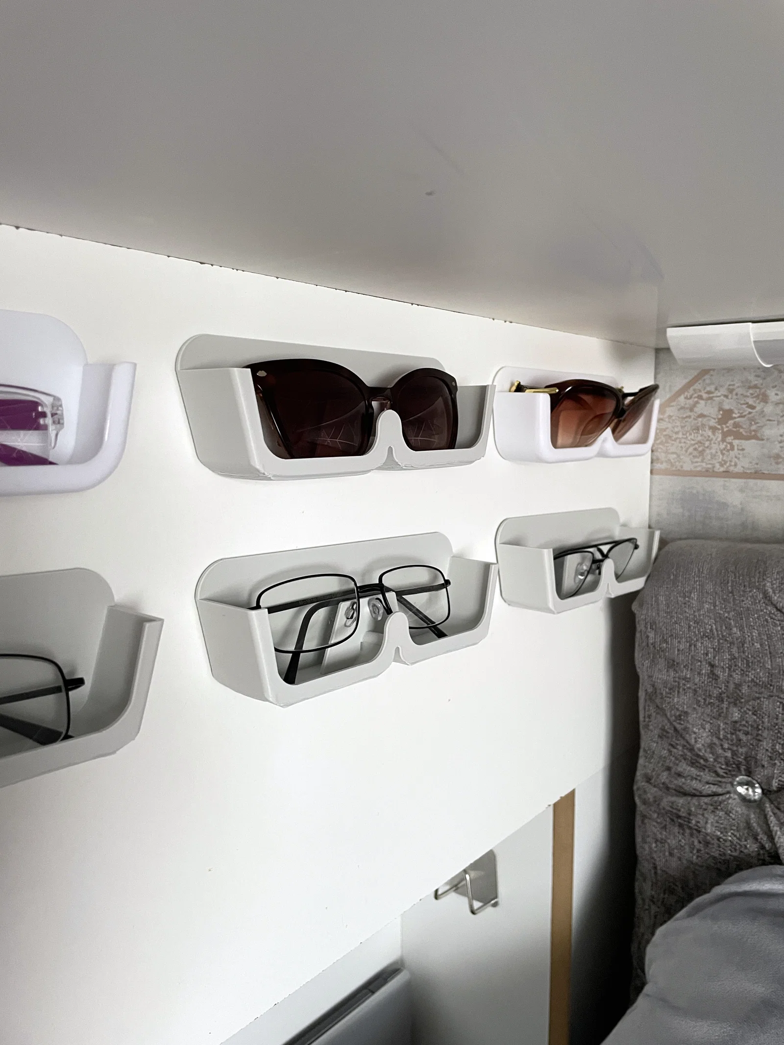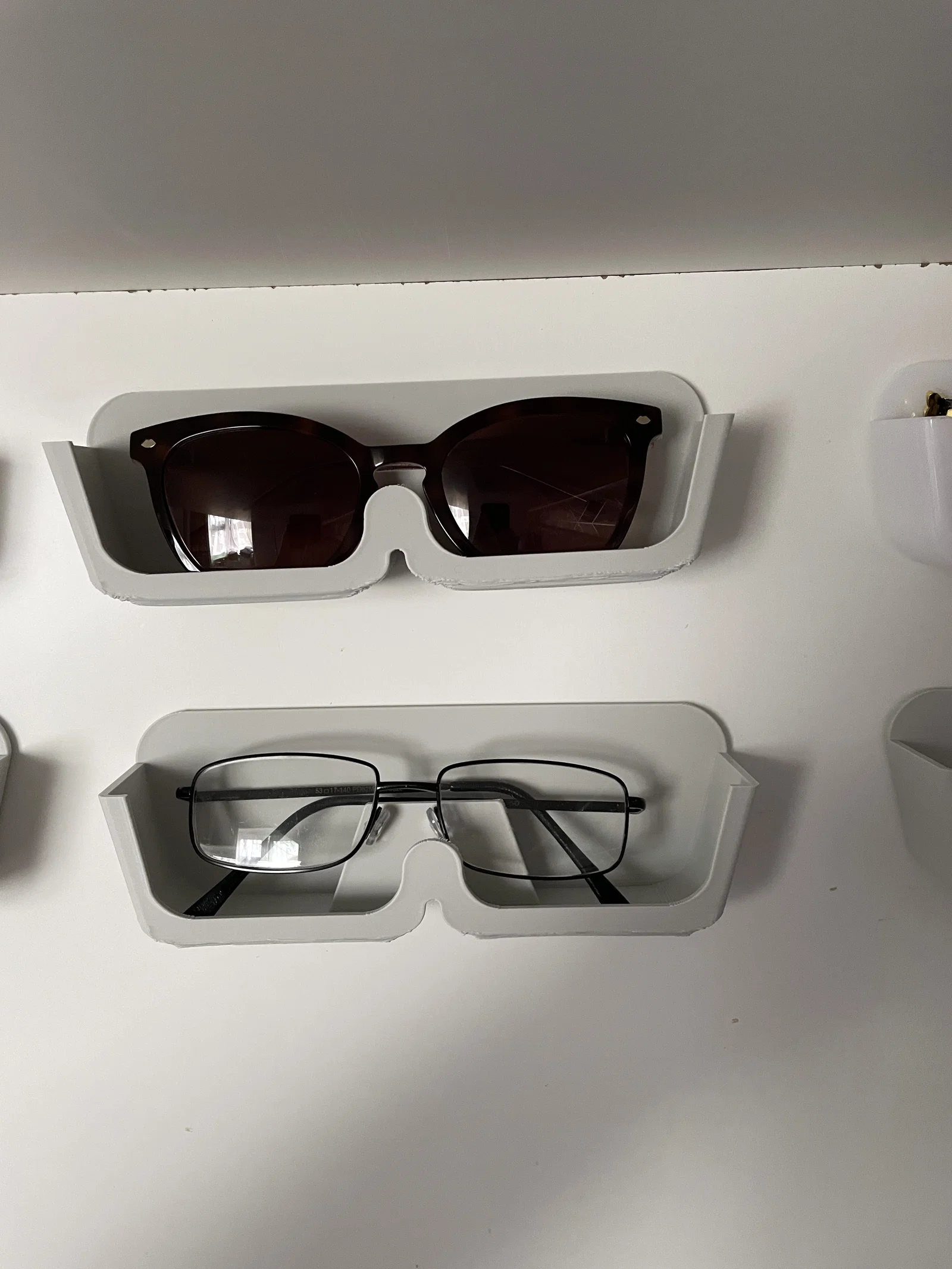 Mẫu giá treo kính/kính mát dán tường (hoặc dán lên vách tủ) giúp bạn cất gọn và khỏi thất lạc. Dùng băng keo xốp hai mặt để dán chắc. Có 2 phiên bản: mặt trước phẳng hoặc bo tròn.