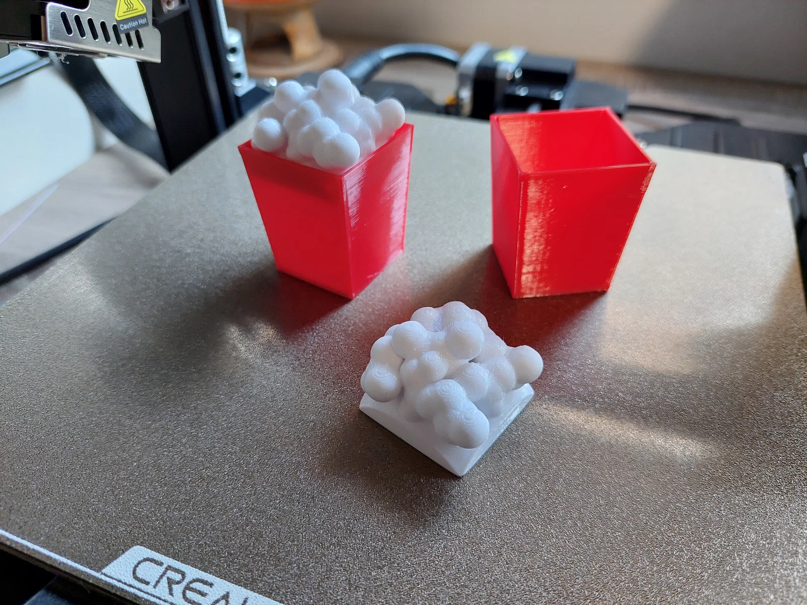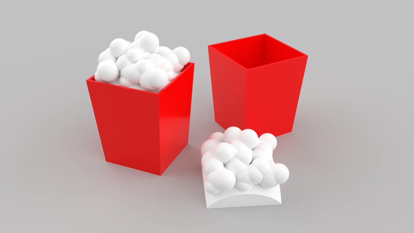 - Thiết kế bao gồm 2 phần tách biệt: phần vỏ hộp (đế) và phần nắp mô phỏng bắp rang bơ, bạn nên in bằng hai màu nhựa khác nhau (đỏ và trắng) để mô hình có hiệu ứng thị giác tốt nhất.