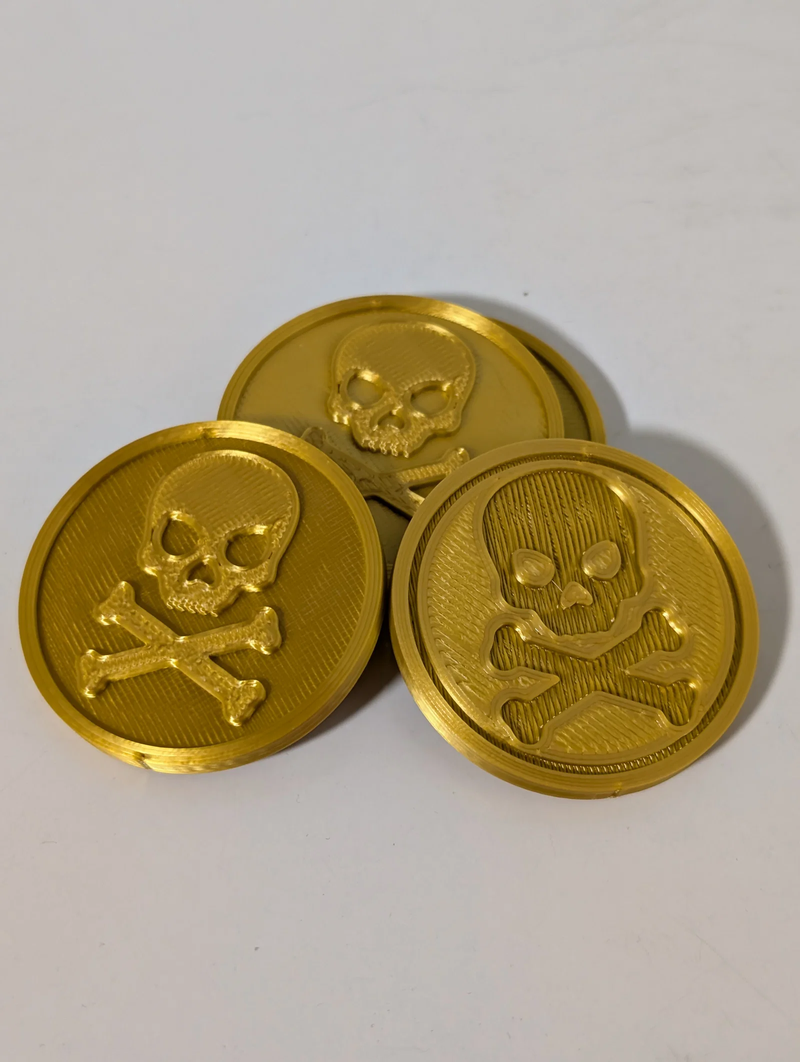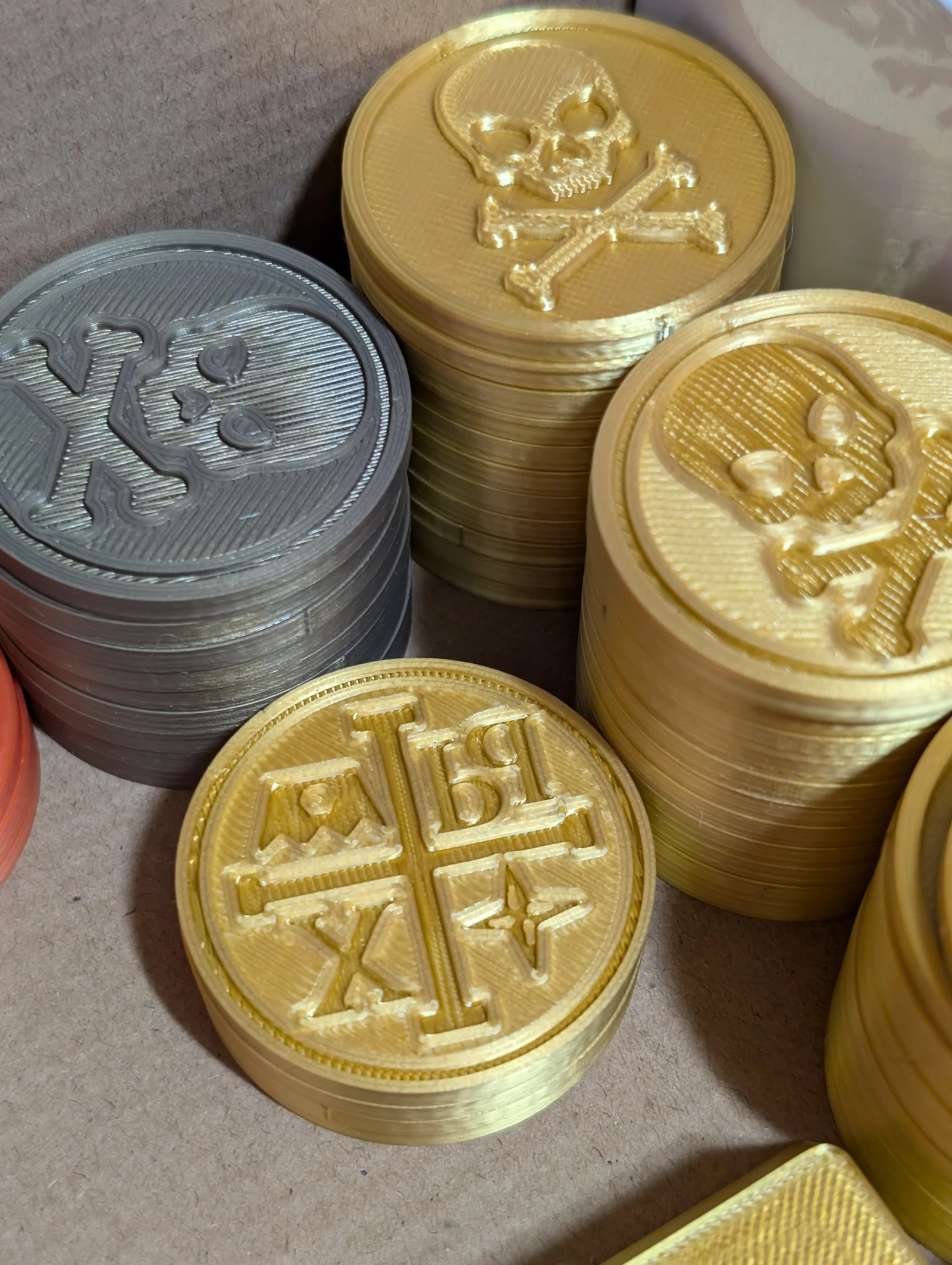 Bộ trang trí chủ đề hải tặc gồm đồng xu và thỏi, hợp cho Halloween hoặc trưng bày theo concept pirate. Dùng làm token thưởng cho trò chơi, hoặc prop trang trí. Mẫu không có ký hiệu, dễ in nhiều màu như vàng, bạc, đồng.