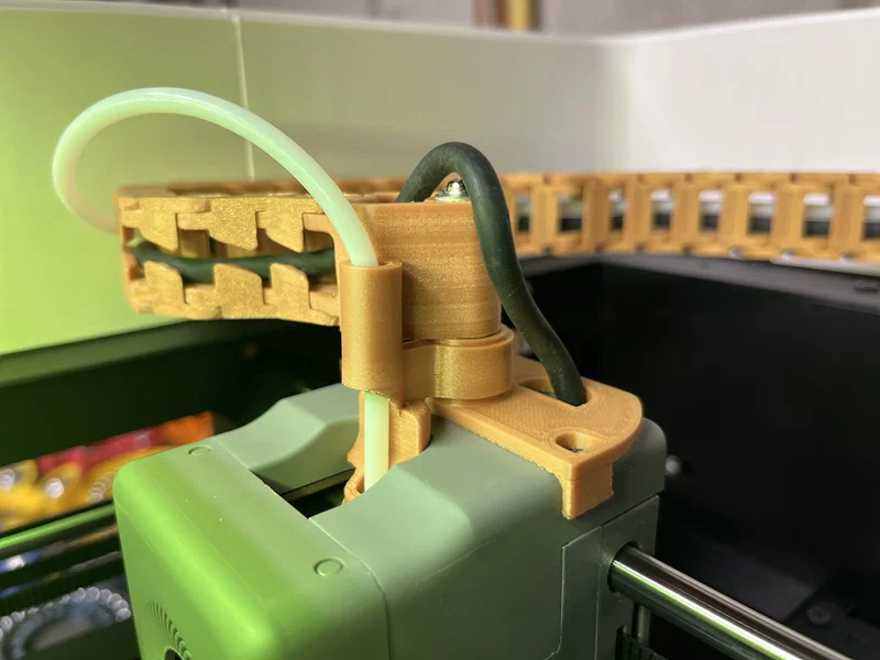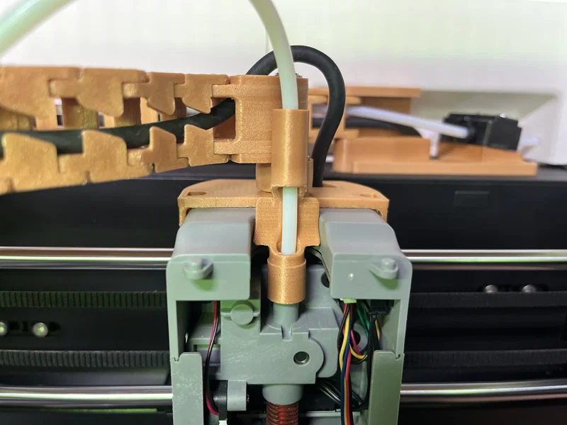 Việc lắp đặt bộ xích dẫn dây này giúp giảm thiểu tối đa hiện tượng dây cáp bị võng hoặc va chạm vào các bộ phận khác trong khoang in. Với thiết kế thông minh, bạn có thể dễ dàng đi dây cáp điện và ống dẫn nhựa đi kèm theo cùng một trục, giúp máy in nhìn chuyên nghiệp và ngăn nắp hơn hẳn. Bạn có thể sử dụng mẫu adapter mới được thiết kế riêng với ren M3, cho phép lắp ráp trực tiếp mà không cần dùng đến các chi tiết ốc cấy đồng (brass insert), giúp tiết kiệm thời gian và công sức cho người mới bắt đầu hoặc những ai không có sẵn phụ kiện kim loại chuyên dụng.