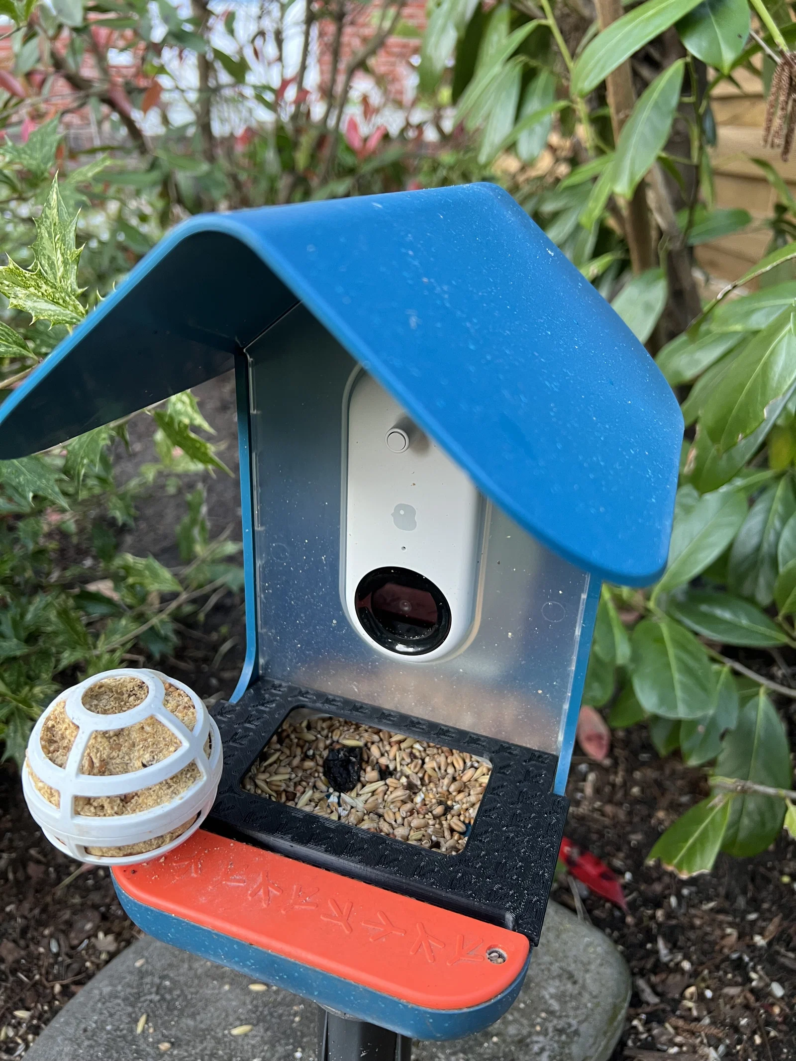 Trong hình của mình là phiên bản có mấy cái “chân chim” nhỏ, giống như phần phía trước của khay hạt, nhưng đất/bụi lại hay kẹt trong mấy chỗ đó. Bản mình upload thì chỉ có logo Bird Buddy nhỏ ở một góc.