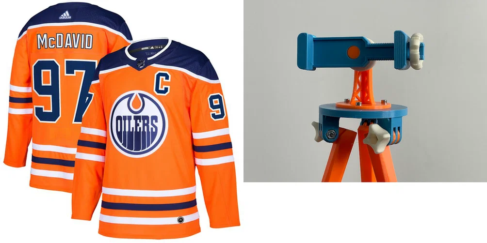 Xem ảnh ví dụ áo đấu McDavid của Edmonton Oilers với một prototype cũ mình làm cho bạn. Mình cũng hên: nhờ cấu trúc kiểu giàn khoan dầu và giọt dầu màu cam tạo bởi khớp cầu (ball joint) nên logo lên nhìn rất hợp.