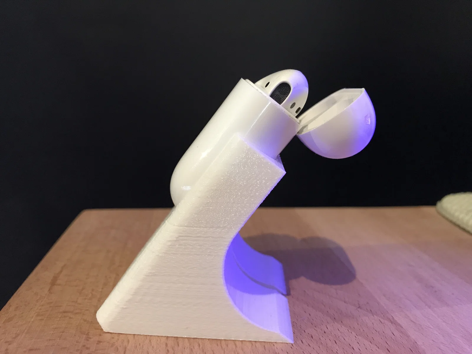 Bản remix từ CarlTheCreator: cắt bớt 20 mm phía sau để hộp AirPods mở nắp khi đang sạc, và xoay 126.5° để nằm phẳng trên bàn in. Có thể dán 3M Command Strip dưới đáy để tháo bằng một tay.