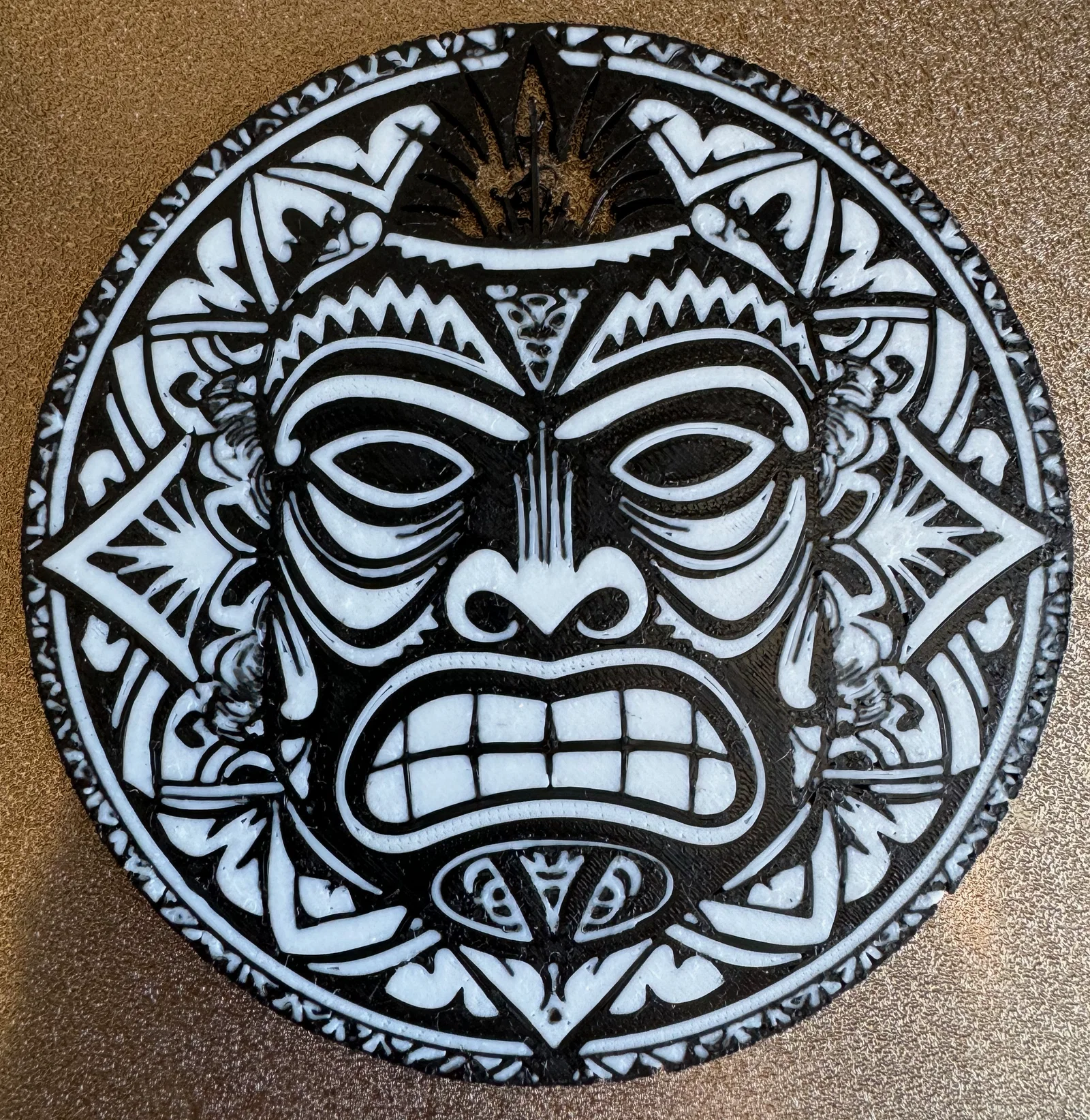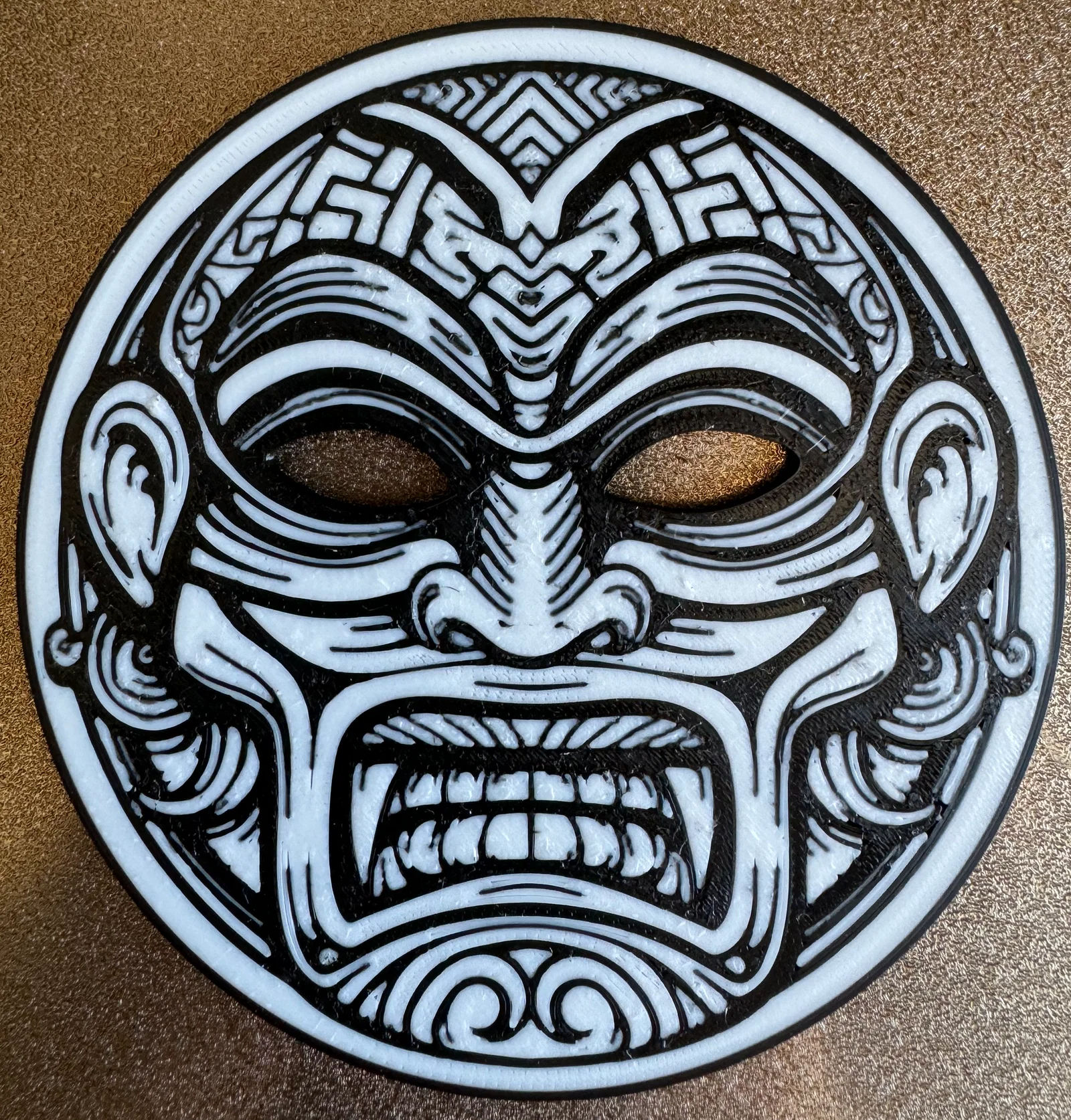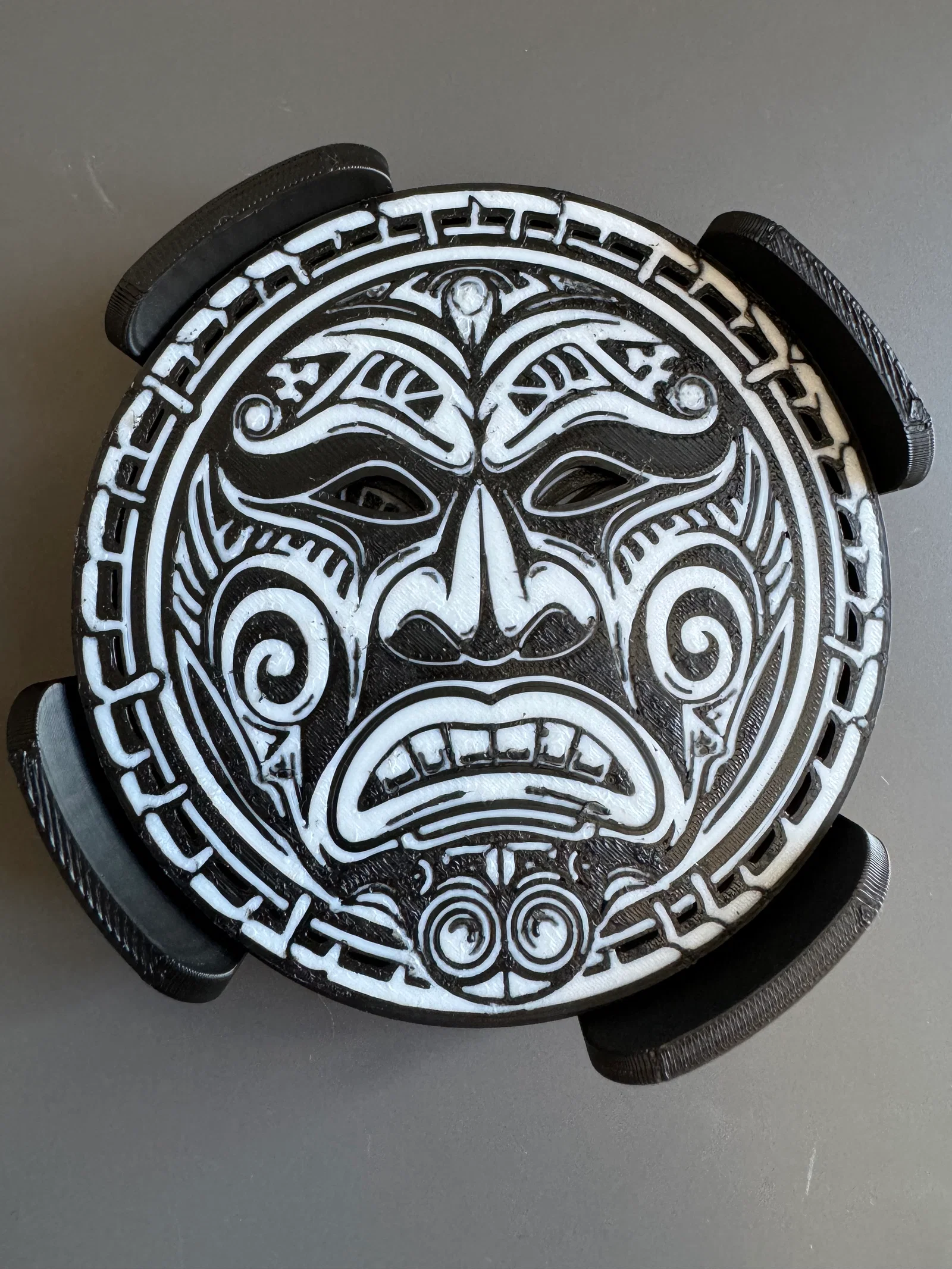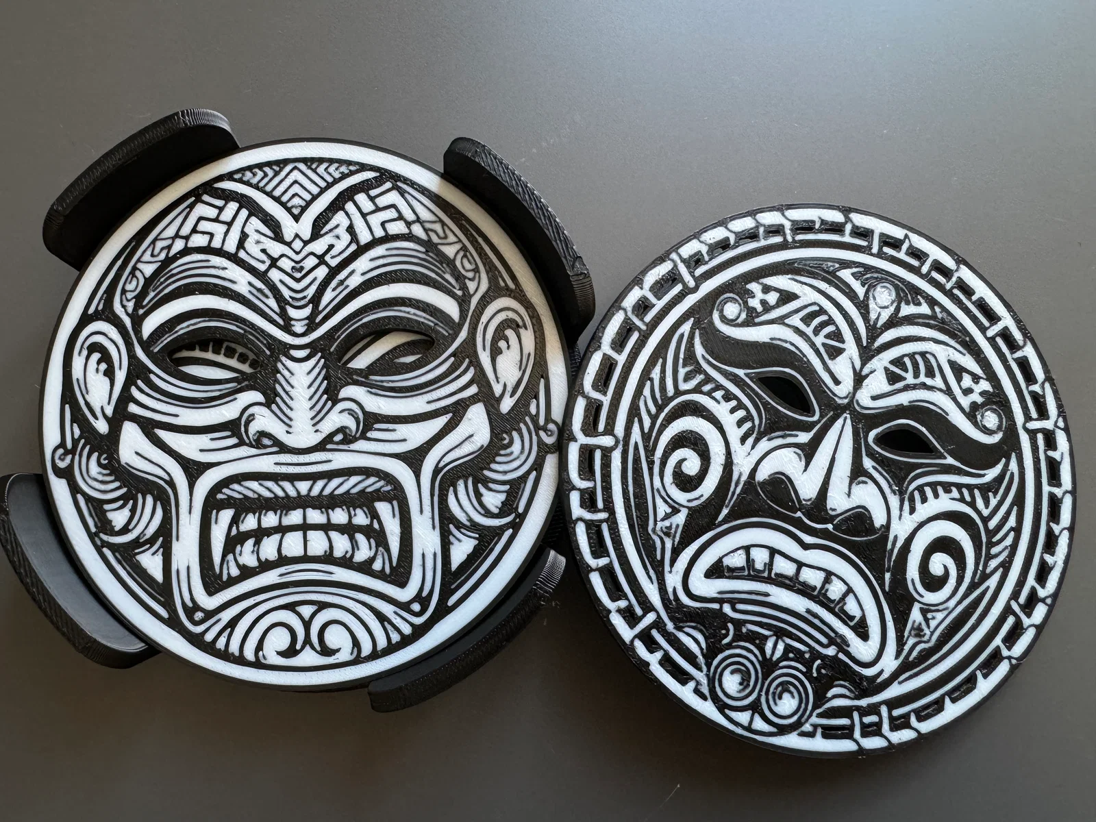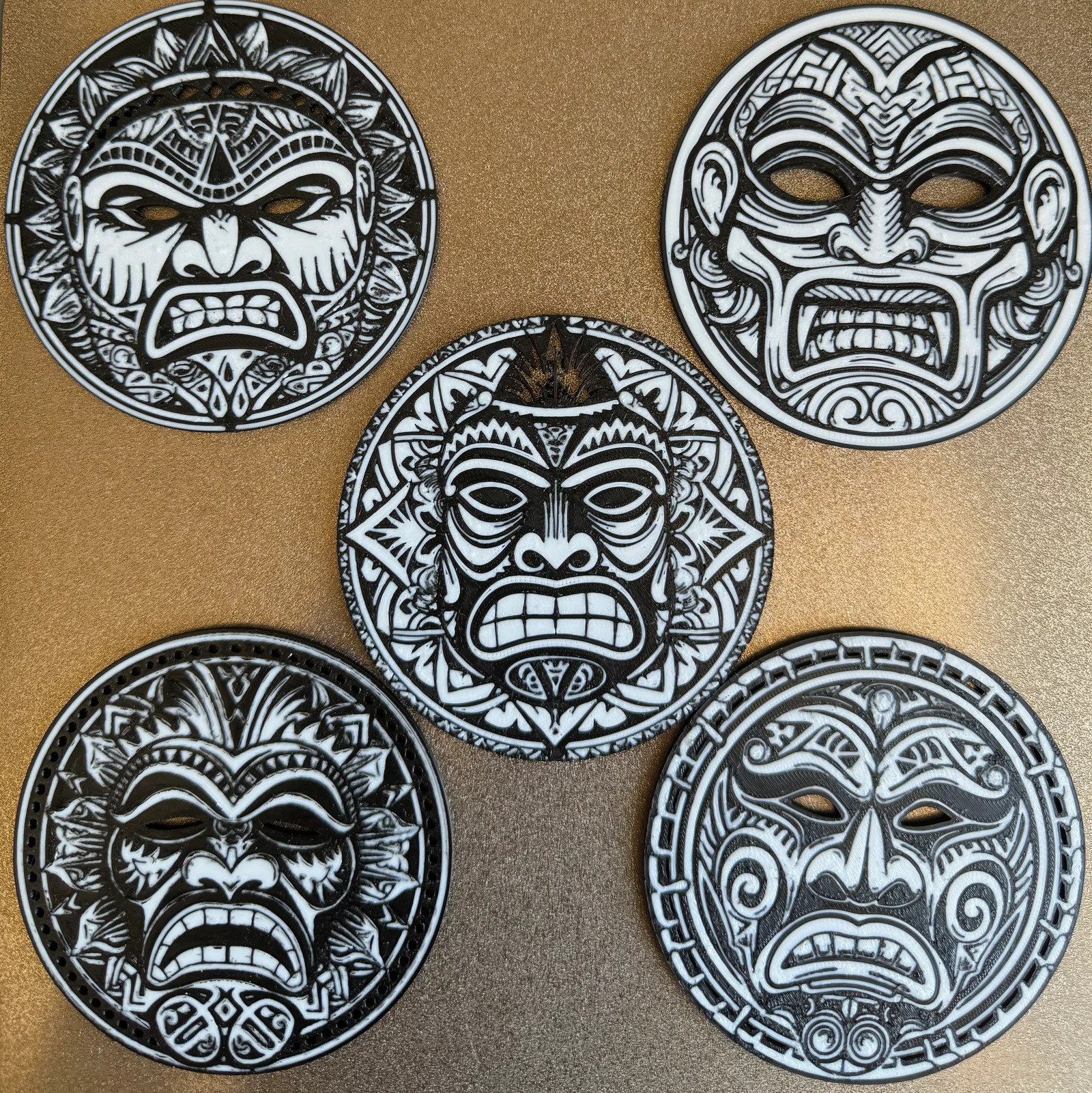 Bộ lót ly phong cách Maori gồm nhiều mẫu, kèm khay đựng. File .3mf đã được sơn màu bằng Bambu Studio/Makeworld Keymaker để bạn tùy chỉnh màu. Khuyến nghị in không bật ironing vì chi tiết nhiều.