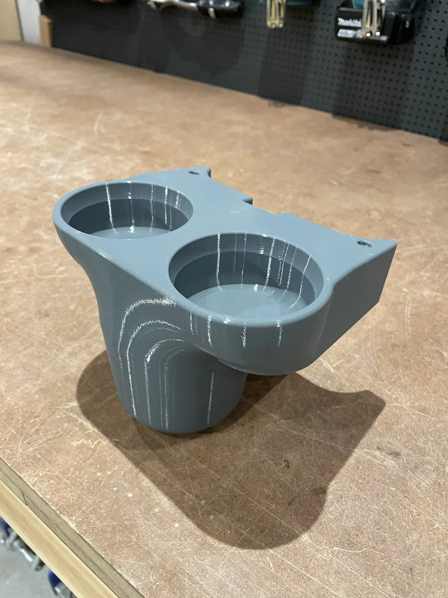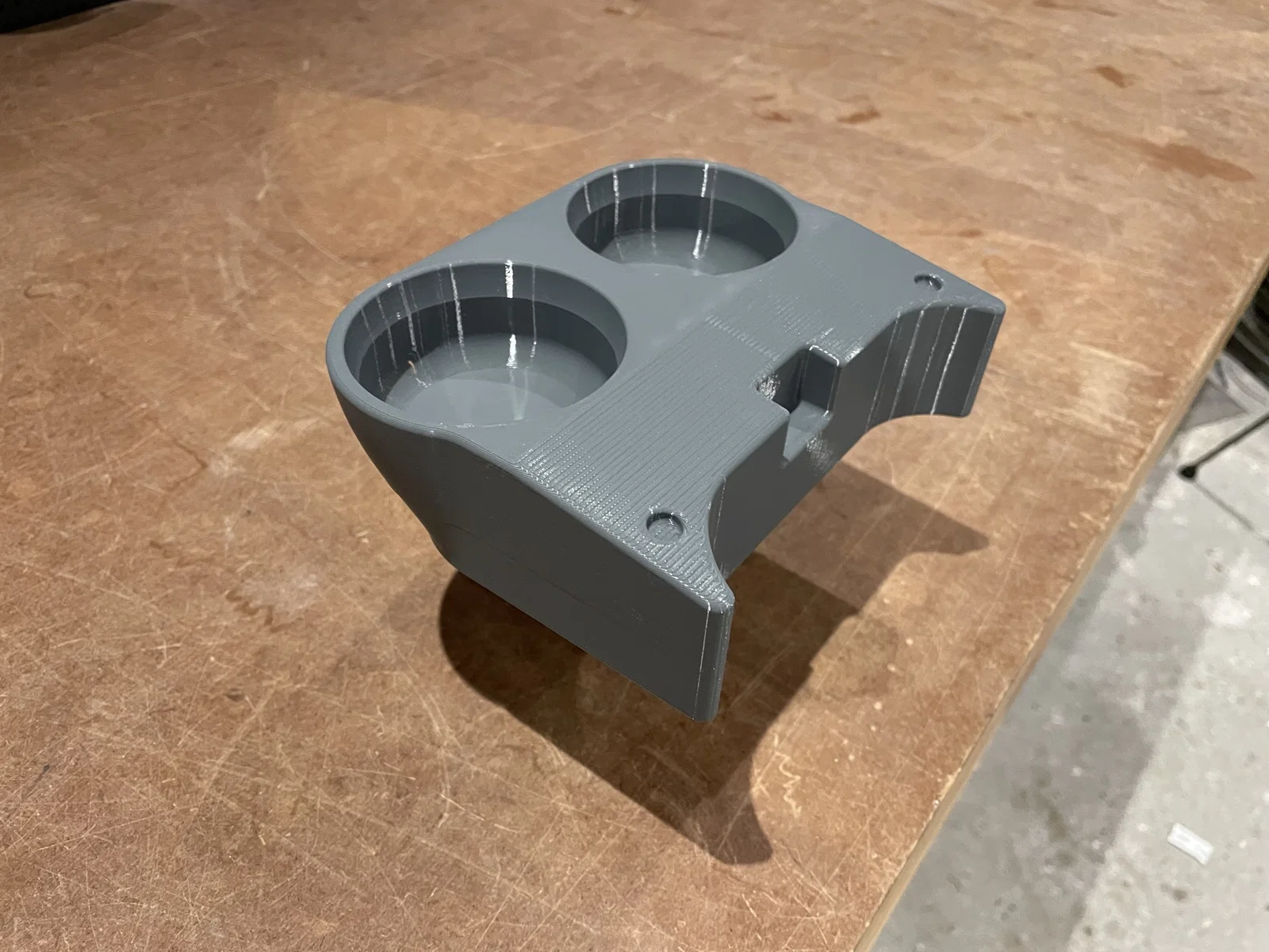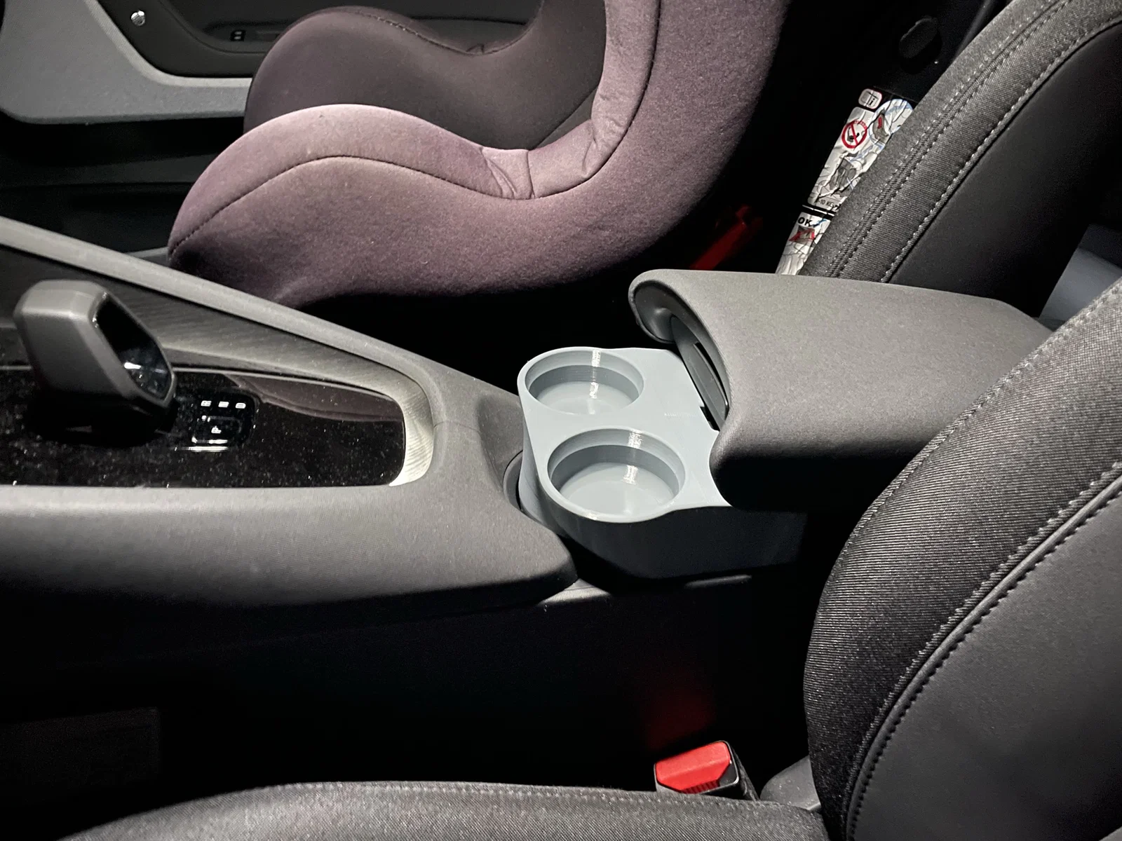 Mẫu phụ kiện cho Polestar 2 gồm cupholder đôi và phần kê/tựa tay. Hộc để ly vừa lon 330ml và ly McDonald’s (ở châu Âu). Thiết kế để armrest kéo ra có thể phủ lên cupholder; có mẹo thử độ nâng bằng 2 ngón tay.