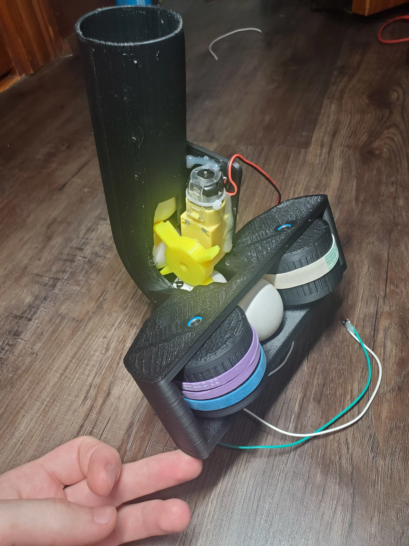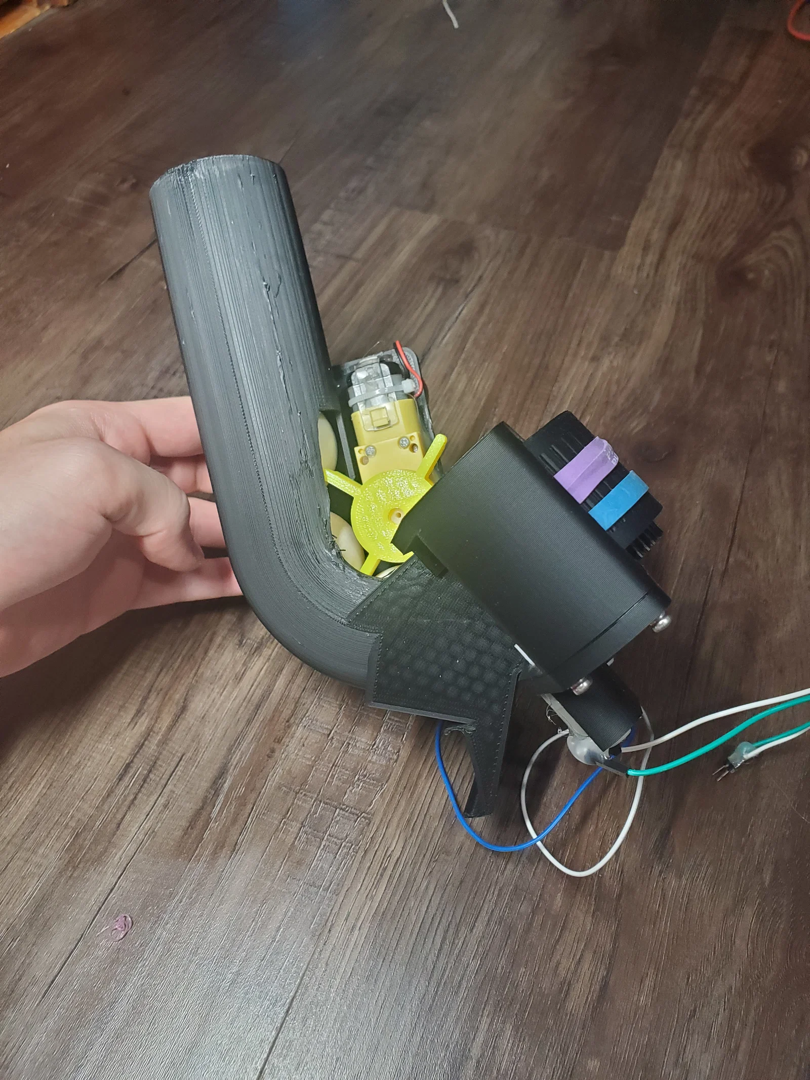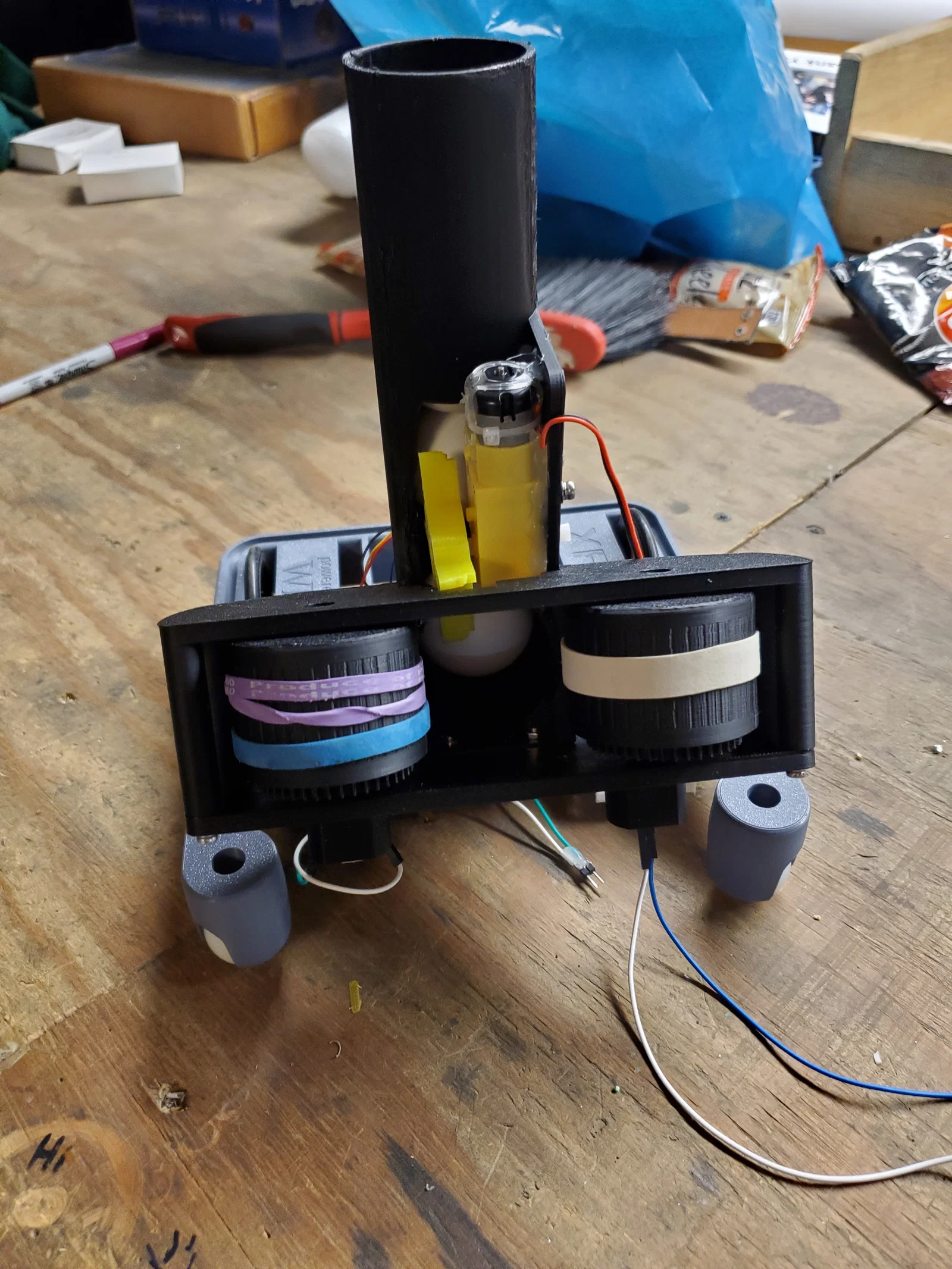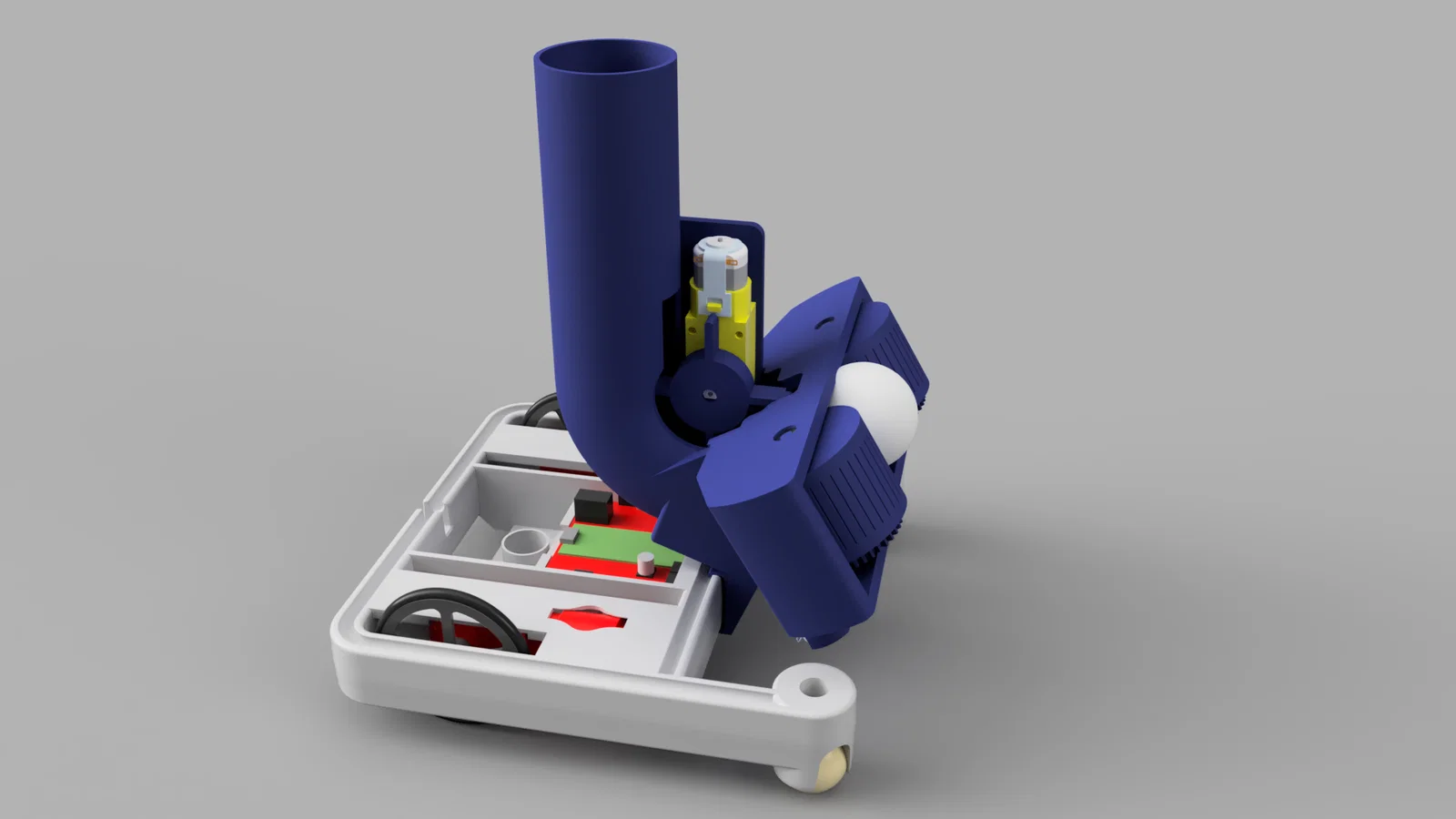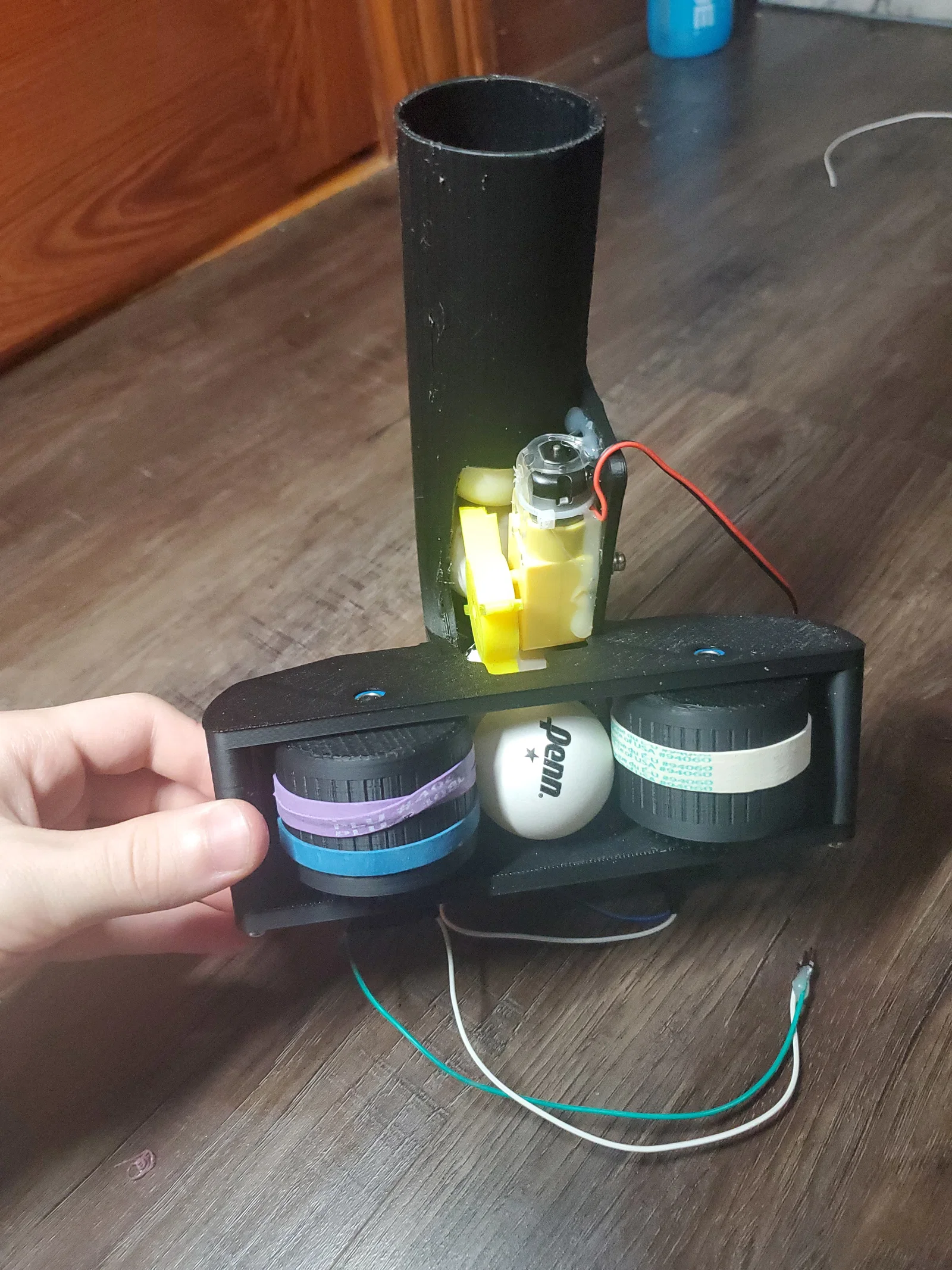 Đây là phụ kiện máy bắn bóng bàn chạy bằng động cơ. Nó sử dụng hai bánh đà (flywheels) và một động cơ cấp liệu để đẩy bóng qua đường dẫn. Phụ kiện này được thiết kế để gắn vào robot XRP, giúp robot có thêm khả năng mới. Máy được đặt ở góc 30 độ so với mặt đất, có thể chứa và bắn tối đa 5 quả bóng cùng lúc. Các bánh đà có tốc độ quay không tải ước tính khoảng 2250 vòng/phút.