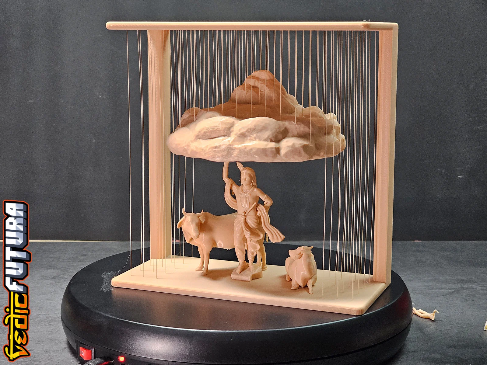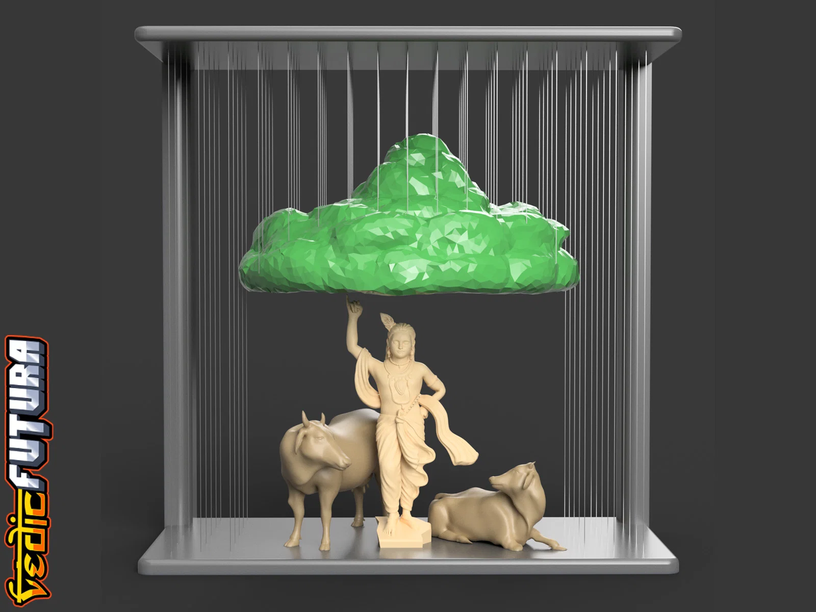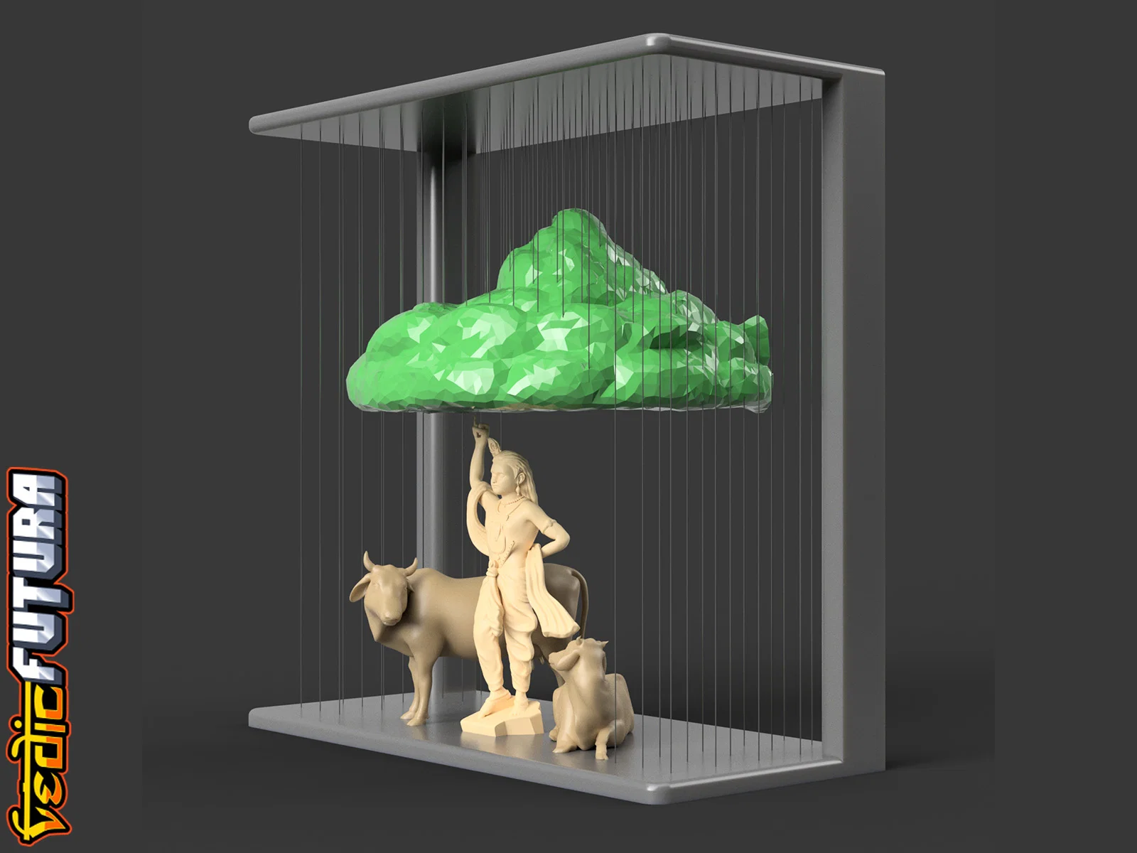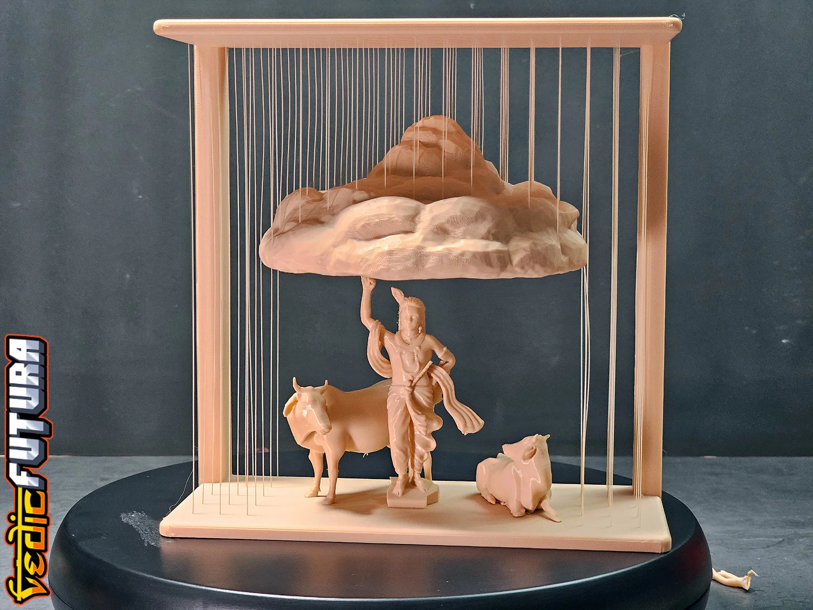 Mẫu 3D tái hiện cảnh Krishna nâng đồi Govardhan để che chở dân Vrindavan. Frame và Mountain in chung, dùng string vừa đỡ vừa tạo hiệu ứng mưa; Krishna và bò in riêng đặt bên dưới. Có thêm bản đỡ bằng cột.