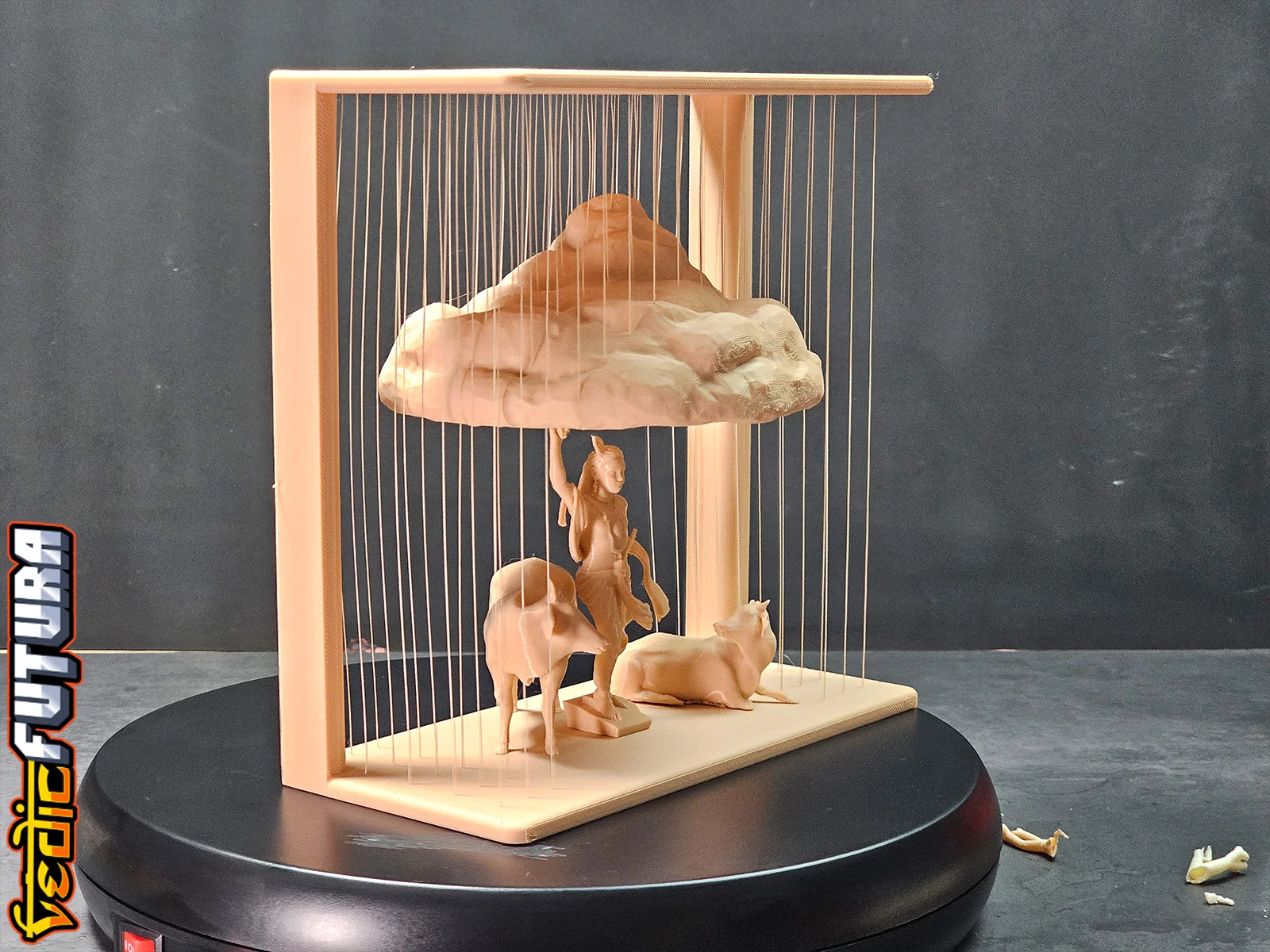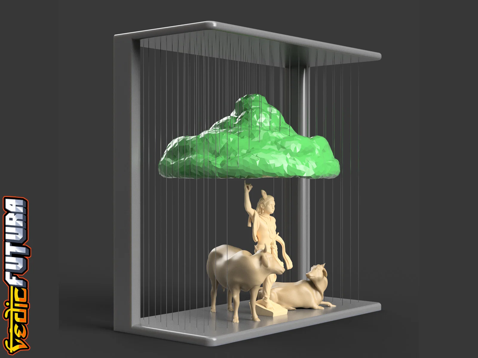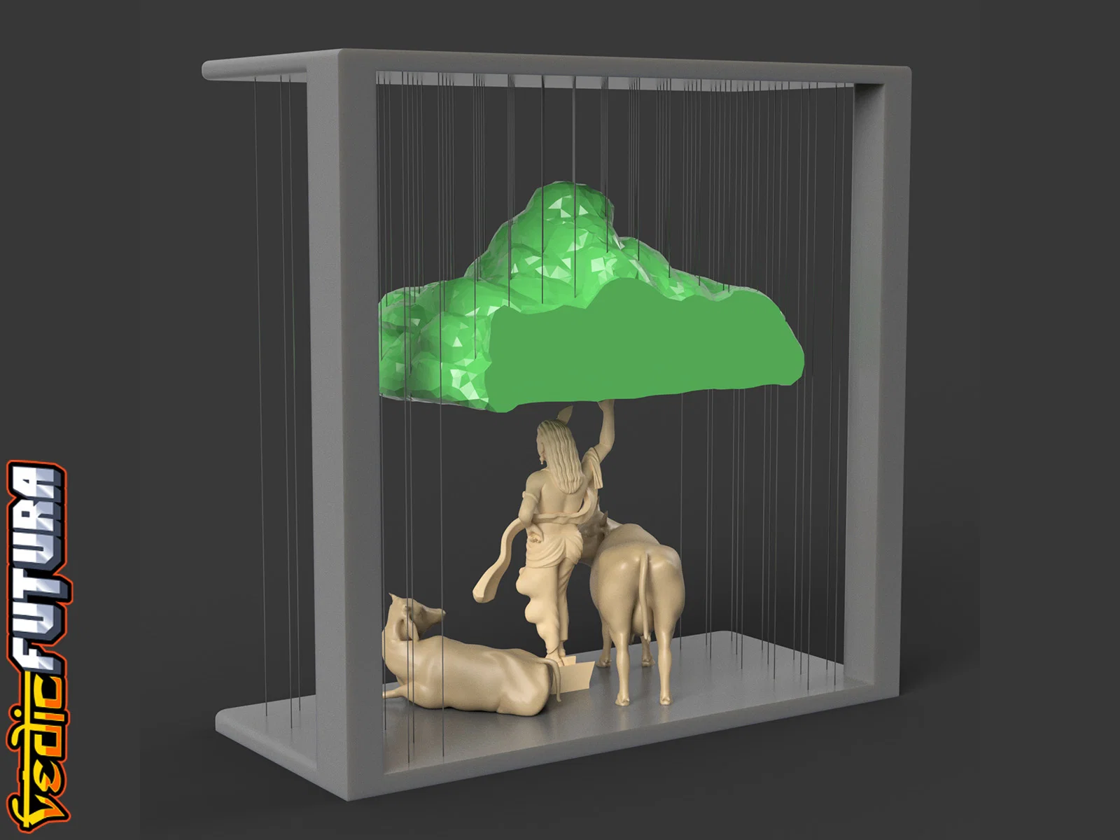 Mẫu 3D tái hiện cảnh Krishna nâng đồi Govardhan để che chở dân Vrindavan. Frame và Mountain in chung, dùng string vừa đỡ vừa tạo hiệu ứng mưa; Krishna và bò in riêng đặt bên dưới. Có thêm bản đỡ bằng cột.