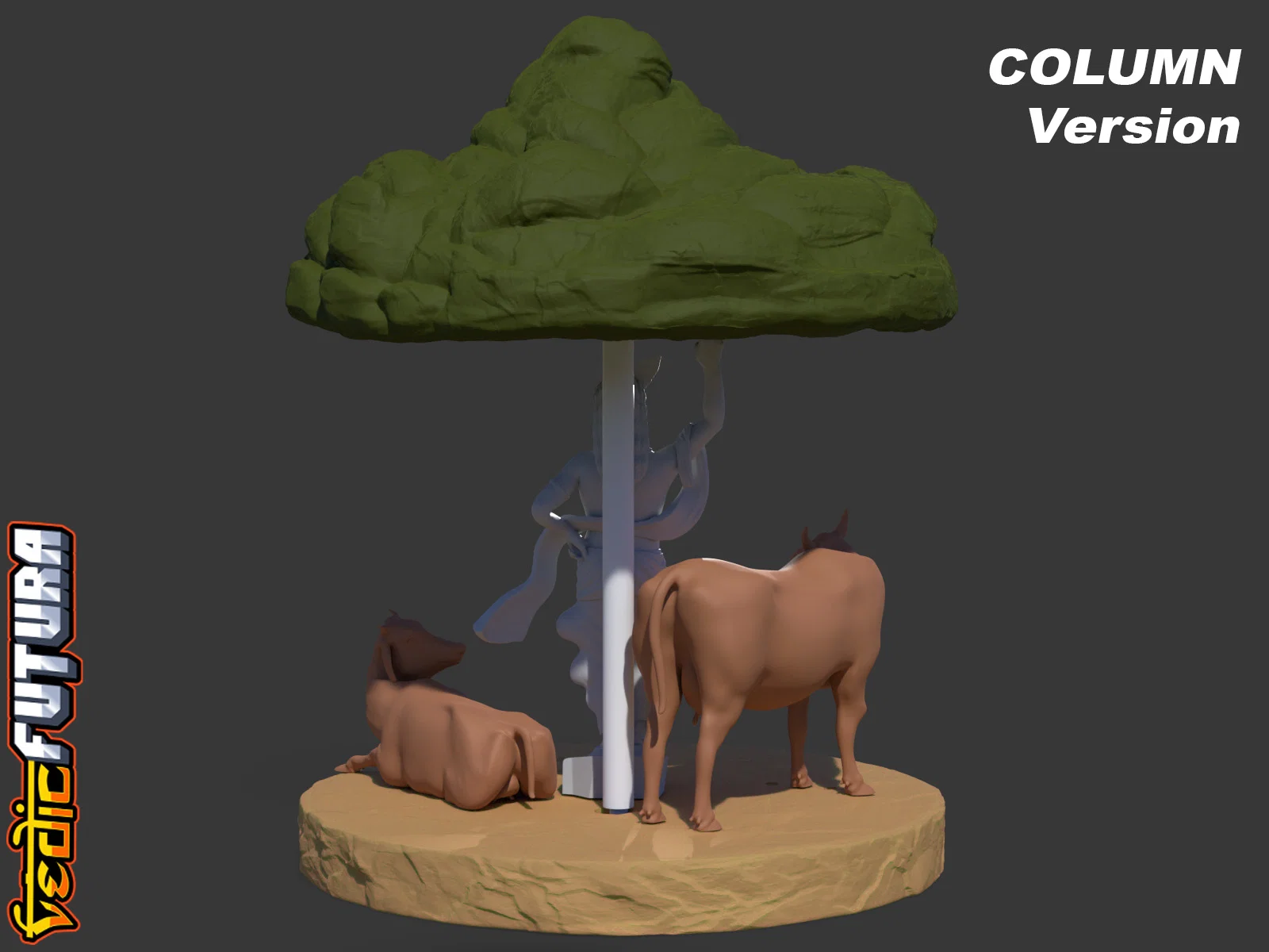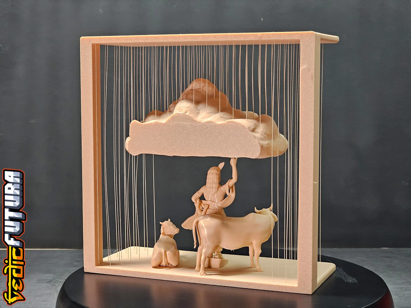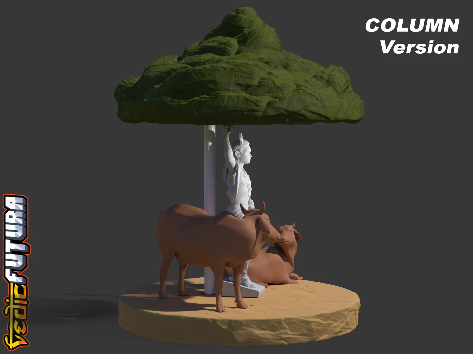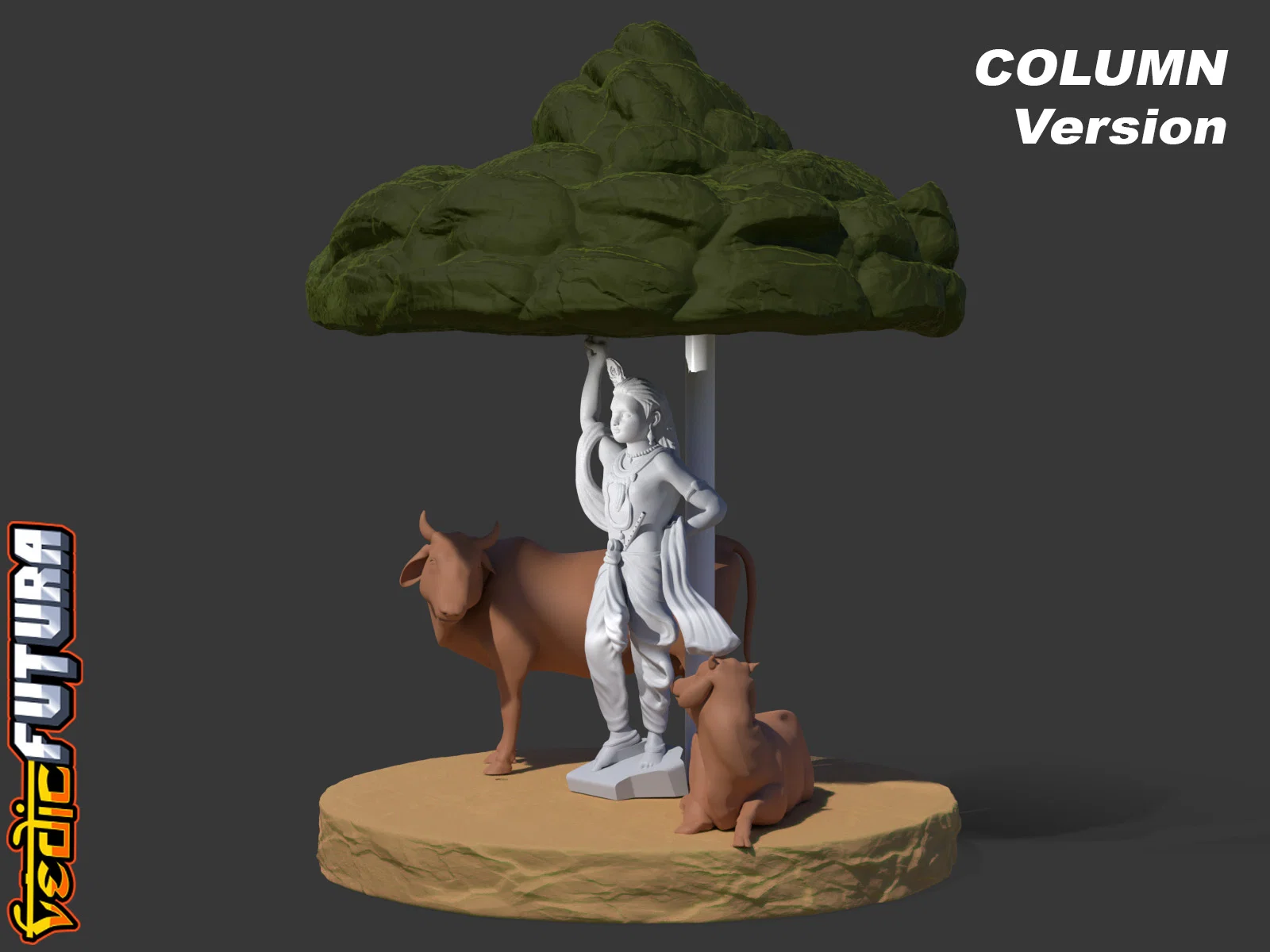 Mẫu 3D tái hiện cảnh Krishna nâng đồi Govardhan để che chở dân Vrindavan. Frame và Mountain in chung, dùng string vừa đỡ vừa tạo hiệu ứng mưa; Krishna và bò in riêng đặt bên dưới. Có thêm bản đỡ bằng cột.