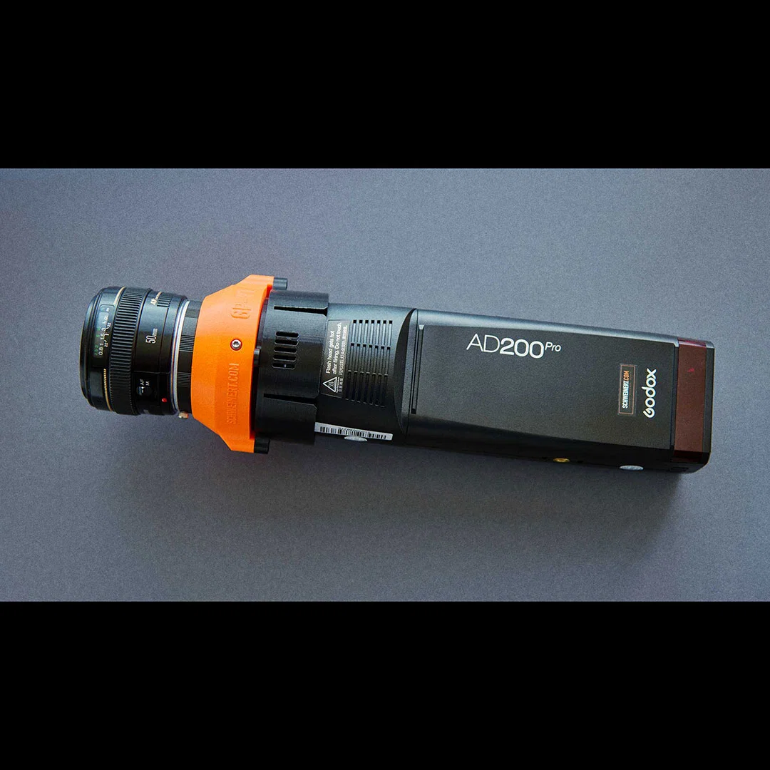 Gobo projector nhỏ gọn cho Godox V1, AD100 PRO, AD200 PRO dùng với đầu tròn H200R, tiện mang đi chụp On-Location. In không cần supports (theo hình), khuyến nghị PETG để ôm khít flash; có kèm file STEP.