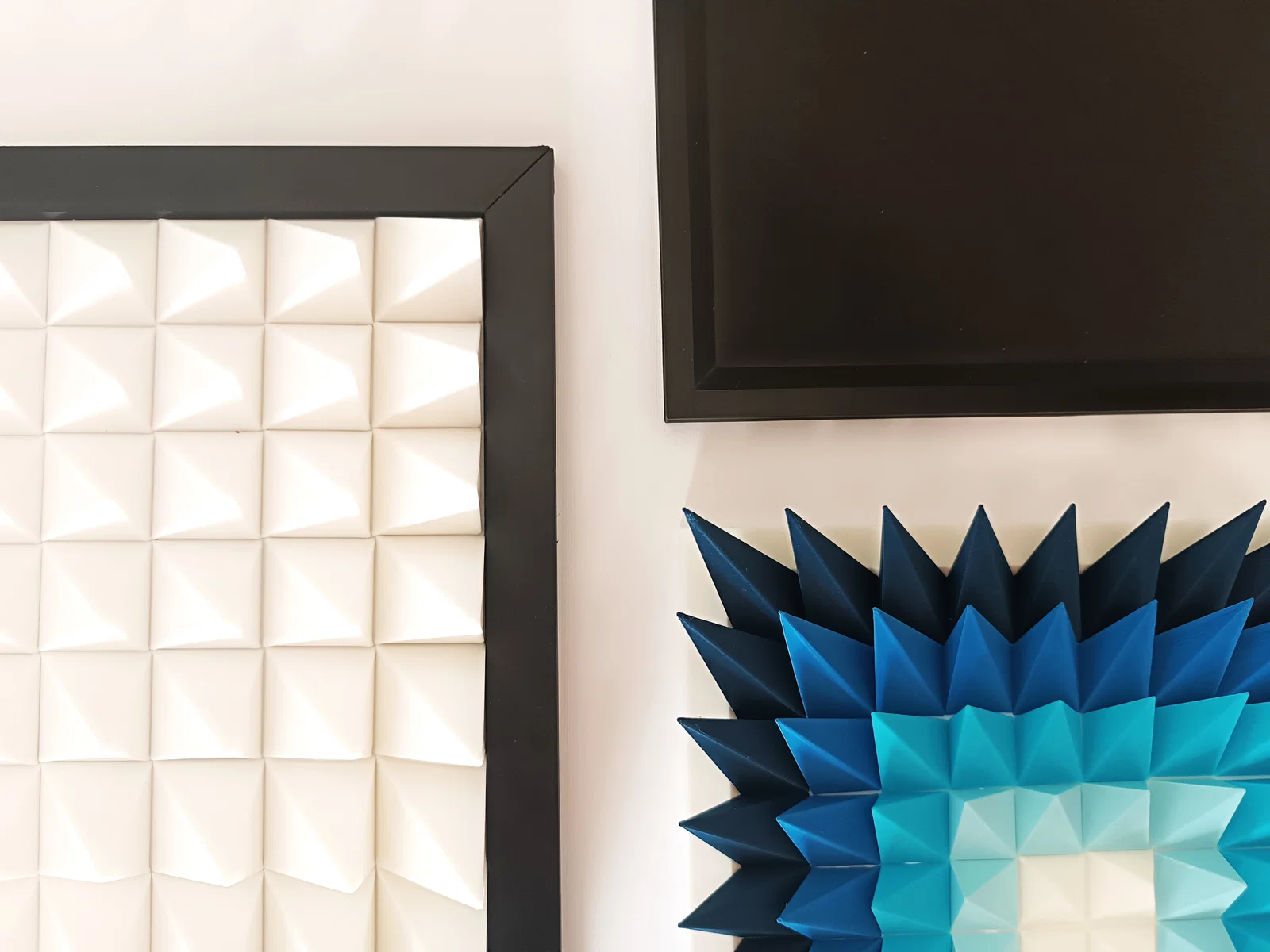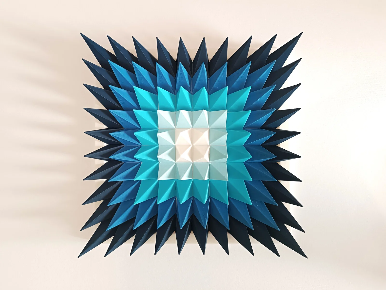 Mình vừa thiết kế một mẫu 3D Wall Sculpture mới gồm 100 khối chóp (pyramids), nhìn giống hình dáng của mặt nước khi một giọt rơi xuống 💧. Lần này cũng vậy, mỗi khối chóp đều là duy nhất, được đánh số ở mặt đáy từ 0 đến 99 và có hình dạng khác nhau theo một công thức toán học trong không gian.