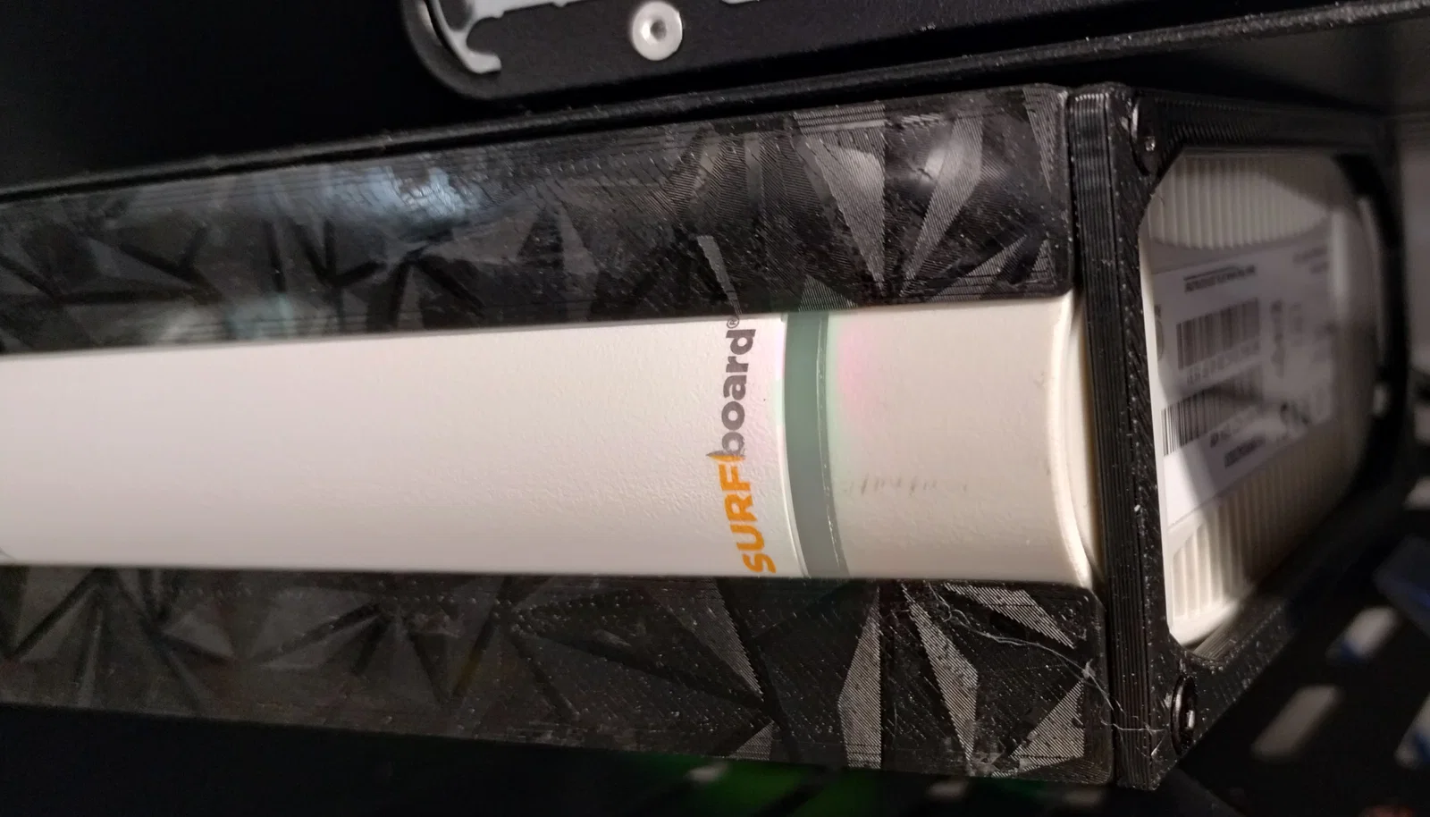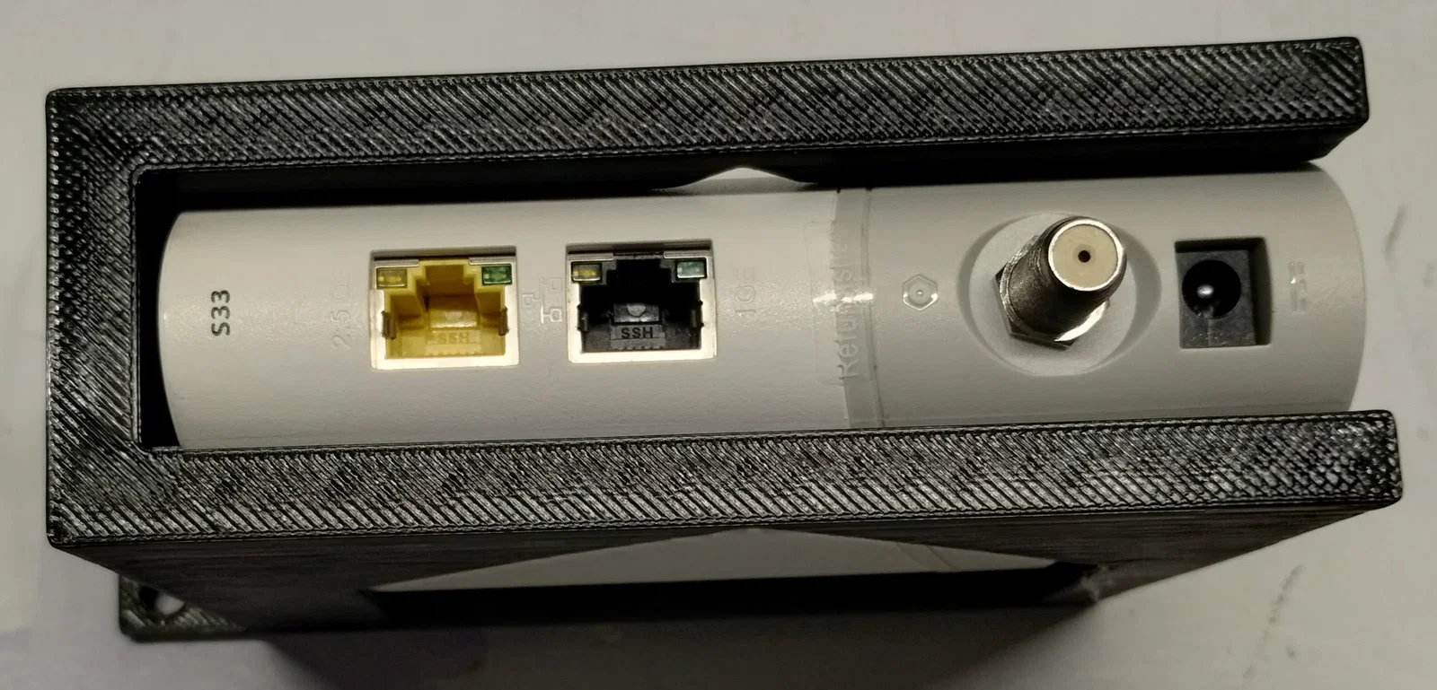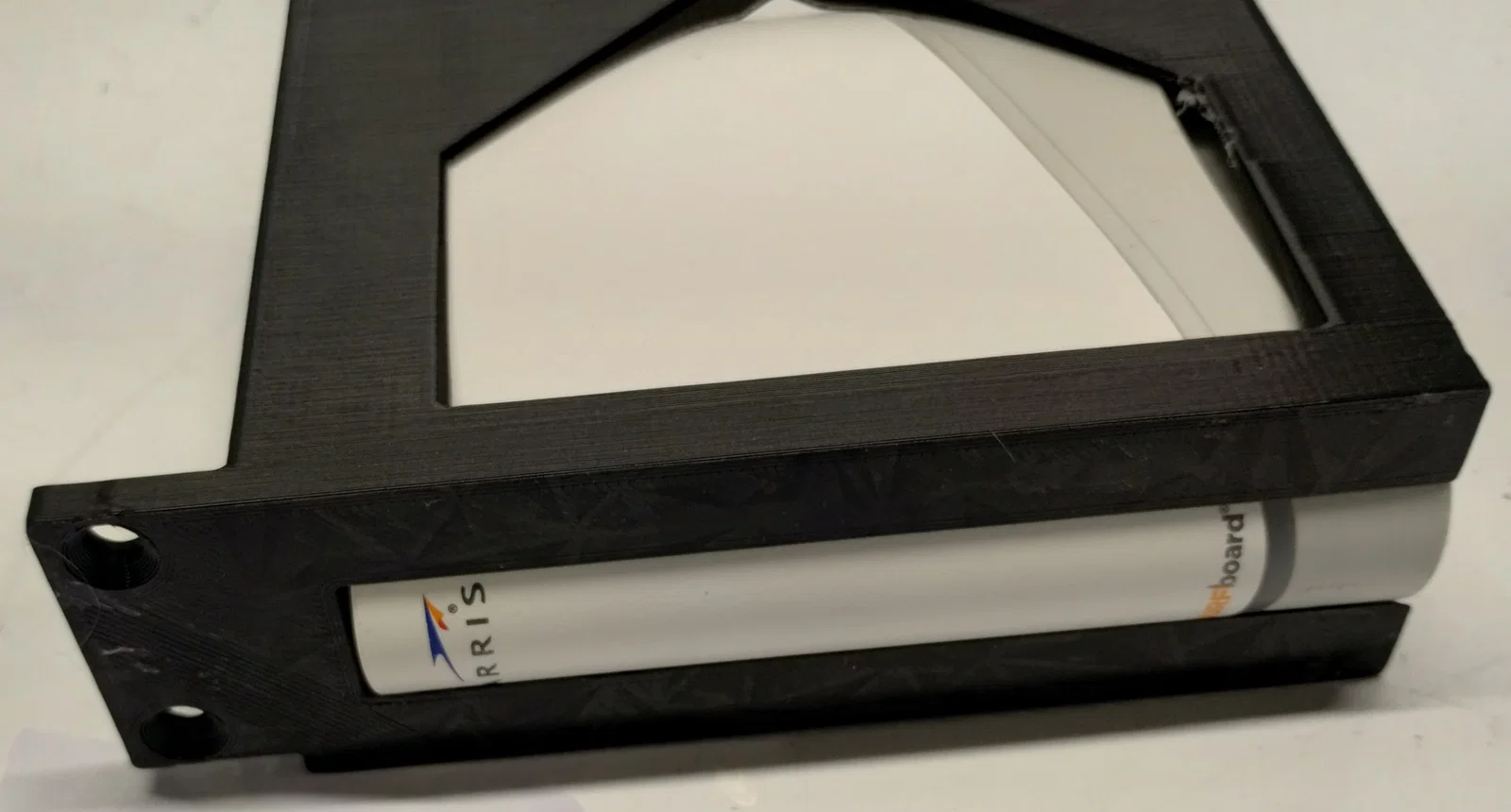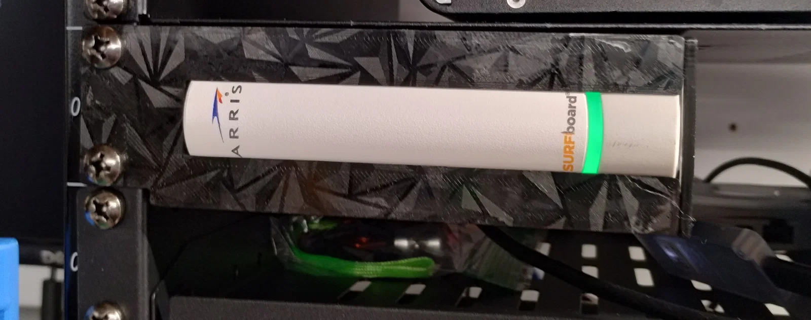 Đây là bộ ngàm gắn lên server rack cho modem cáp Arris Surfboard S33. Thiết kế để in không cần supports. Mình cố tình chừa nhiều khoảng hở để nhiệt bên trong modem thoát ra. Con modem này có hình dáng khá “khó ở”, lại rất nhẹ nên hay không chịu nằm yên; thêm cái dây coax lúc nào cũng có vẻ muốn làm nó bị nghiêng đổ.