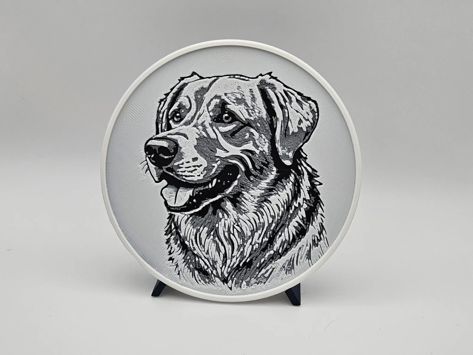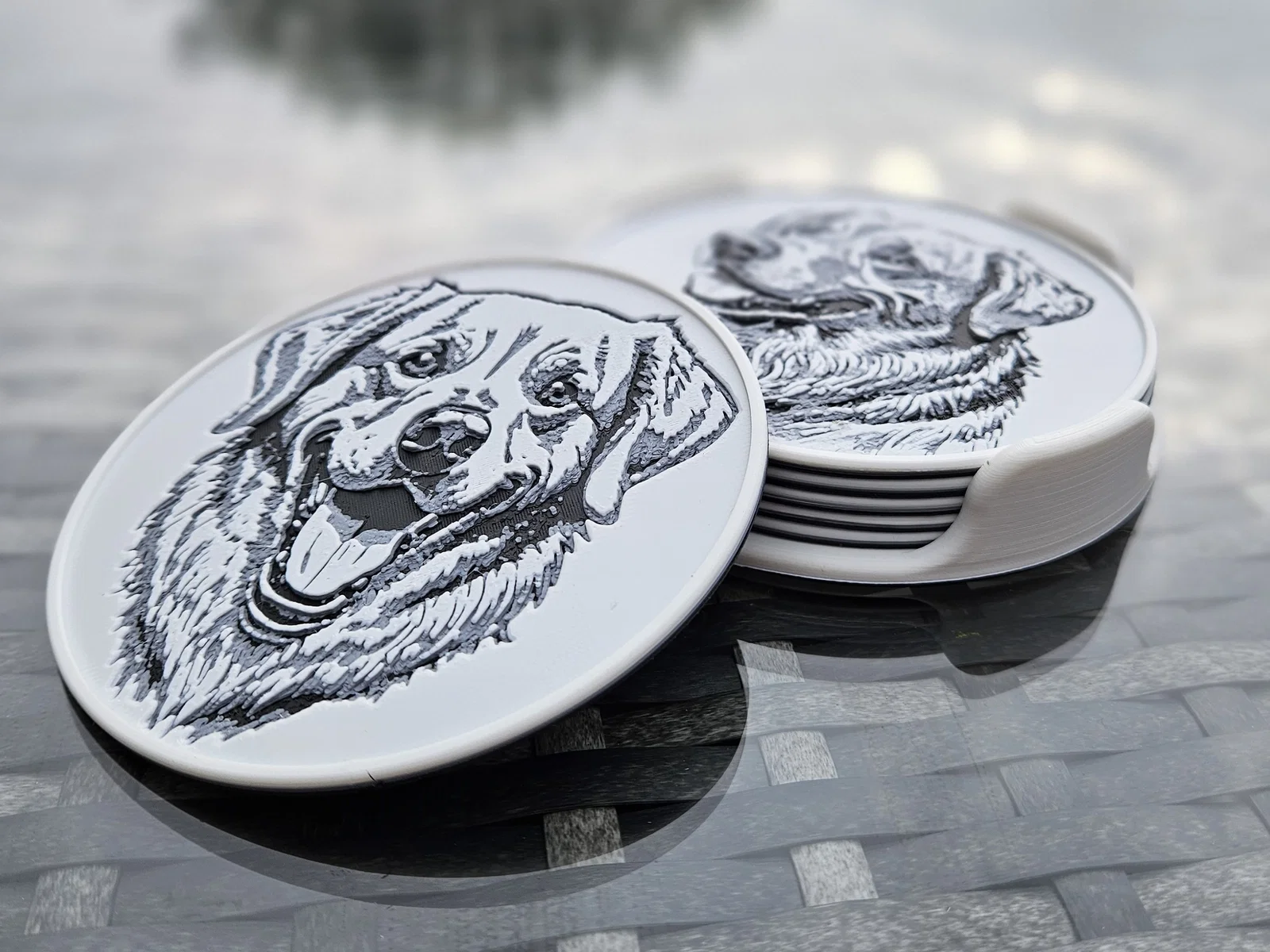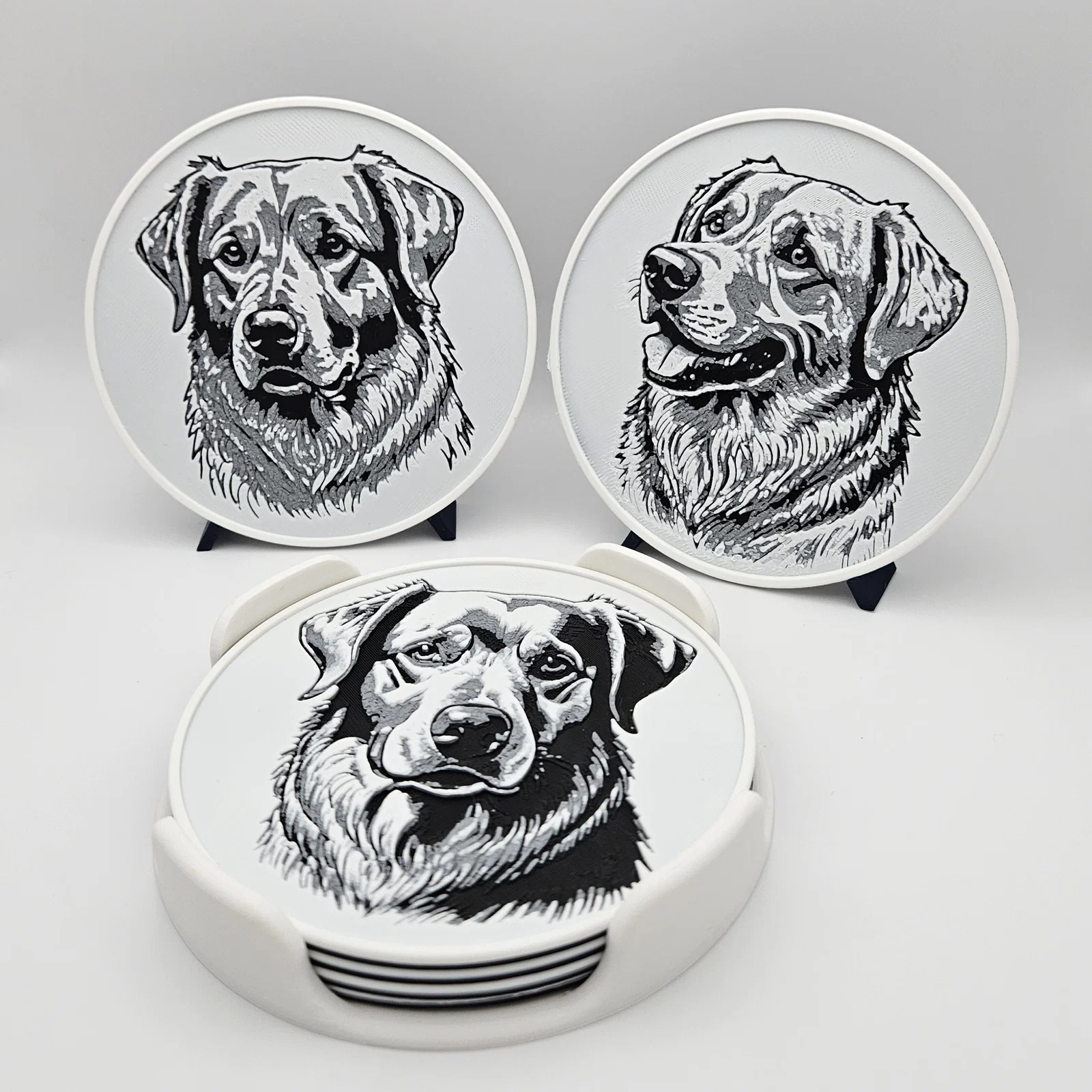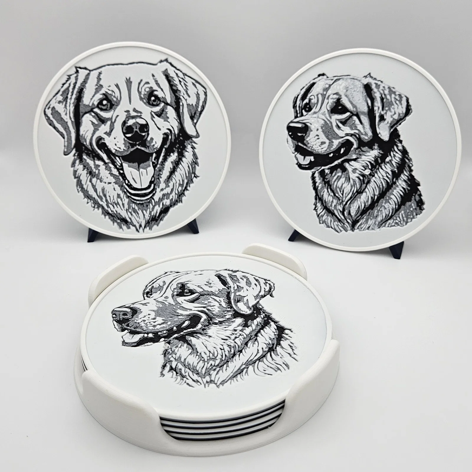 Bộ 6 miếng lót ly in Hueforge với tranh phác họa nhiều bé Golden Retriever khác nhau, kèm giá/khay đựng. Chỉ cần 2 lần đổi filament (không cần MMU/AMS). Có thể phủ UV resin trong suốt để tăng độ bền và đẹp.