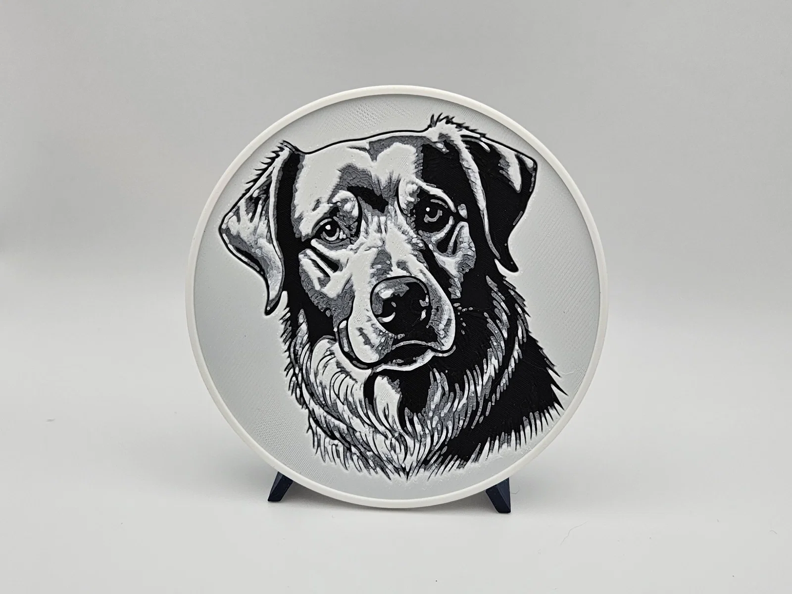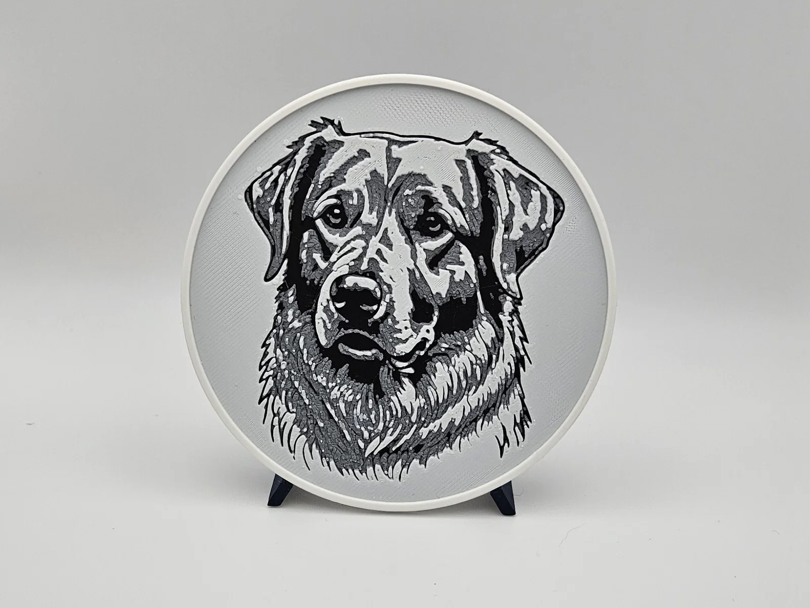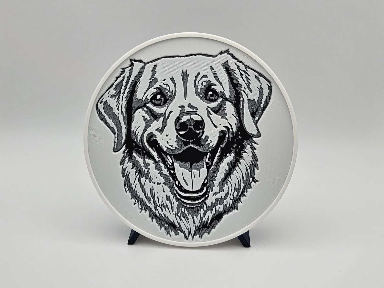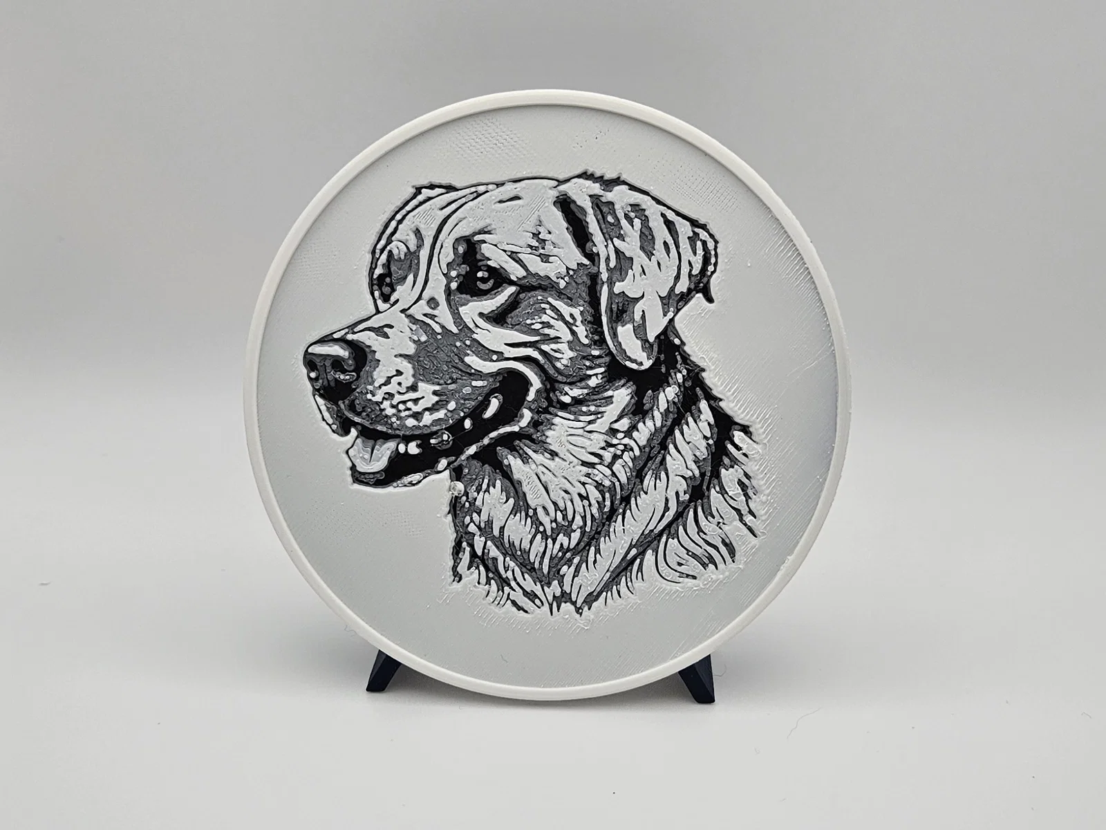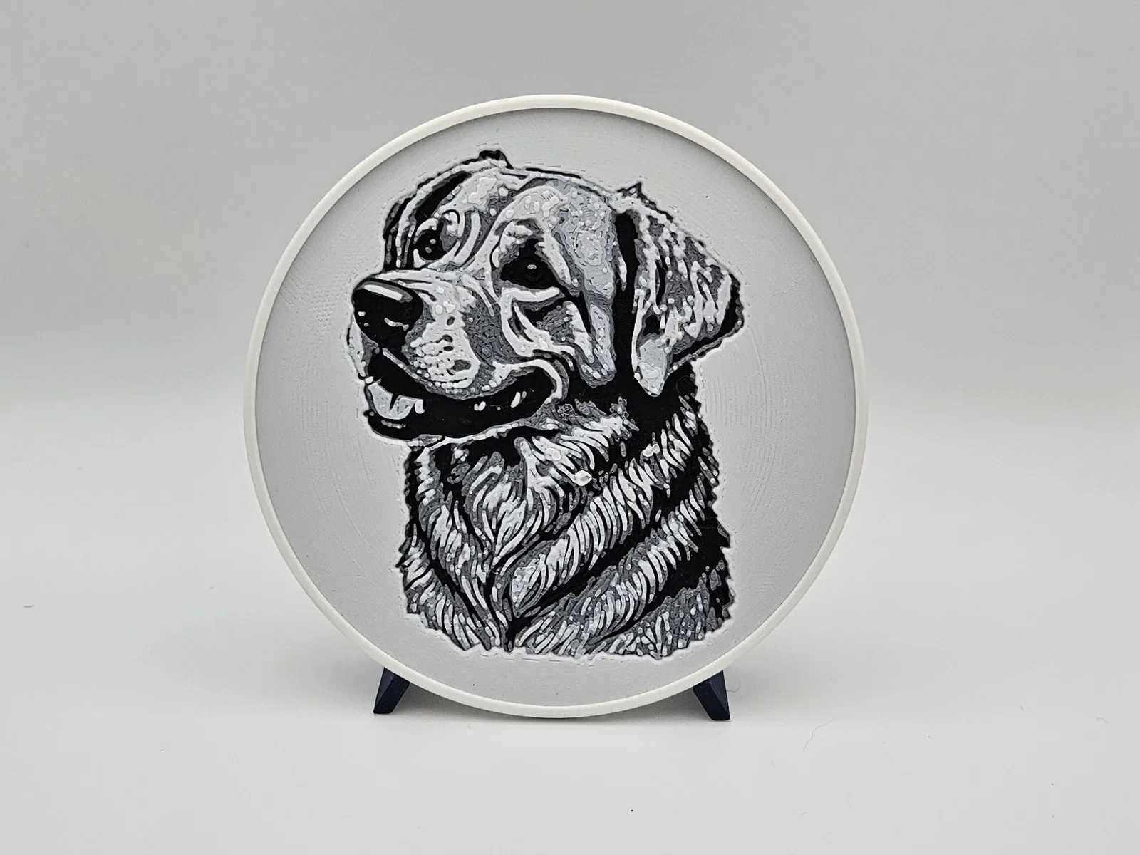 Bộ 6 miếng lót ly in Hueforge với tranh phác họa nhiều bé Golden Retriever khác nhau, kèm giá/khay đựng. Chỉ cần 2 lần đổi filament (không cần MMU/AMS). Có thể phủ UV resin trong suốt để tăng độ bền và đẹp.
