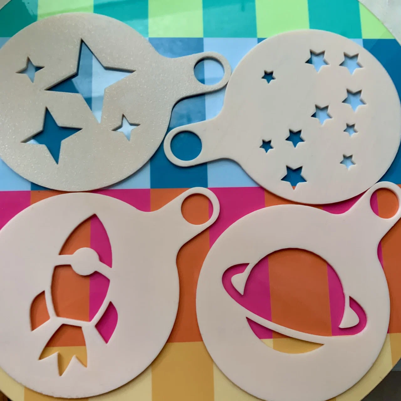 Bộ 4 stencil chủ đề không gian giúp tạo latte art/hot cocoa art nhanh gọn: tên lửa, Sao Thổ, chòm sao và các ngôi sao phong cách mid-century. Dùng rắc bột lên cappuccino/latte để trang trí ly uống mỗi sáng.