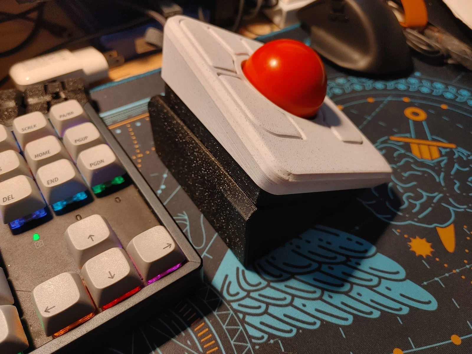 Cái wedge này dùng các lỗ bắt vít trên phần đế Adept để định vị và giữ chặt Ploopy Adept. Nó có khe hở (clearance) 0.2mm giữa các chốt và phần đế.
