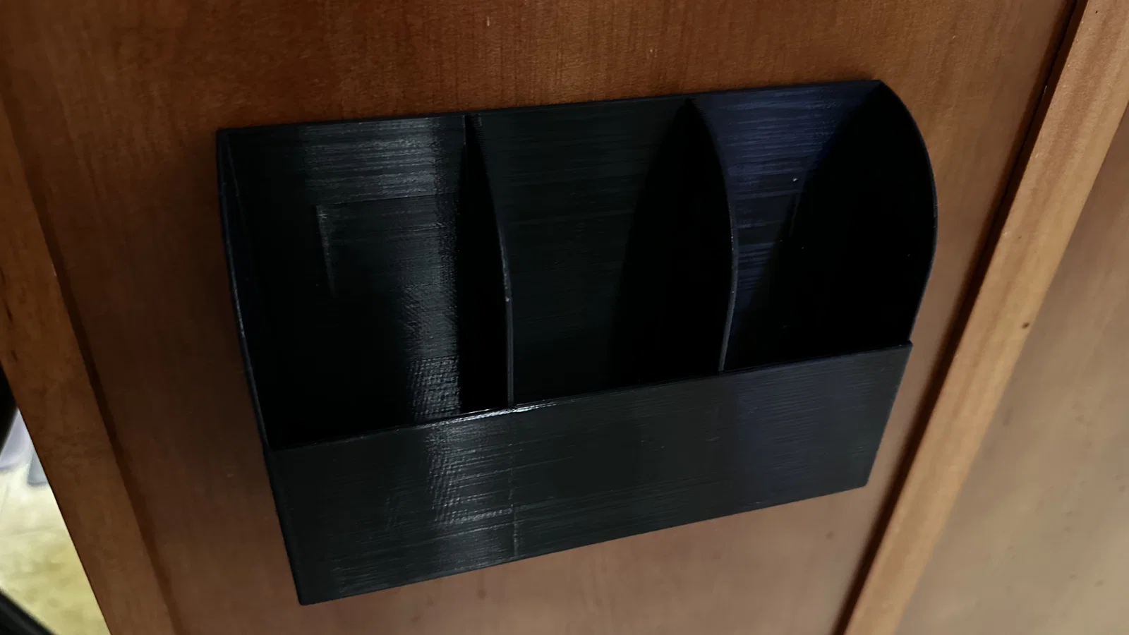 Khay treo tường để remote với 3 khe. Mặt sau có thêm 2 hốc để dán băng keo hai mặt khi gắn lên tường. Rất hợp cho trường hợp bạn không muốn hoặc không thể khoan tường. Mình cũng bo tròn (fillet) hết các cạnh để khỏi bị trầy xước vì cạnh sắc. Không hiểu sao nhiều mẫu in thiên về công năng lại không làm vậy.
