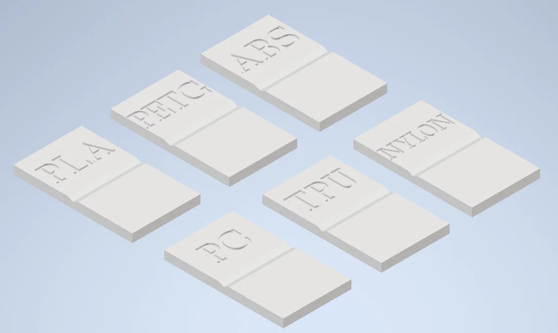Bộ mẫu dùng để test và so sánh độ bền giữa nhiều loại filament (PLA, ABS, PETG, TPU...). In từng tấm với cùng slicer settings, rồi bẻ bằng tay để cảm nhận khác biệt và chọn vật liệu phù hợp.