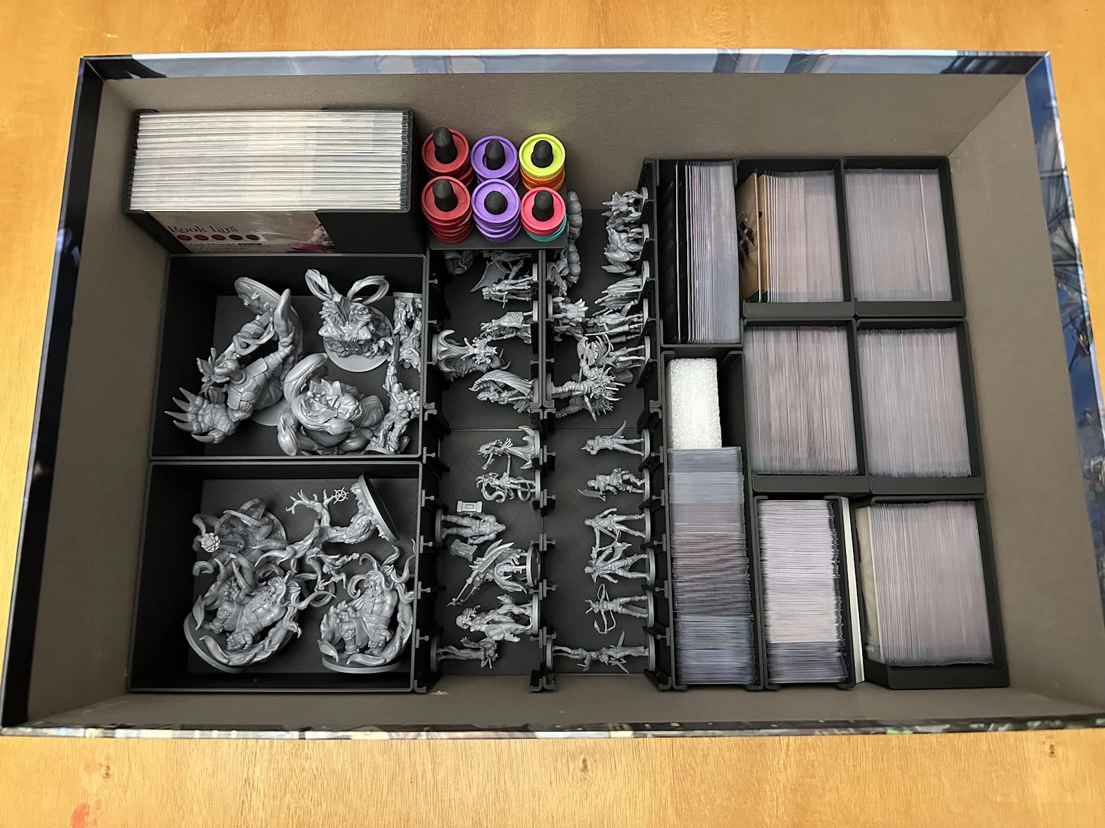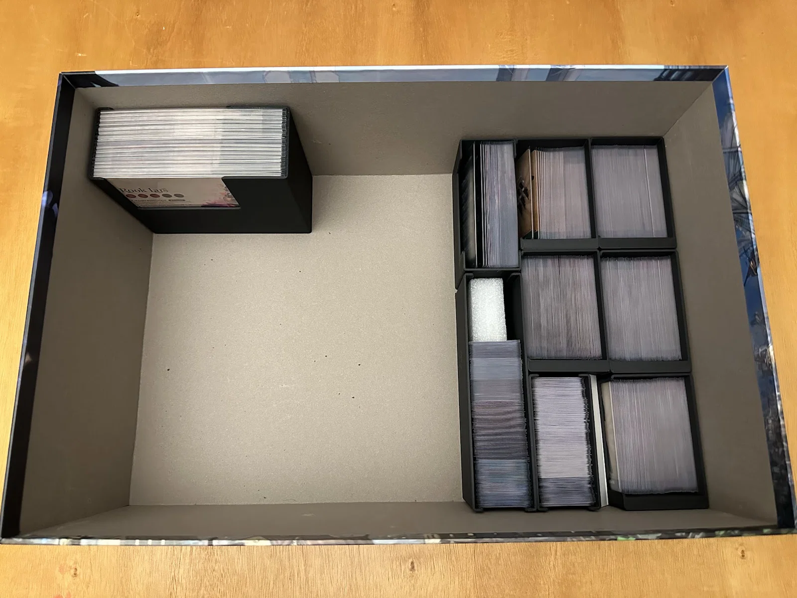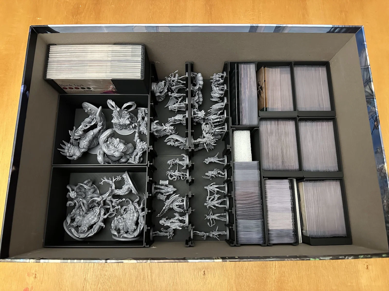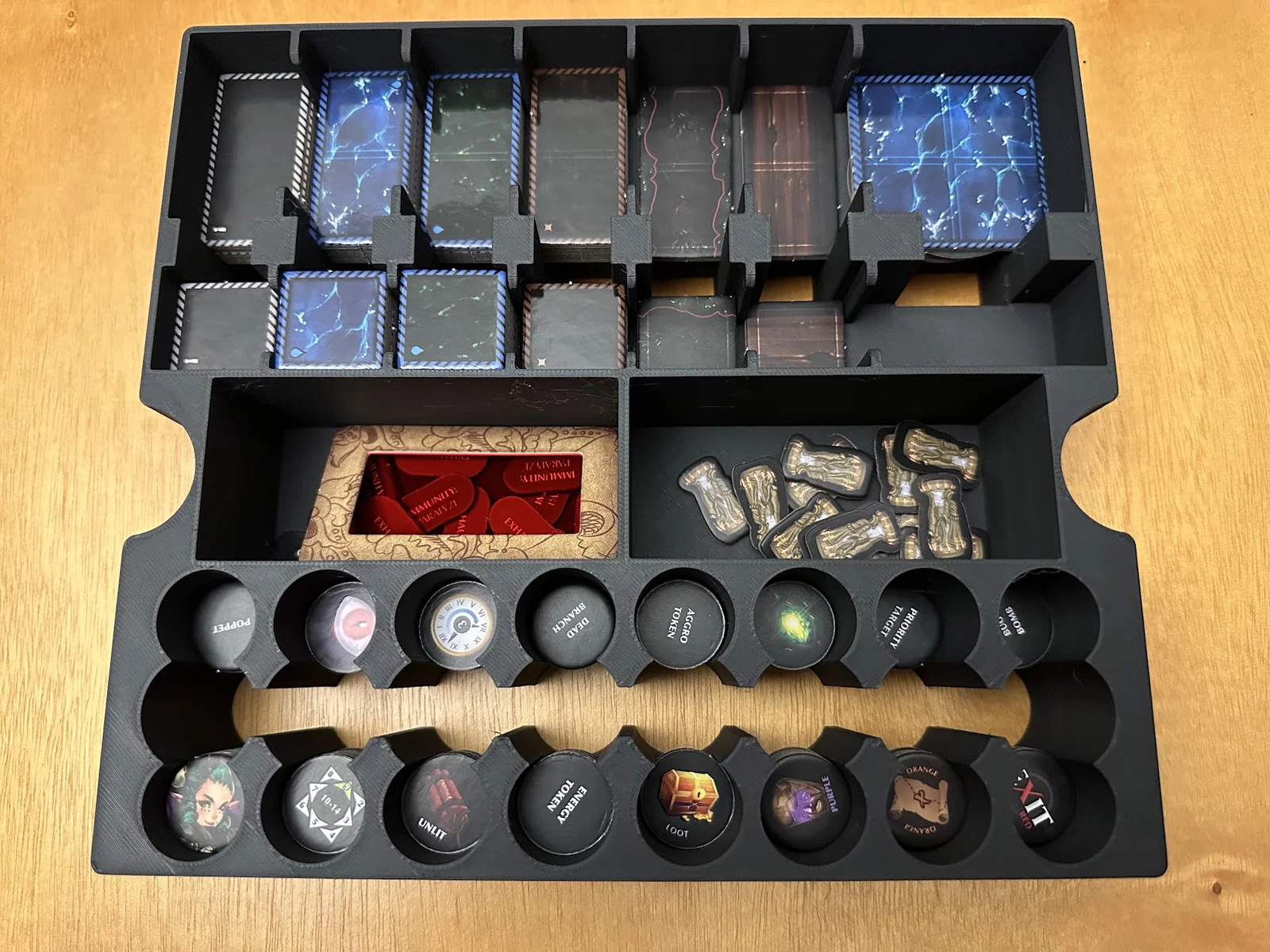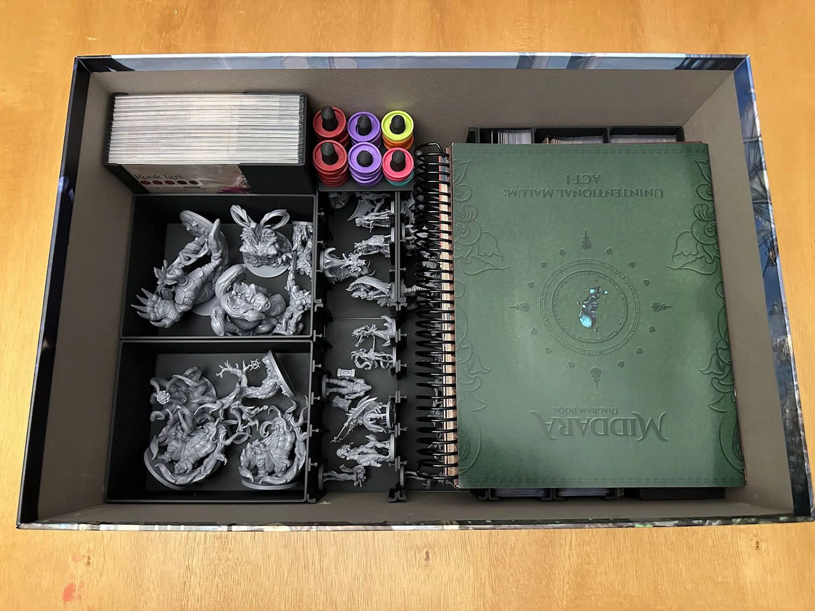 Insert này cho phép để vừa sách/scenario của Act I, maps, minis, standees và các bộ bài đã bọc sleeve mà không bị đội nắp (no lid lift). Mình để các lá medium cards tách theo độ hiếm (rarity), mỗi khay 1 loại, và khay thứ 5 chứa phần bài còn lại.