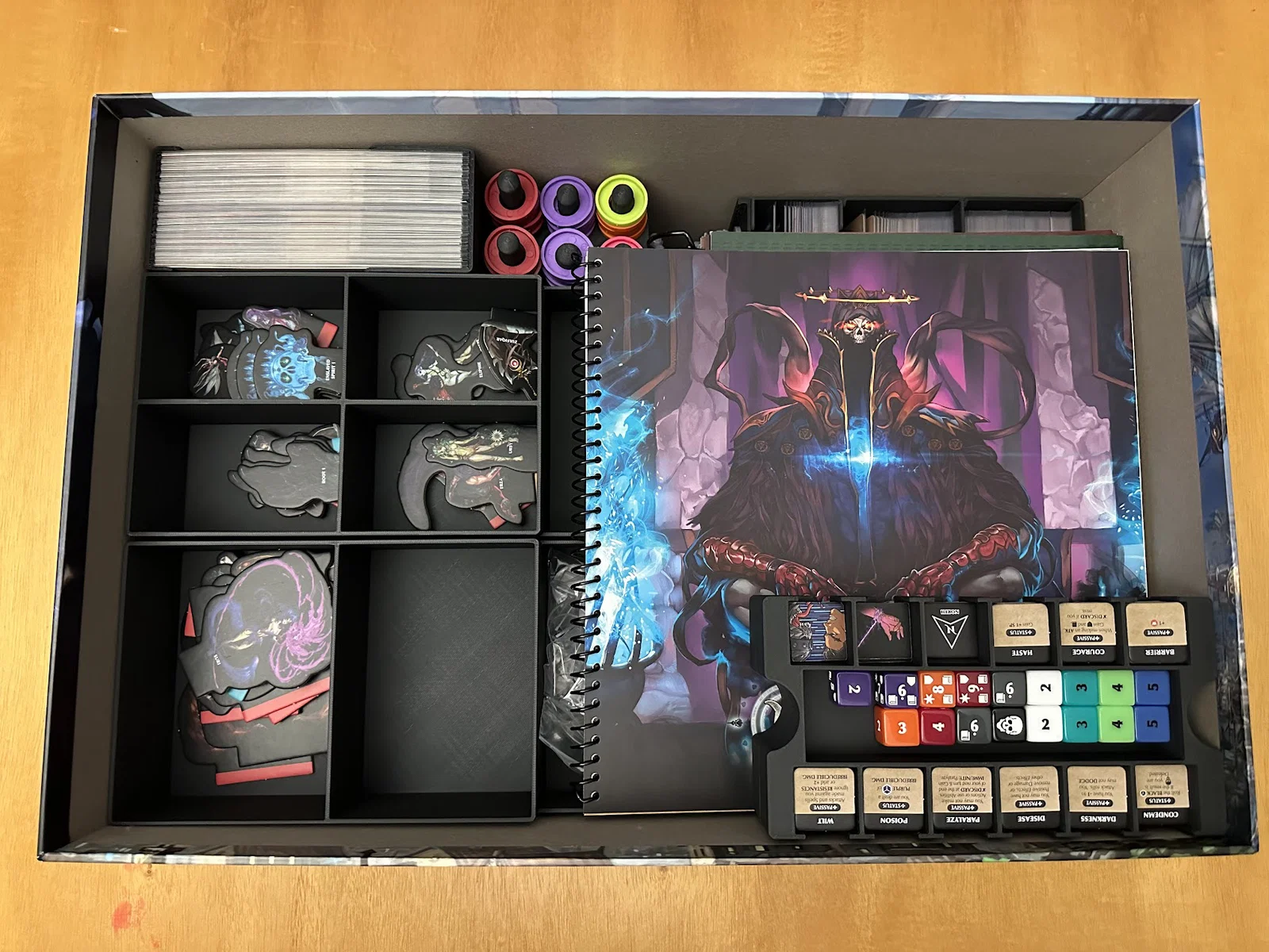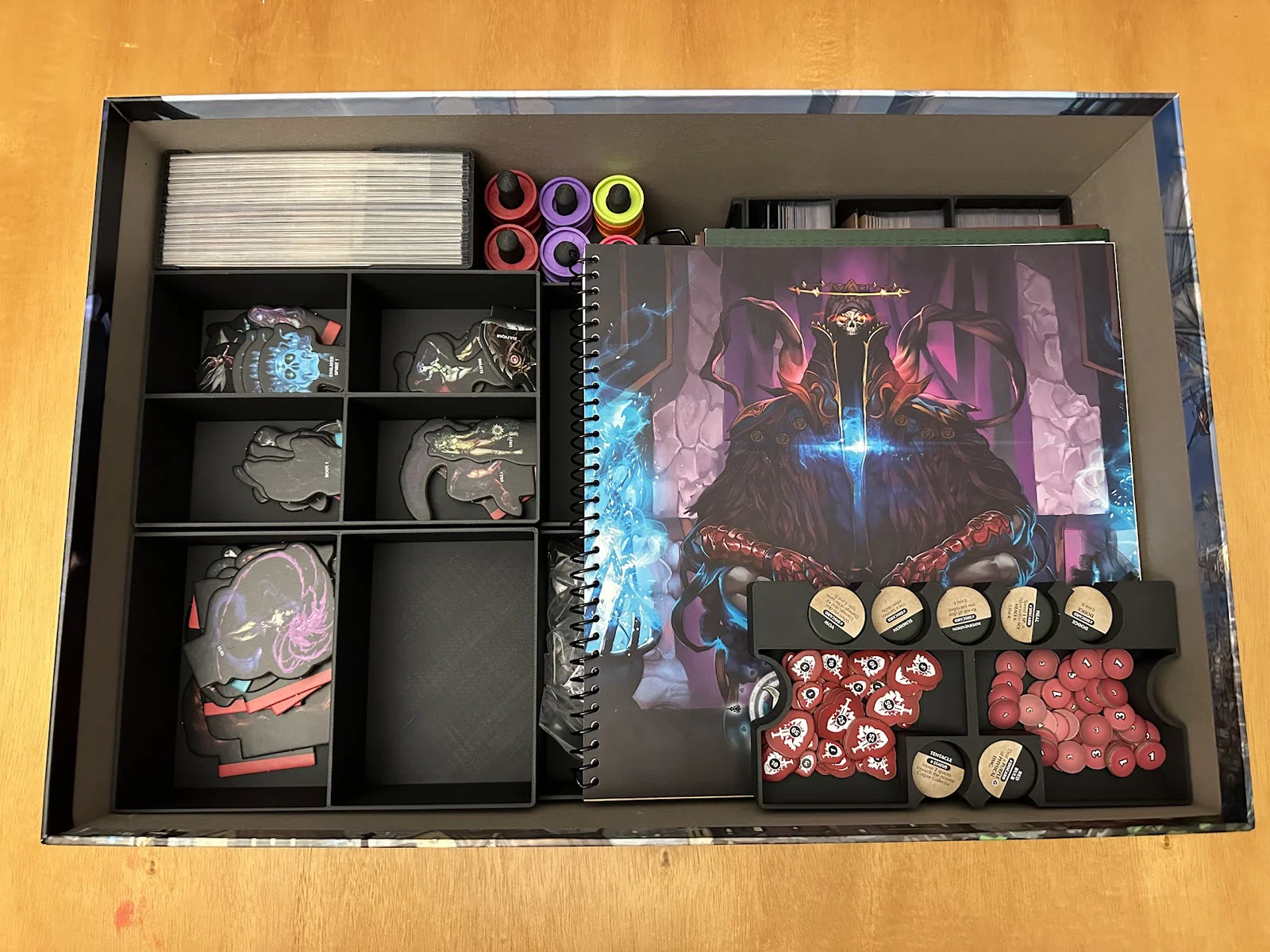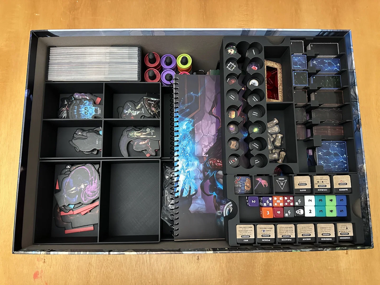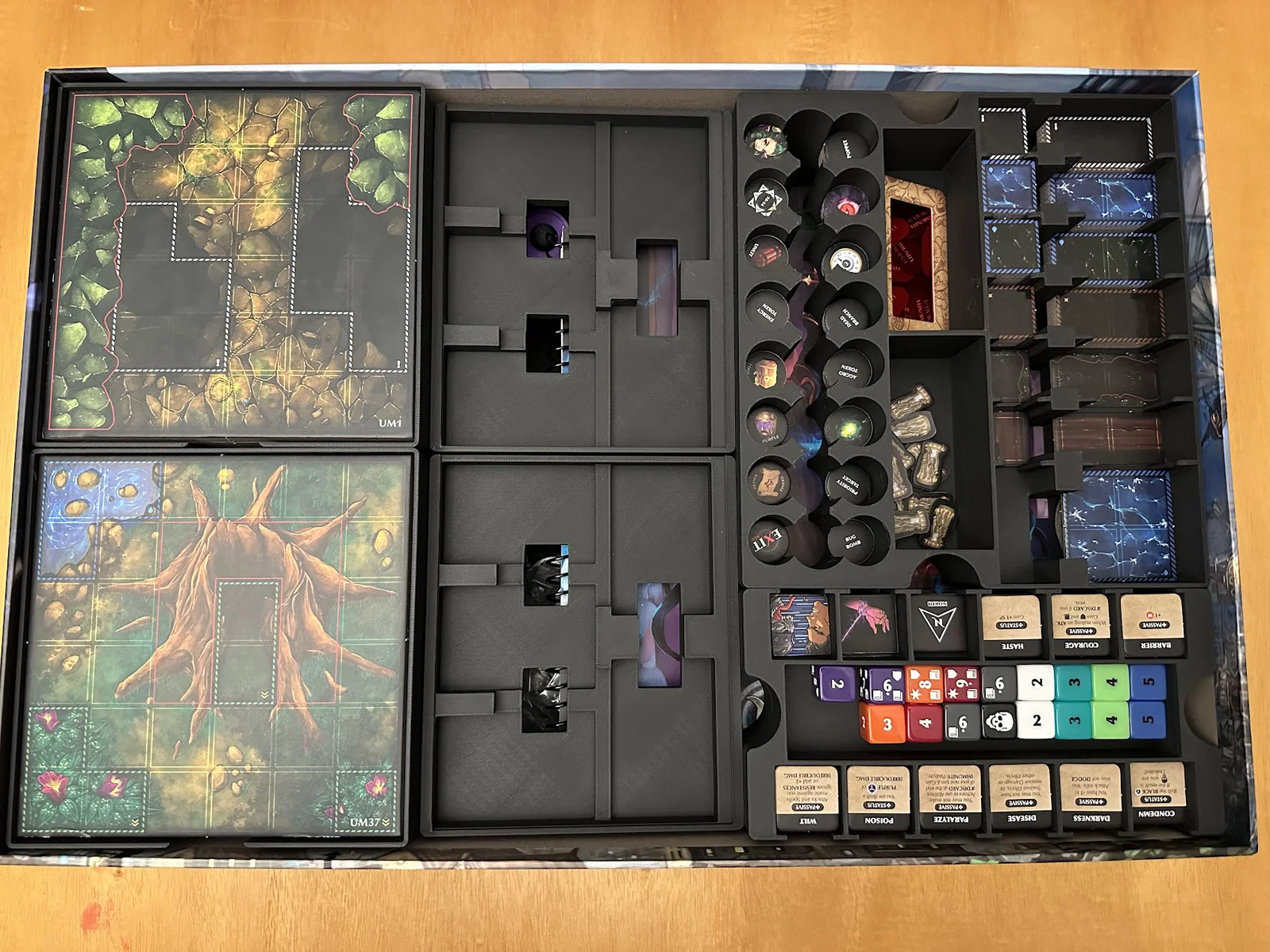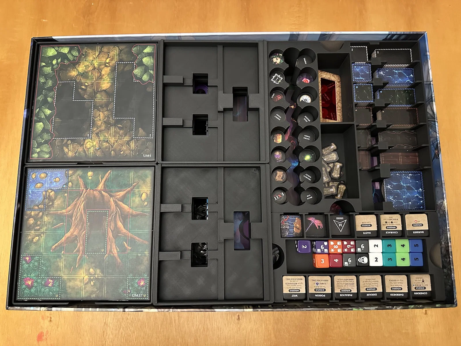 Insert này cho phép để vừa sách/scenario của Act I, maps, minis, standees và các bộ bài đã bọc sleeve mà không bị đội nắp (no lid lift). Mình để các lá medium cards tách theo độ hiếm (rarity), mỗi khay 1 loại, và khay thứ 5 chứa phần bài còn lại.