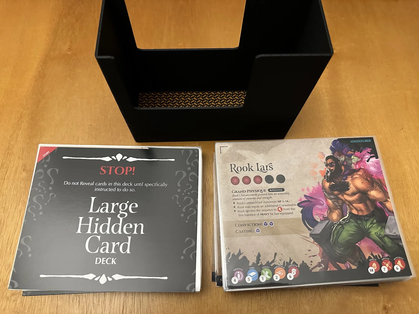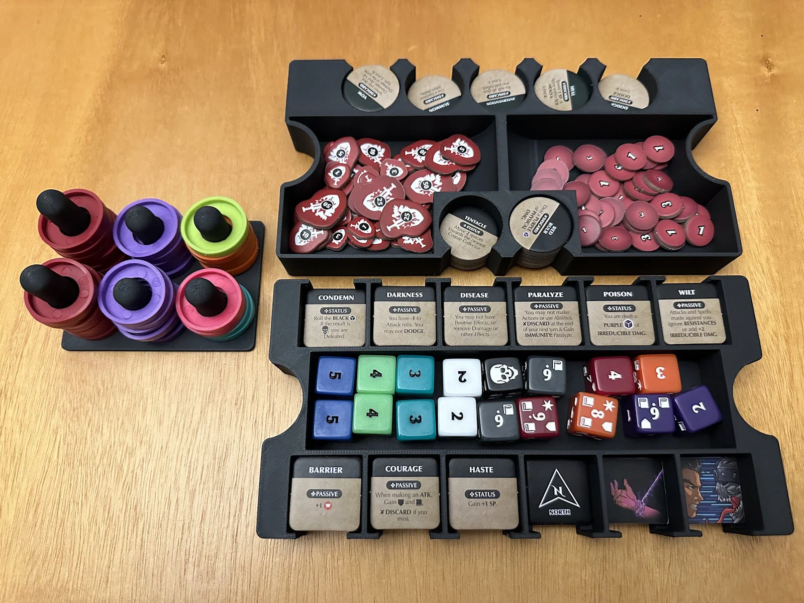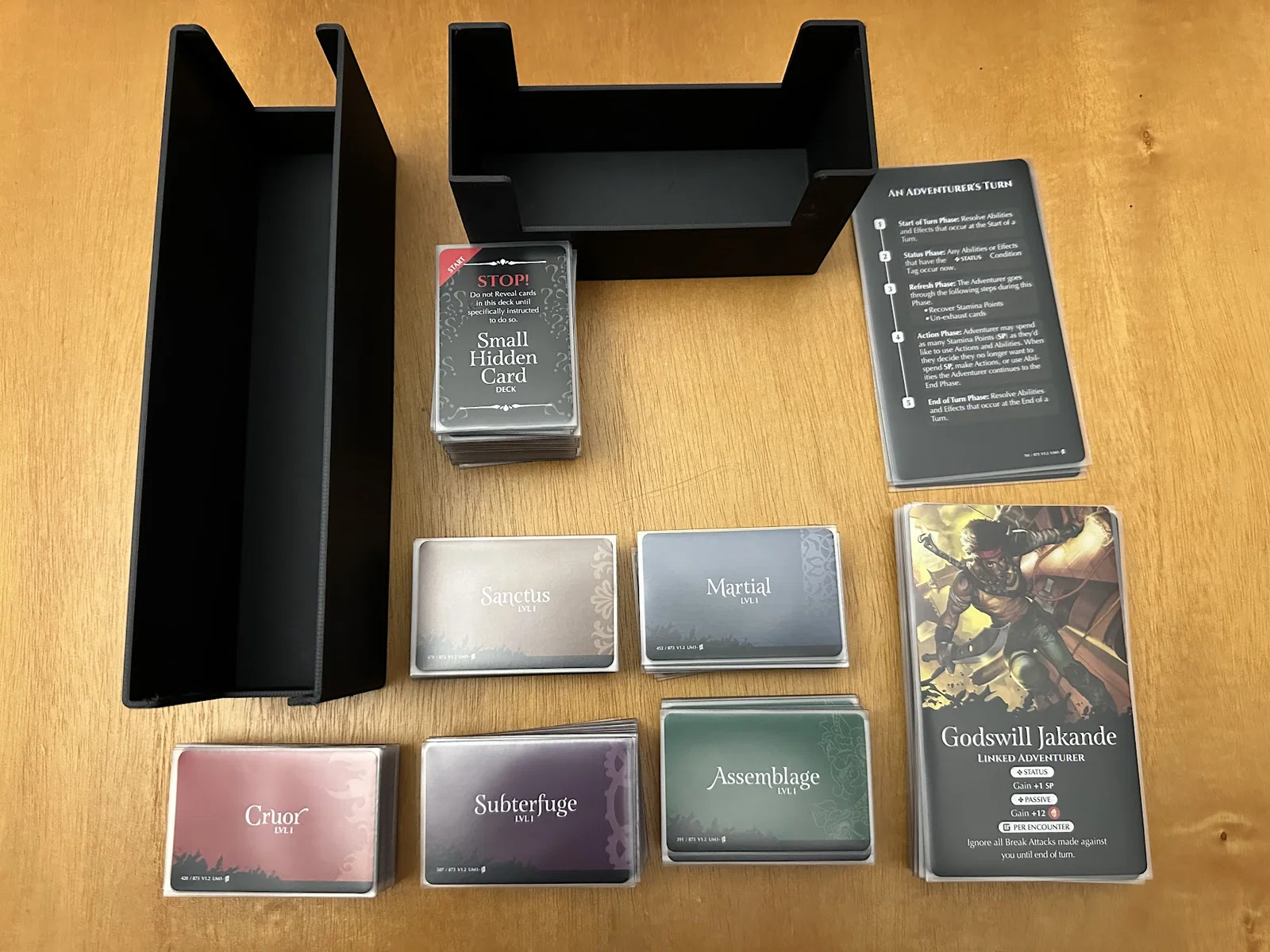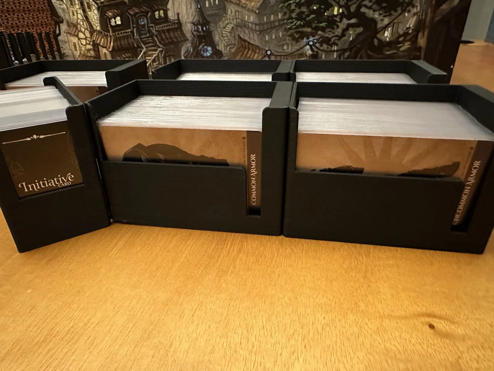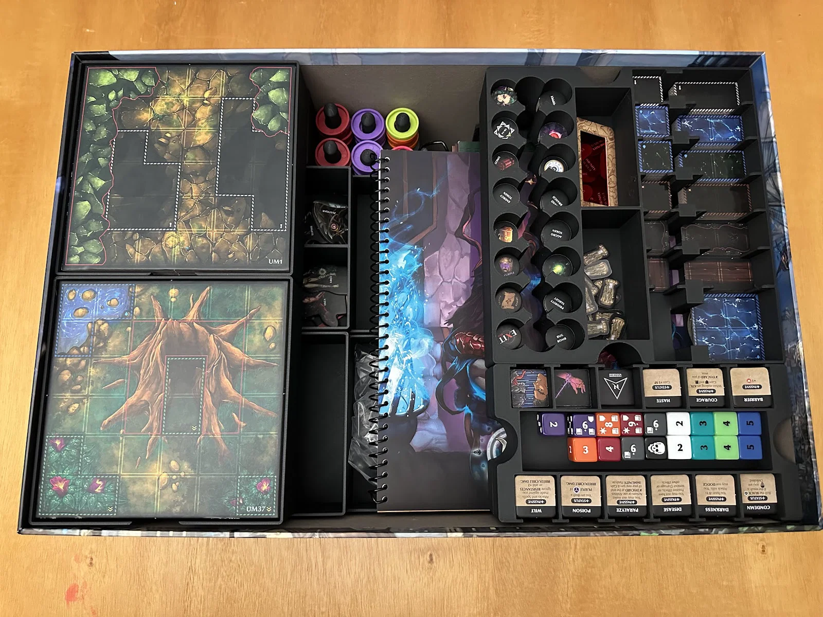 Insert này cho phép để vừa sách/scenario của Act I, maps, minis, standees và các bộ bài đã bọc sleeve mà không bị đội nắp (no lid lift). Mình để các lá medium cards tách theo độ hiếm (rarity), mỗi khay 1 loại, và khay thứ 5 chứa phần bài còn lại.