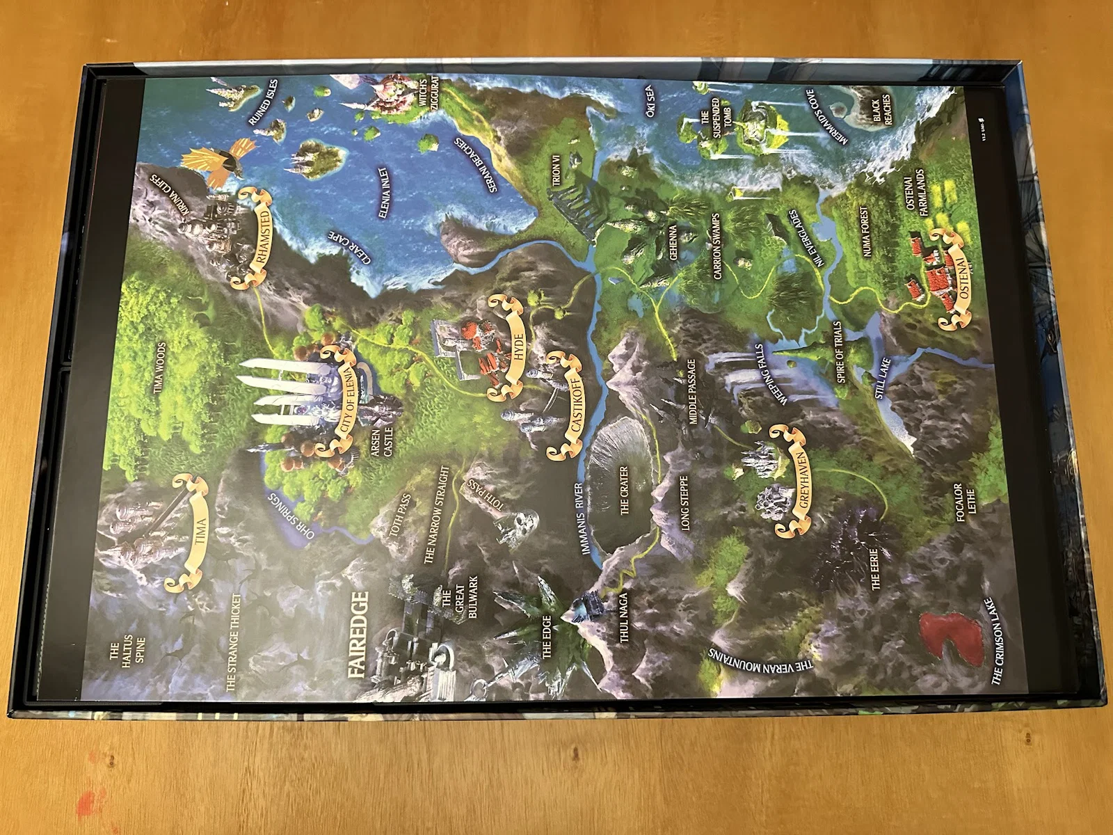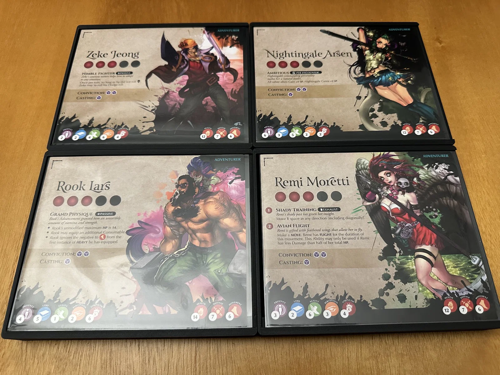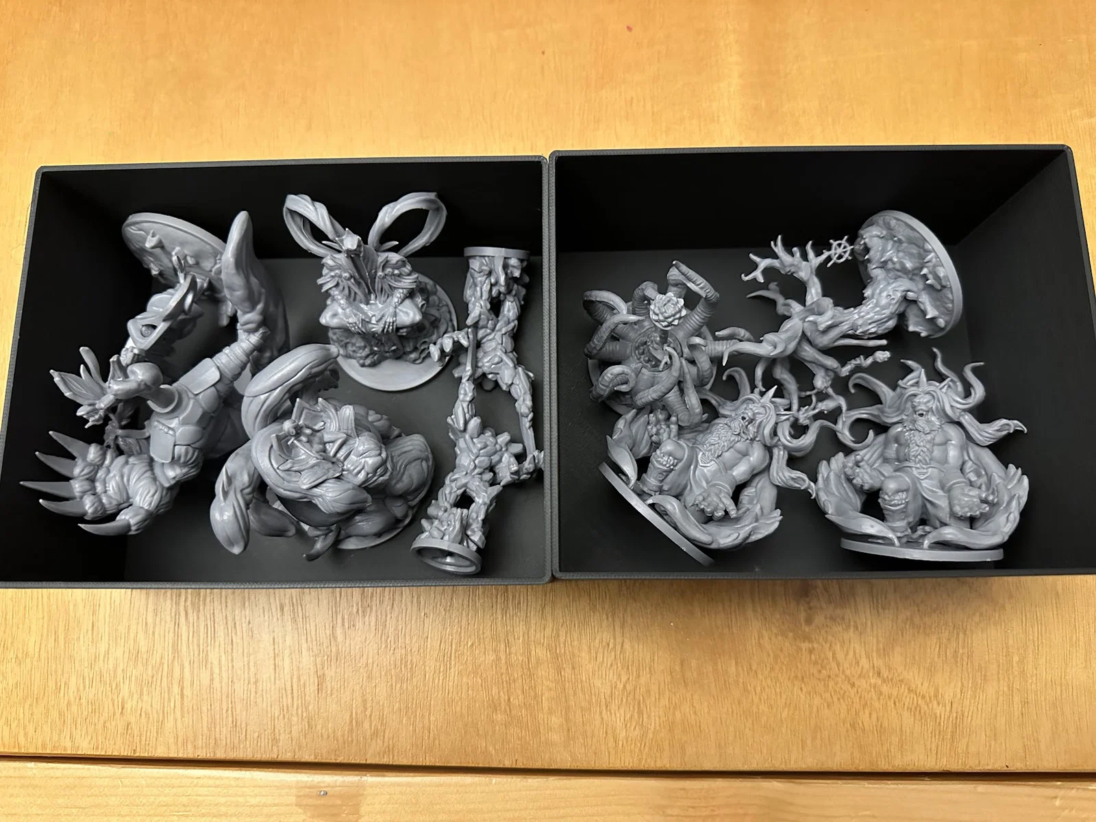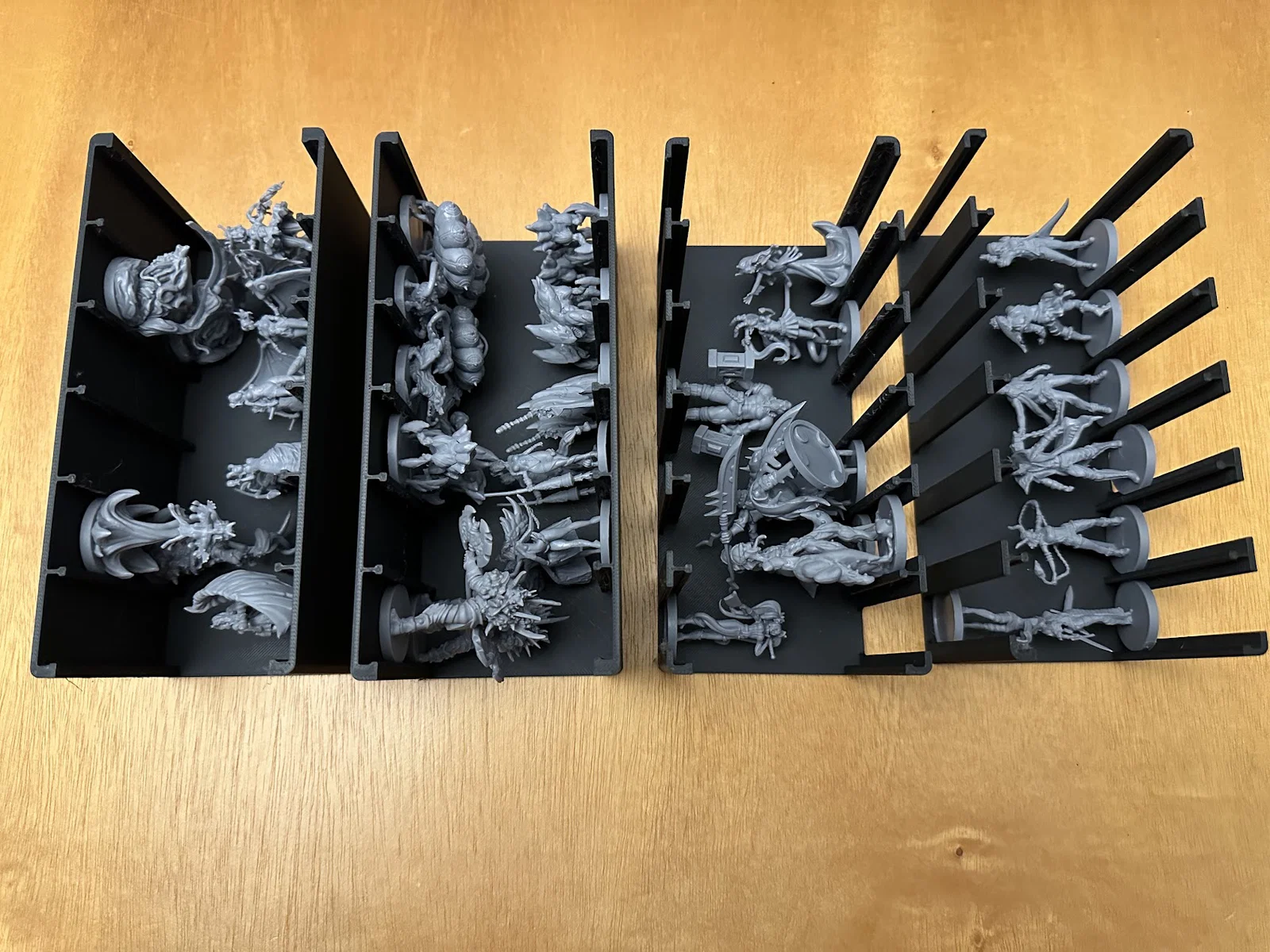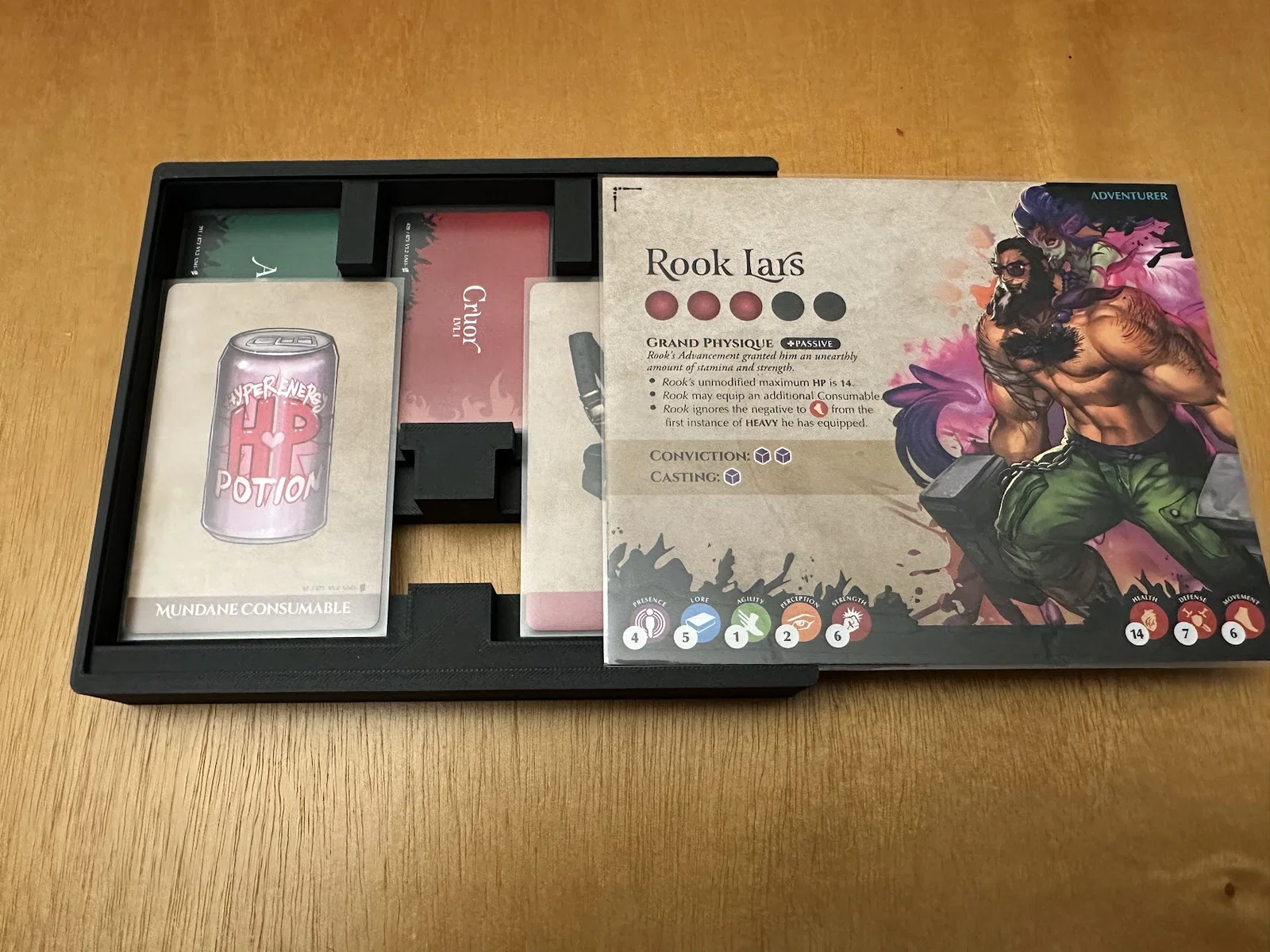 Insert này cho phép để vừa sách/scenario của Act I, maps, minis, standees và các bộ bài đã bọc sleeve mà không bị đội nắp (no lid lift). Mình để các lá medium cards tách theo độ hiếm (rarity), mỗi khay 1 loại, và khay thứ 5 chứa phần bài còn lại.