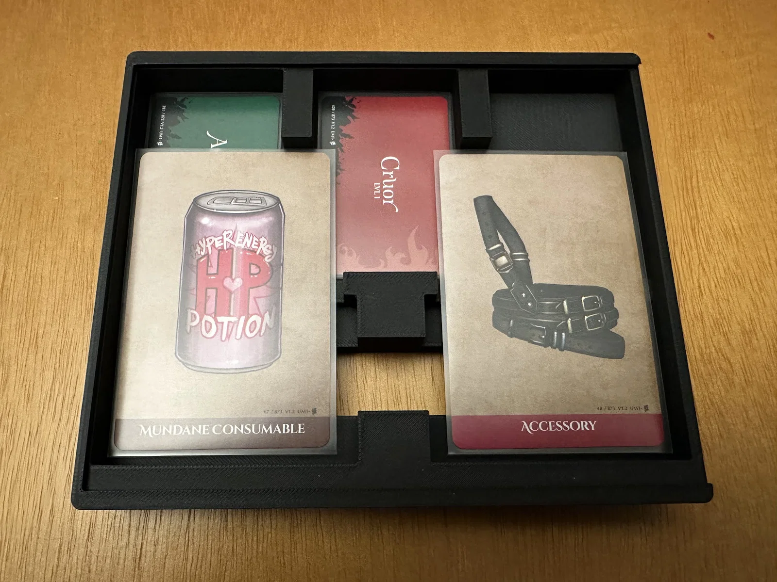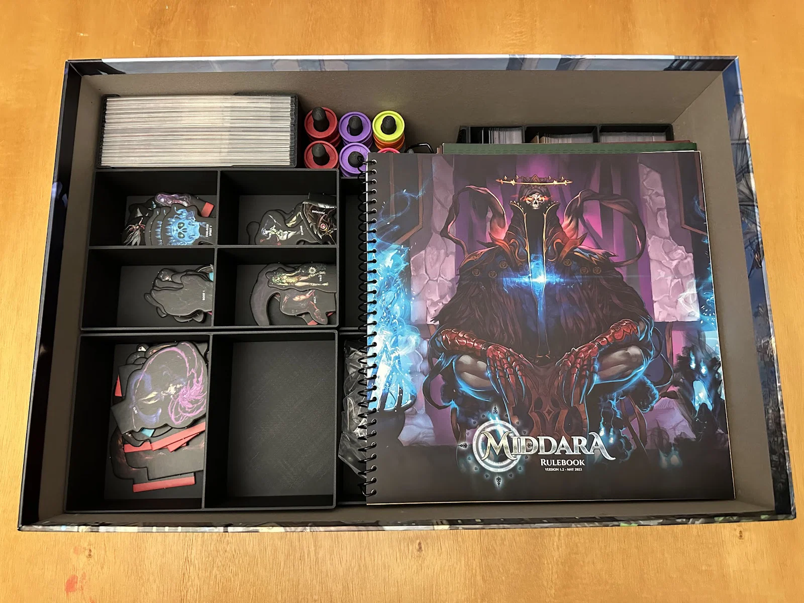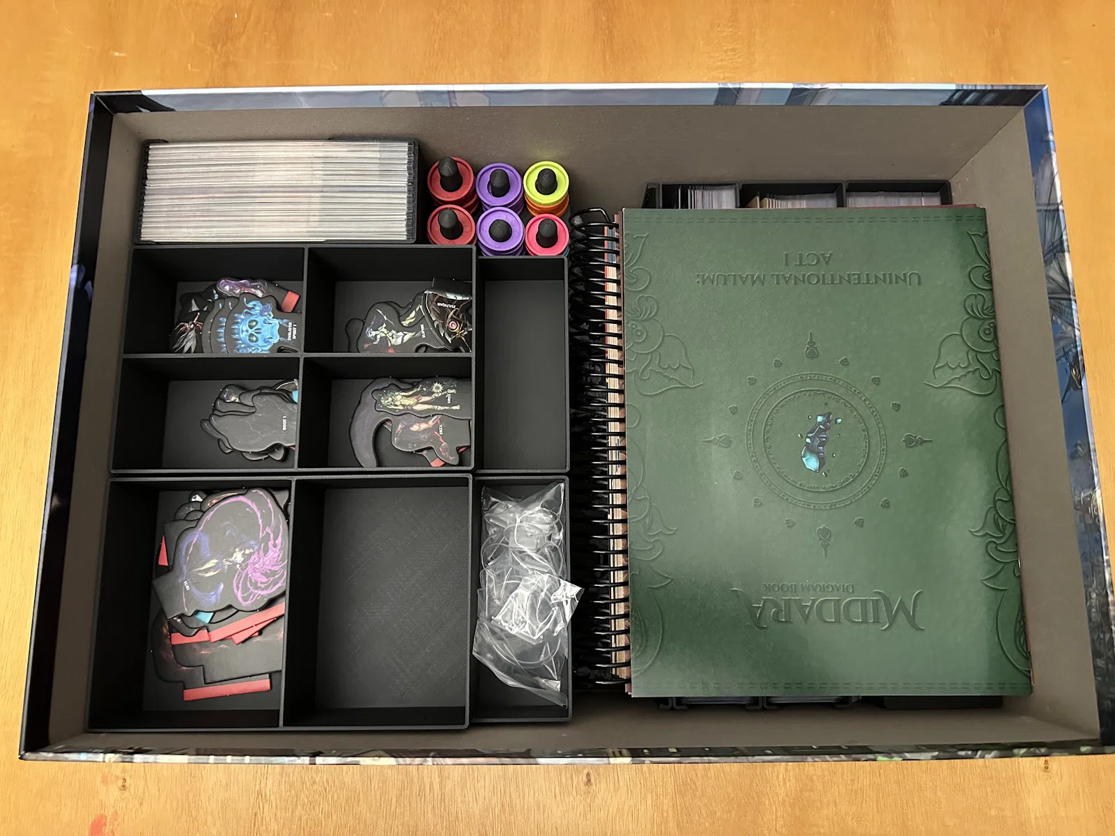 Đây là một bộ insert dành cho bản in 1.2 của Middara Unintentional Malum: Act I. Bản in mới nhất có insert được cập nhật, tuy nhiên các hộc để bài (card wells) không hỗ trợ bọc sleeve và mình muốn cất mọi thứ theo cách giúp setup và dọn lại nhanh hơn. Mình cũng có KS Promo pack 1, nhưng ngoài ra không có sản phẩm nào khác xuất hiện ở đây. Vẫn còn rất nhiều chỗ cho thêm minis, standees, cards, bags và tokens, nên mình hy vọng insert này sẽ hỗ trợ các sản phẩm bổ sung khác sắp ra cho Act I.