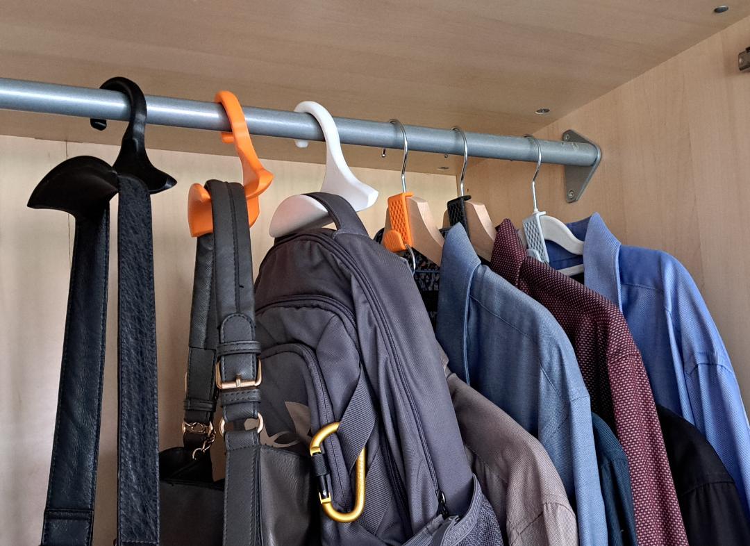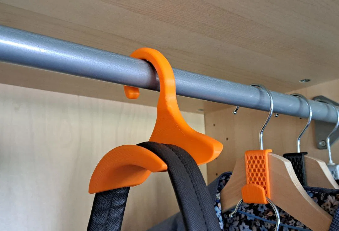 Bag Coat Hanger giúp gọn tủ đồ và bộ sưu tập túi xách trong nhà. Thiết kế self-supporting, in supportfree nếu đặt đúng hướng như hình. File STL đính kèm là bản cam/đen tối ưu vật liệu.