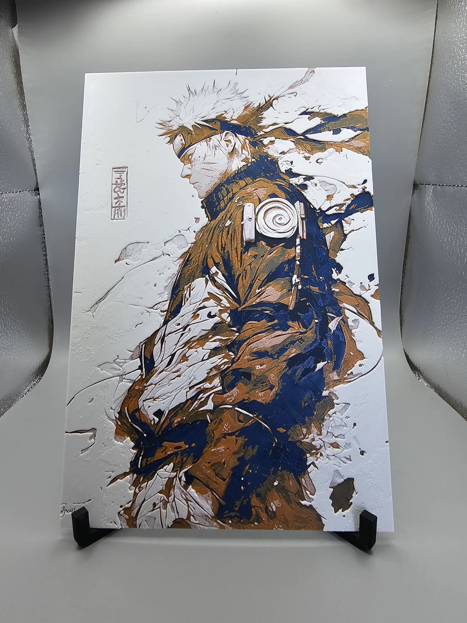 Naruto HueForge: in 100% infill, layer height 0.08mm và base layer 0.16mm. Có hướng dẫn đổi màu theo từng layer (Charcoal Black → Blue → Orange → White) để ra đúng hiệu ứng HueForge.
