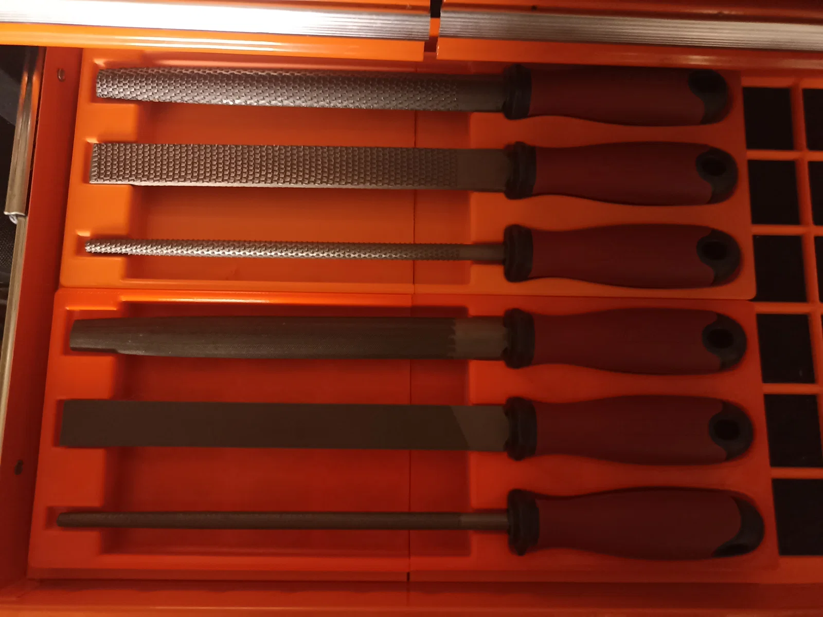 Việc sử dụng khay in 3D này giúp anh em dễ dàng tìm thấy chính xác loại dũa mình cần mà không phải bới tung cả hộp đồ. Thiết kế khay ôm sát thân dũa, giữ cho các lưỡi dũa không bị va chạm vào nhau, từ đó bảo vệ tuổi thọ của dụng cụ được lâu bền hơn. Đây là món phụ kiện không thể thiếu cho những anh em yêu thích sự ngăn nắp, chỉn chu trong góc làm việc của mình.